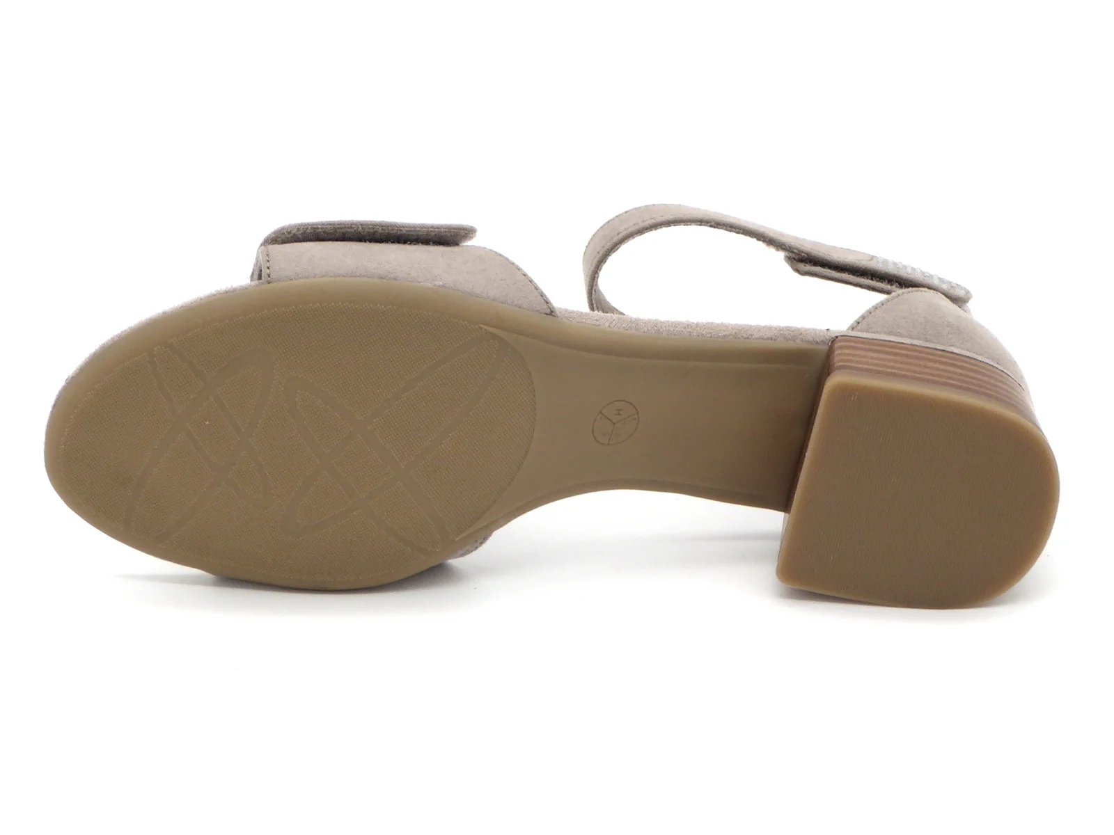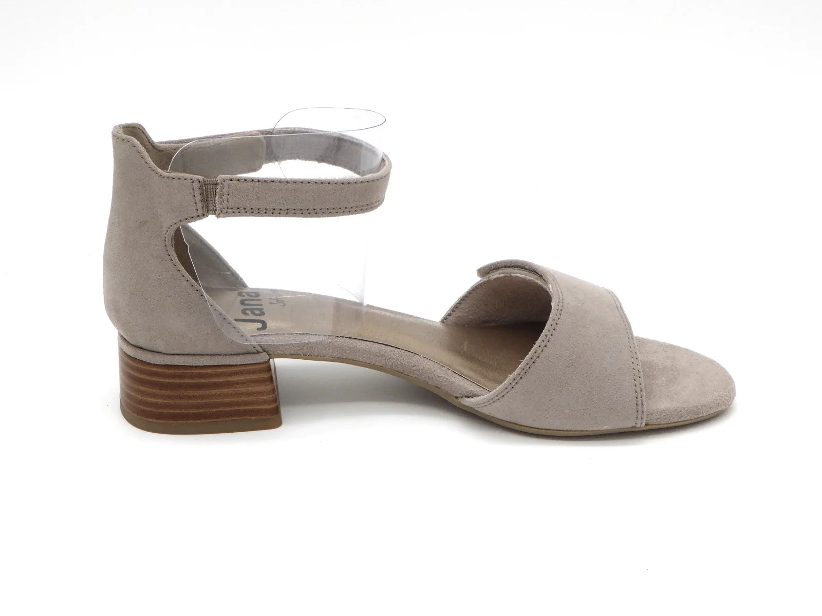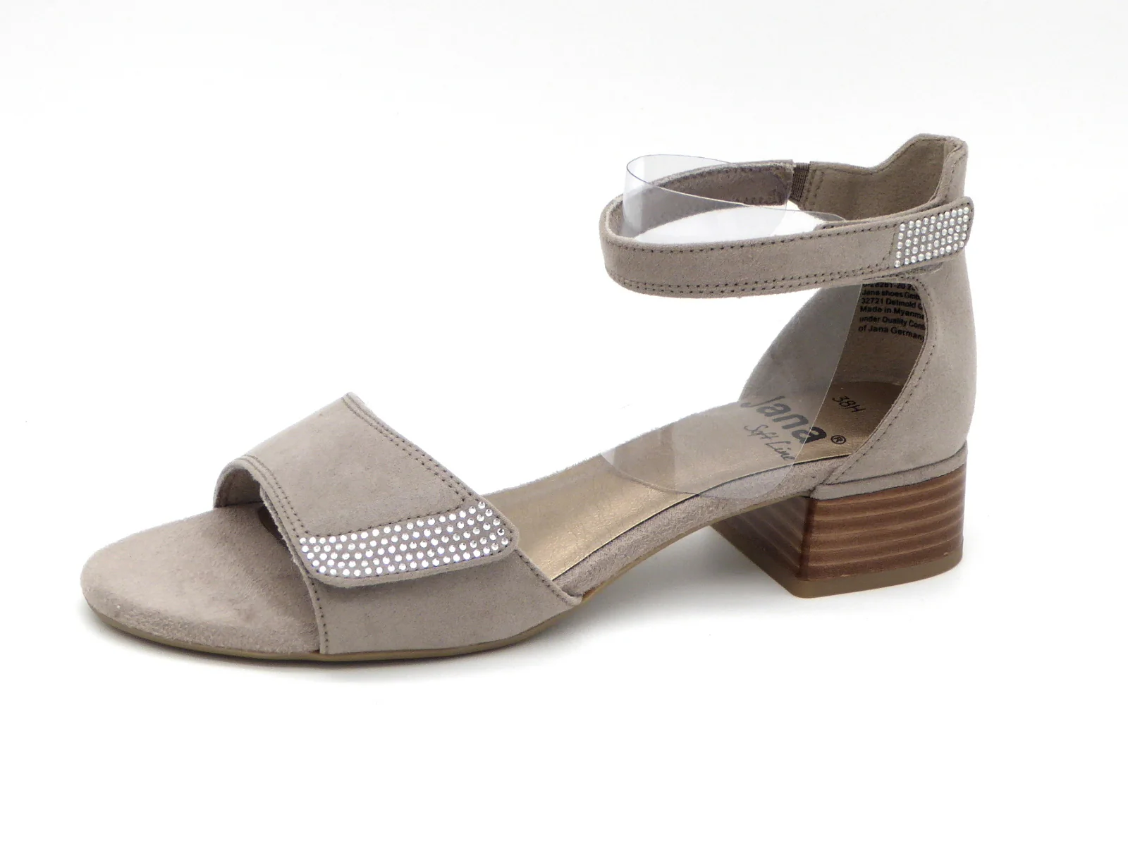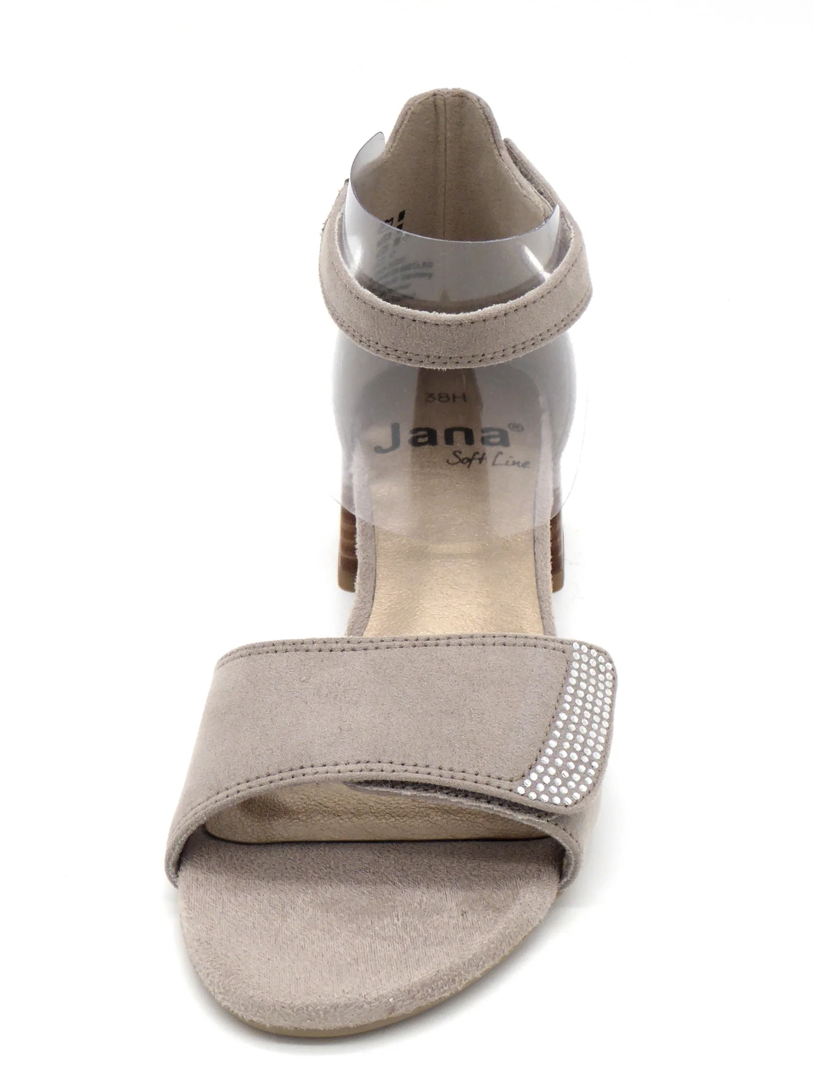 Jana modische sandalette uit de Softline serie, uitgevoerd in suèdine (textiel). De sandalette heeft een klittenbandsluiting op de voorvoet en bij de gesloten hiel een enkelbandje met klittenbandsluiting. De voering is van textiel evenals het voetbed, dat niet uitneembaar is. Diverse onderdelen van deze schoen bevatten gerecycled PET flessen. Deze sandalette is gemaakt in wijdte H en heeft een hakhoogte van 40 mm.