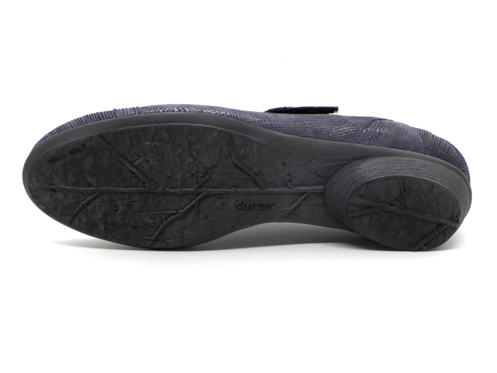 Durea comfortabele bandschoen met een bovenwerk gemaakt van leer met een subtiel glimmertje. De schoen heeft een band met klittenbandsluiting over de wreef. Deze biedt support en is verstelbaar, waardoor de schoen de voet altijd goed omsluit. De voering is van leer en de schoen heeft een zeer goed en comfortabel uitneembaar voetbed, dus ook geschikt voor losse inlegzolen. Dit model is gemaakt in een brede leest wijdte K (leest 018). De PTU-loopzool met lage hak is lichtgewicht, flexibel en gripvast door het profiel met speels bladmotief. En dankzij de combinatie van stabiliteit en sublieme demping in de zool, ben jij optimaal in balans bij elke stap of draai.