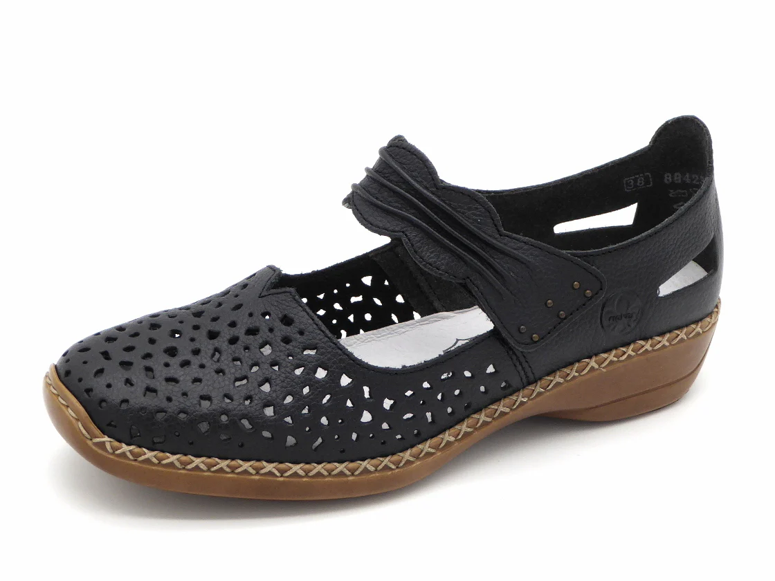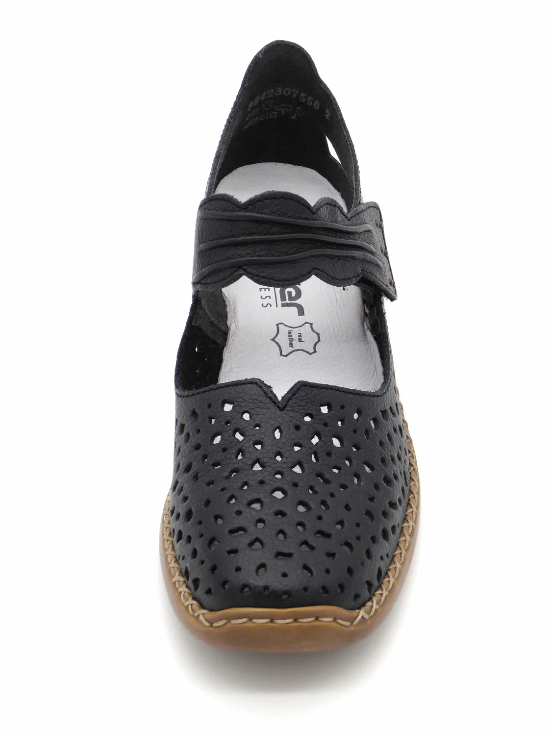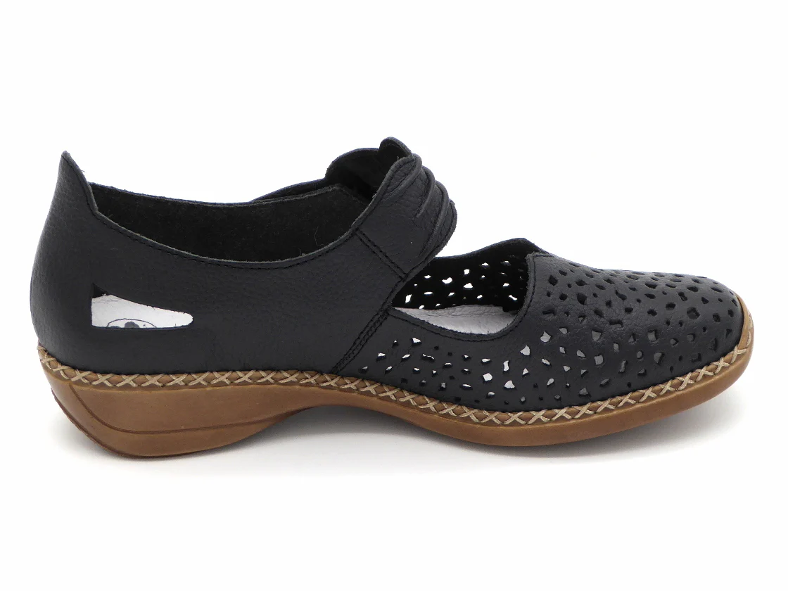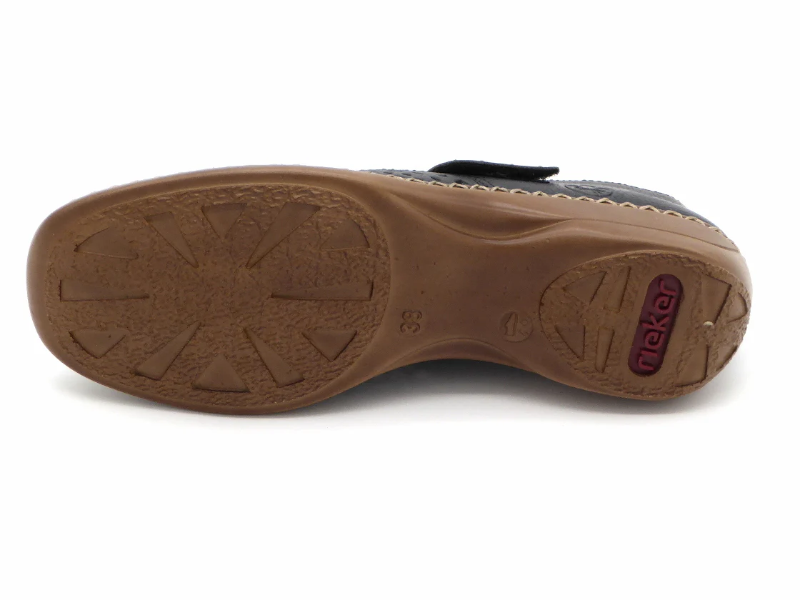 Rieker dames bandschoen, uitgevoerd in leer met decoratieve perforaties wat een zomerse look geeft. De band over de wreef is te verstellen met klittenband. De voering is van synthetisch materiaal en de binnenzool van leer en niet uitneembaar. Door het ingebouwde anti-stress systeem heeft deze Rieker bandschoen een uitstekende comfort, flexibiliteit en schokdemping. De bandschoen heeft een PU-zool met een hakhoogte van 3 cm.