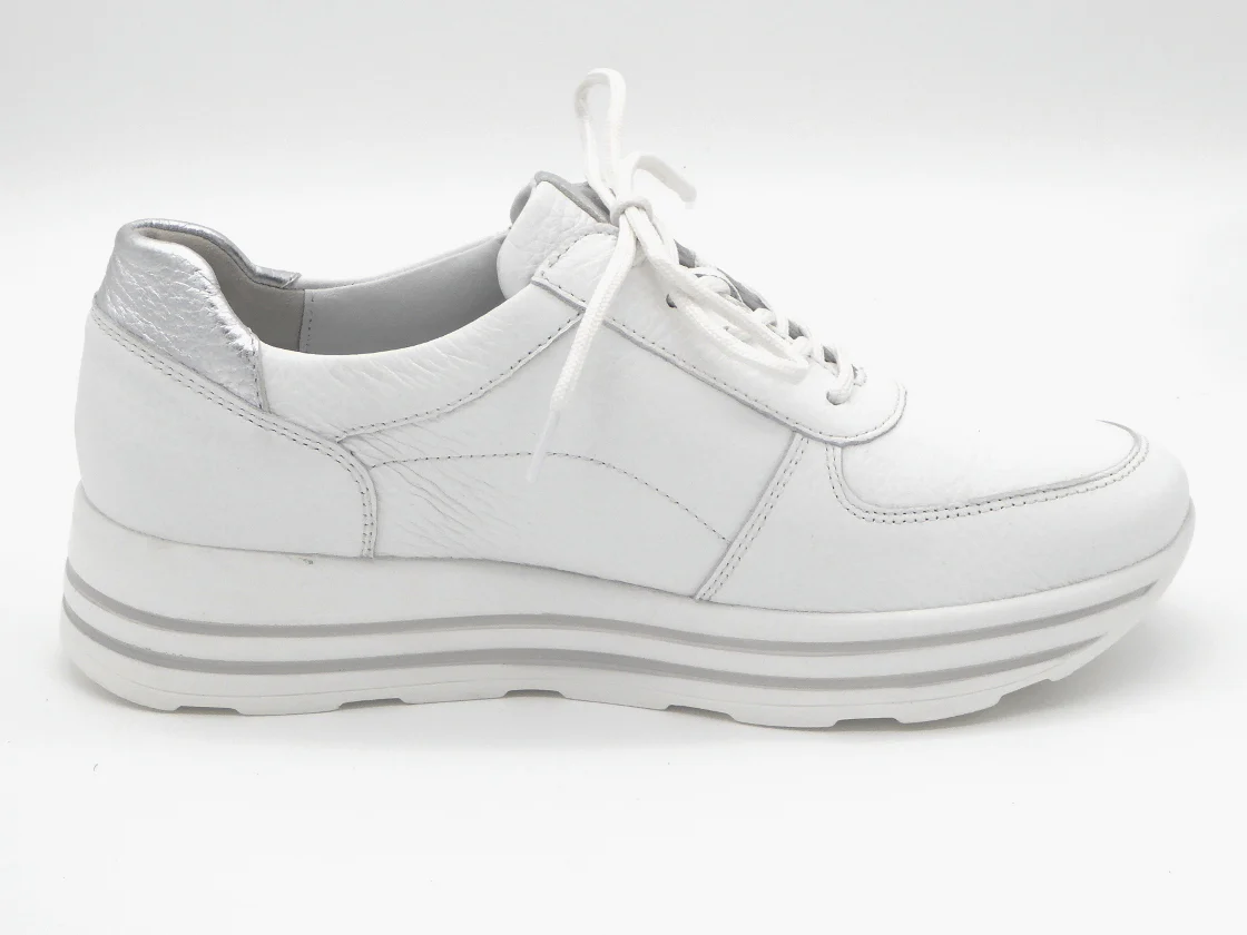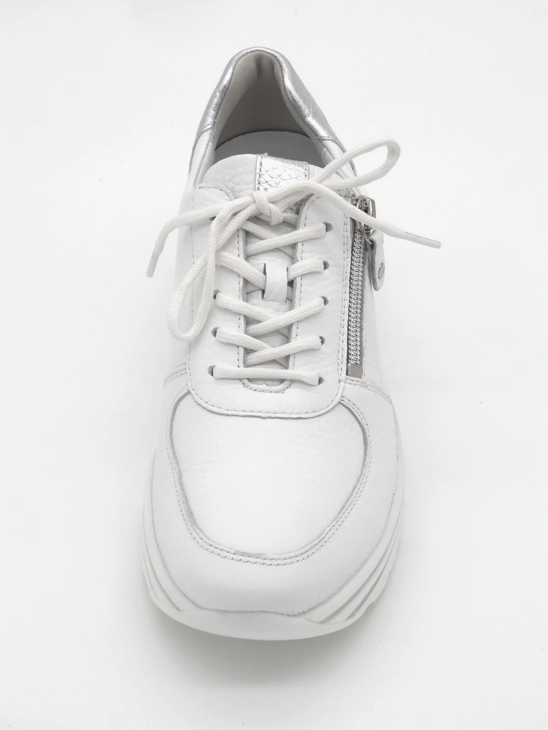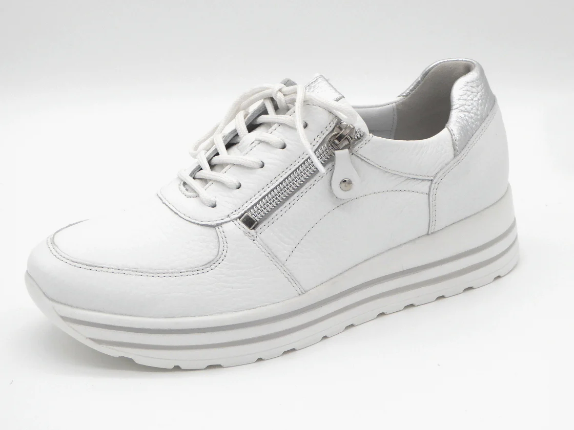 Deze dames sneaker heeft een vetersluiting en een rits voor een extra ruime instap. De voering is een combinatie van leer en textiel. De schoen heeft een uitneembaar leren voetbed, dus ook geschikt voor losse inlegzolen. Dit model is gemaakt in een iets bredere leest wijdte H (leest H-Lena). De vorm van de witte lichtgewicht loopzool zorgt voor een prettige afwikkeling.