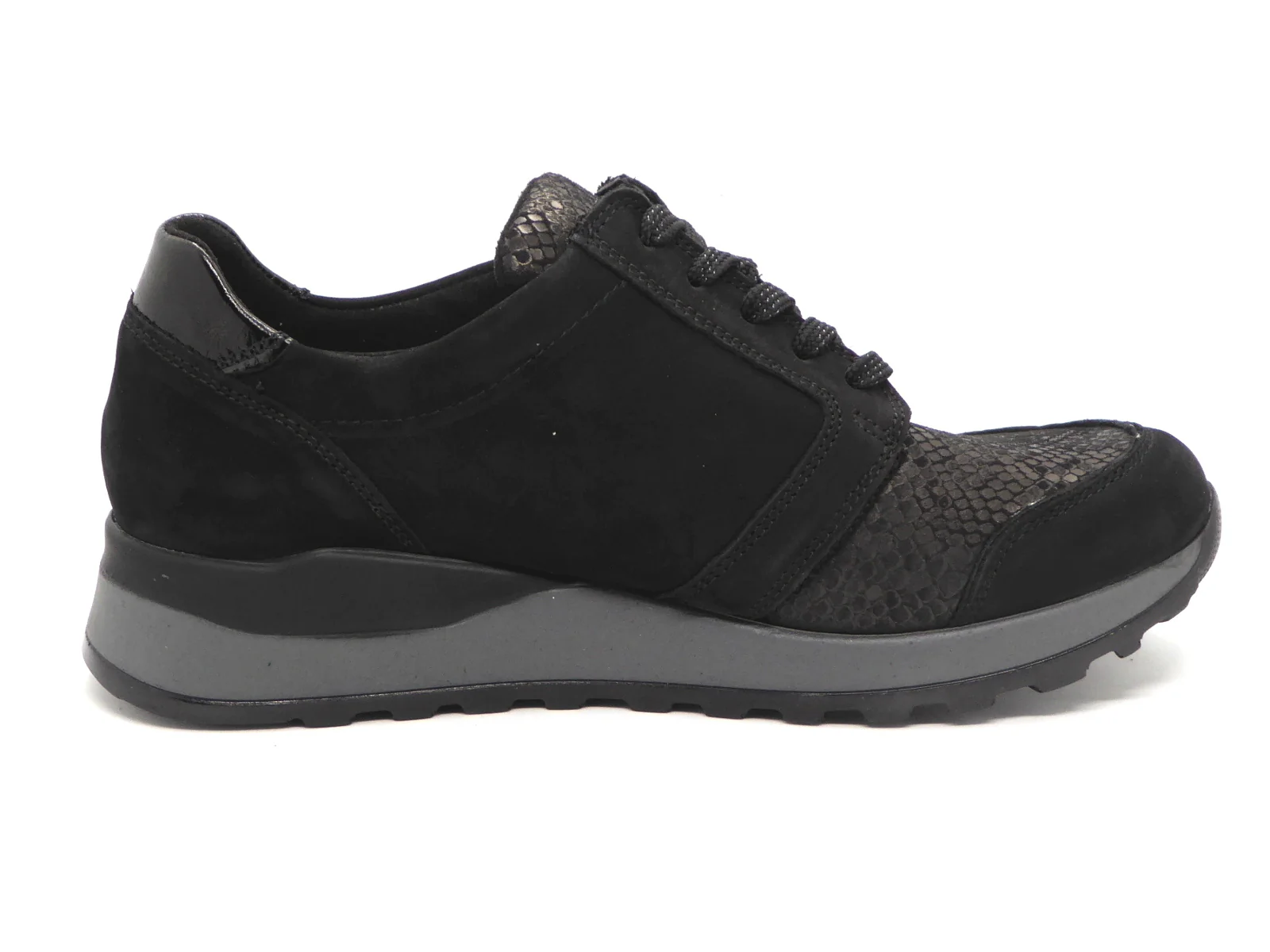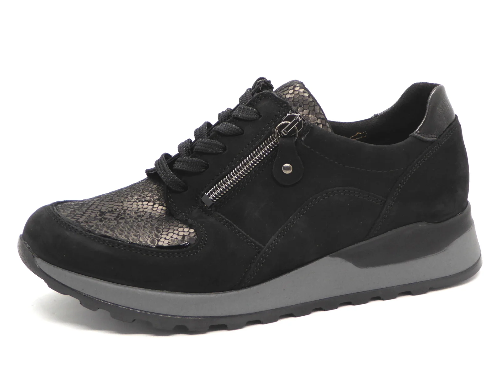 Waldläufer comfortabele dames sneaker uit de serie OrthoTritt (Soft) met vetersluiting en een rits voor een extra ruime instap. Het bovenwerk is zwart nubuck, gecombineerd met stretch in een subtiele print. Door het rekbaar stretch bovenmateriaal is deze sneaker ideaal voor voetproblemen zoals hallux valgus, hamertenen en andere knobbels. Het zit en loopt fantastisch! De schoen heeft een zachte voering van textiel en een uitneembaar leren voetbed, dus ook geschikt voor eigen (steun) zolen. Dit model is gemaakt in een iets bredere leest wijdte H (leest Hiroko-Soft). De PU loopzool geeft goede demping en draagt bij aan een geweldig loopcomfort! Een ideale schoen voor een gevoelige voet.