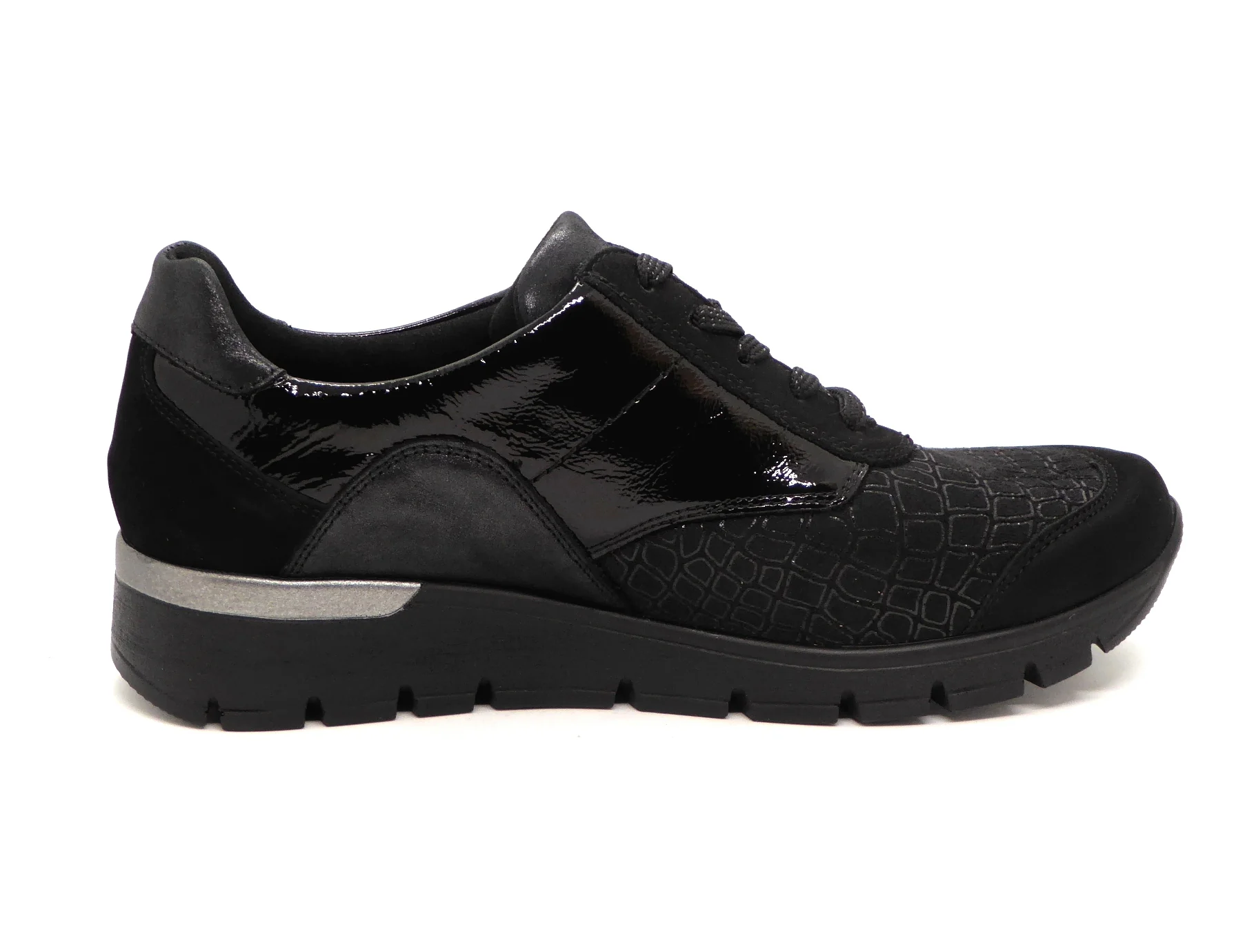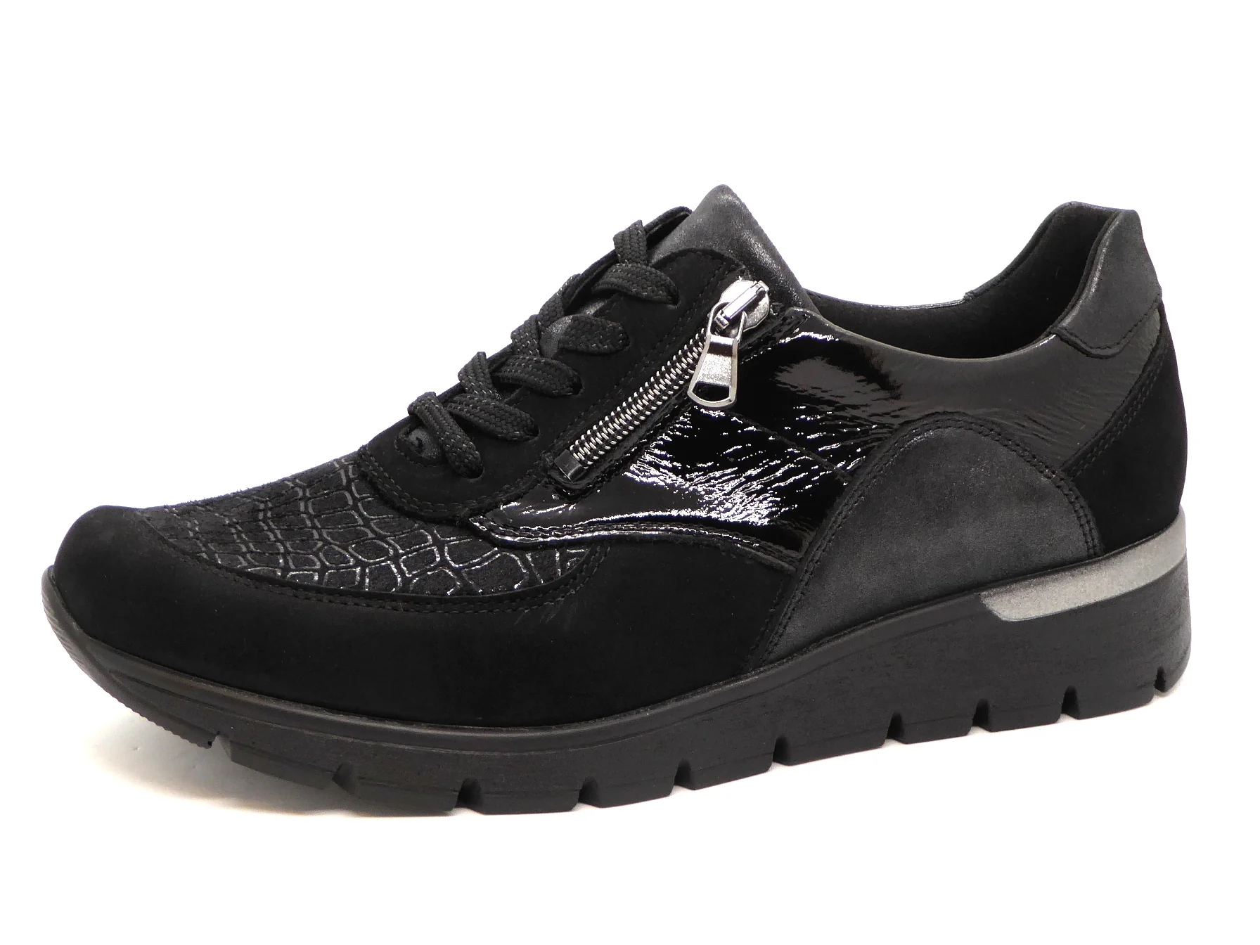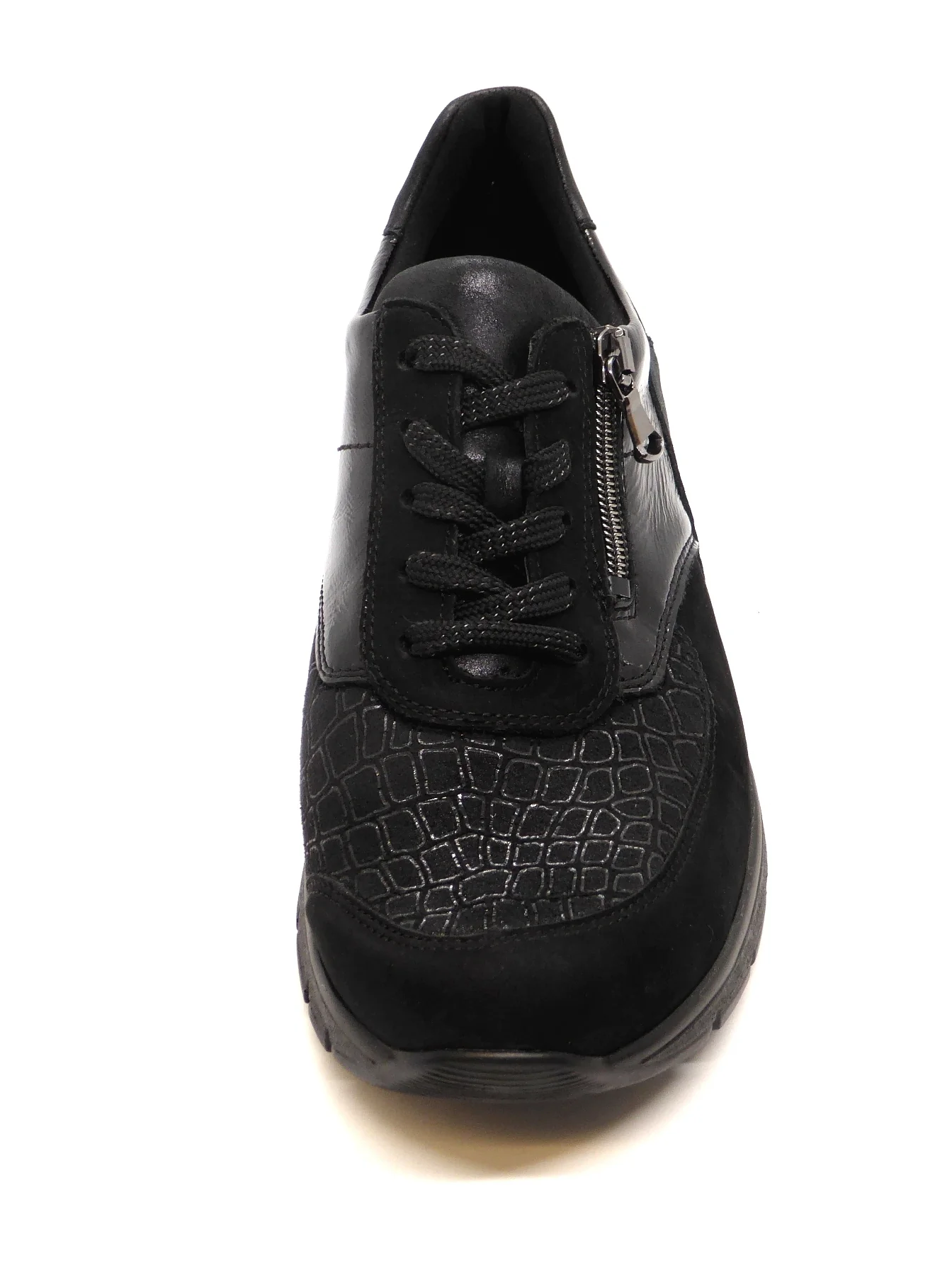 Waldläufer comfortabele dames sneaker uit de serie OrthoTritt (Soft) uitgevoerd in een combinatie van nubuck en stretch materiaal. Door het rekbaar stretch bovenmateriaal is deze sneaker ideaal voor voetproblemen zoals hallux valgus, hamertenen en andere knobbels. De sneaker heeft een vetersluiting en een ritssluiting die je extra instapruimte geeft. De voering is van textiel. De schoen heeft een uitneembaar voetbed, dus ook geschikt voor losse inlegzolen. Dit model is gemaakt in een brede leest wijdte K (leest K-Ramona). De hak bestaat uit een doorlopend vlak.