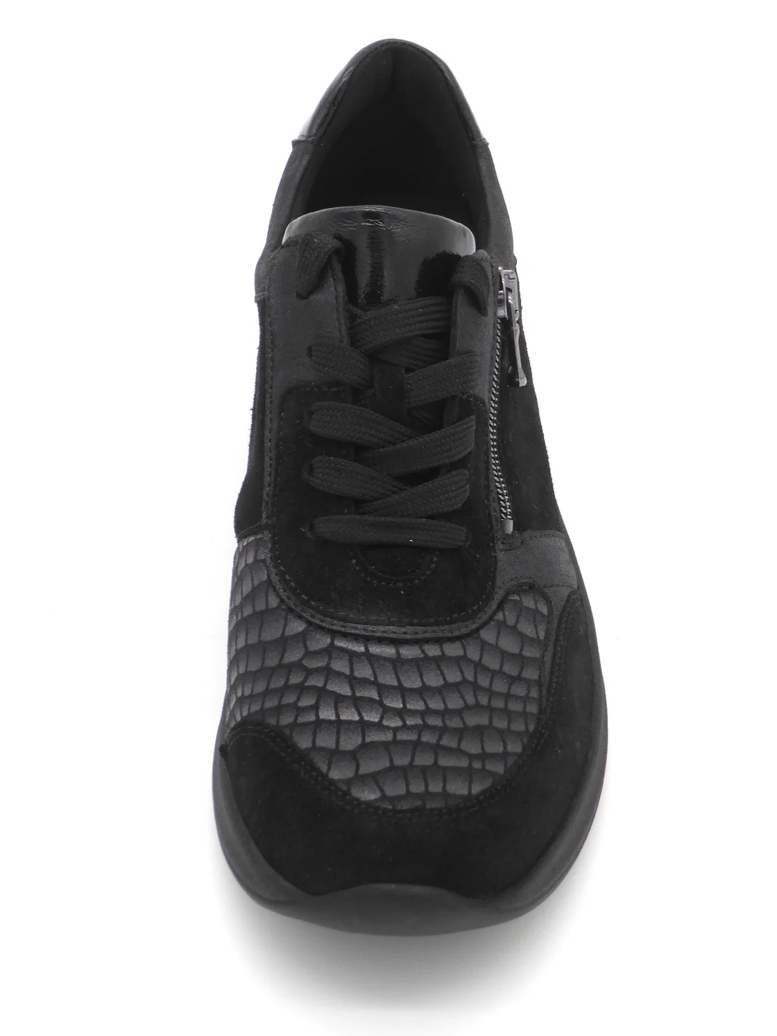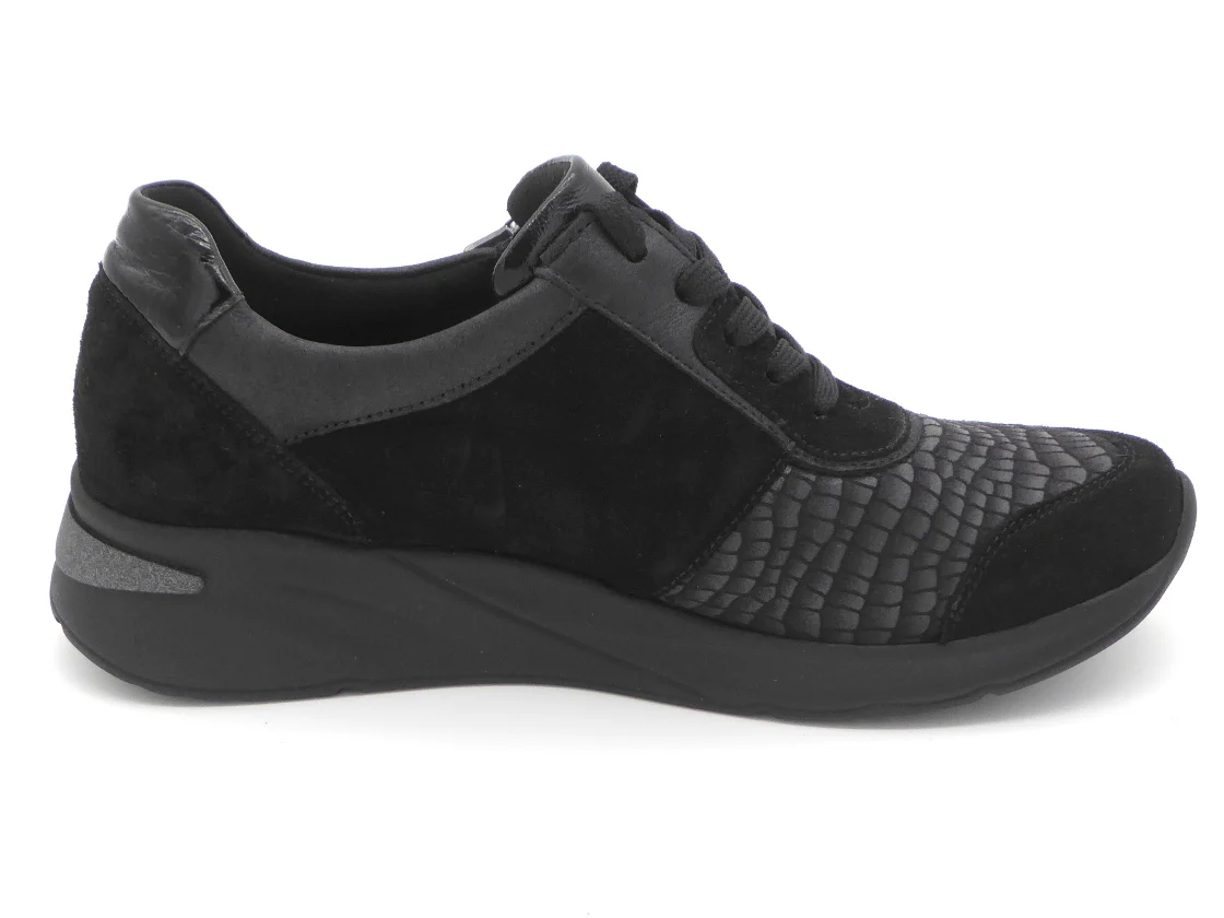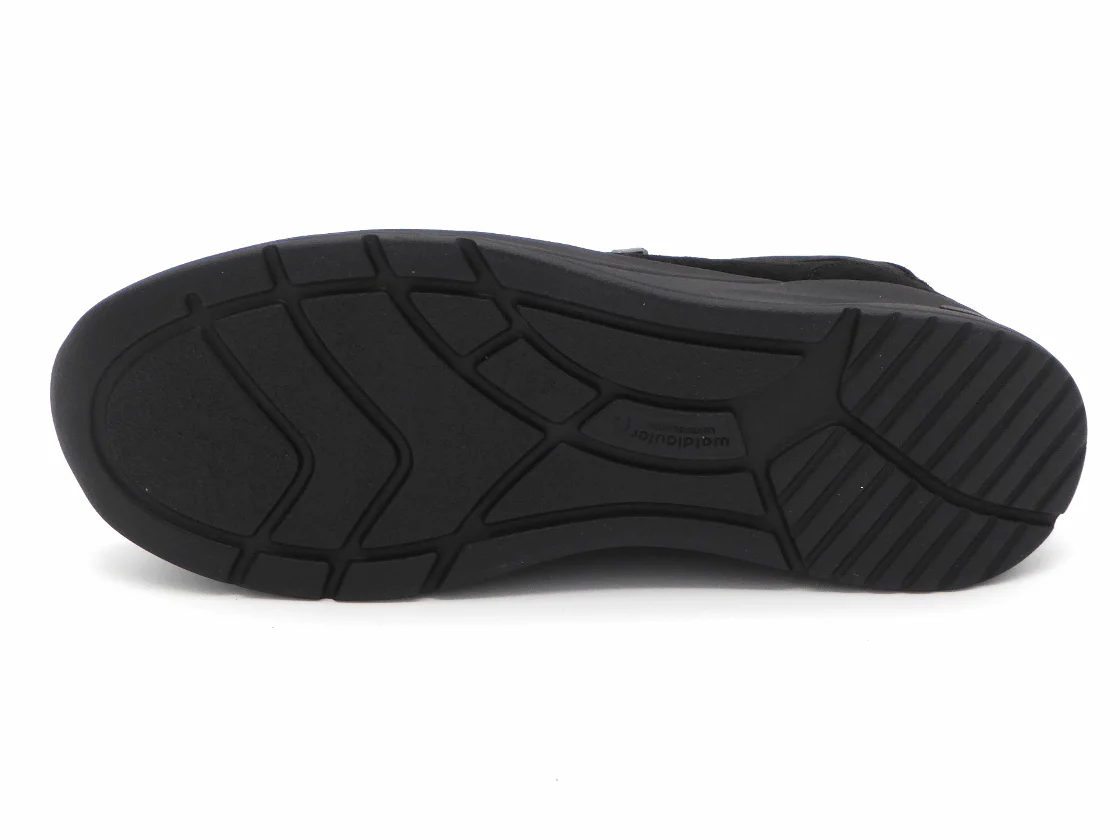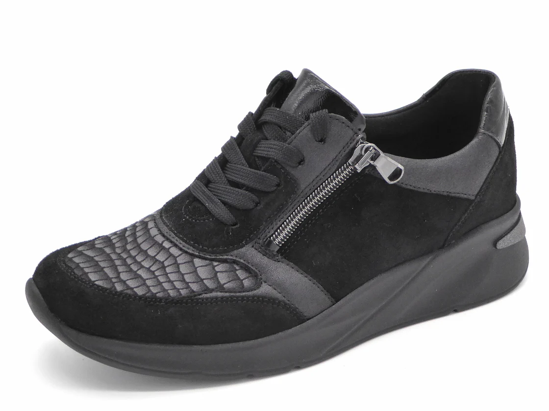 Waldläufer comfortabele damesschoen uit de serie OrthoTritt (Soft) uitgevoerd in een combinatie van nubuck leer en stretch materiaal. Door het rekbaar stretch bovenmateriaal is deze schoen ideaal voor voetproblemen zoals hallux valgus, hamertenen en andere knobbels. De veters en de rits zorgen ervoor dat de schoen eenvoudig aan- en uit kan worden getrokken en biedt de voet stevigheid. De binnenkant van de schoen is uitgerust met synthetisch textiel. De schoen heeft een uitneembaar voetbed, dus ook geschikt voor losse inlegzolen. Dit model is gemaakt in een een iets brede leest wijdte H (leest H-Dilara). De PU-zool heeft een hakhoogte van ongeveer 4 cm.