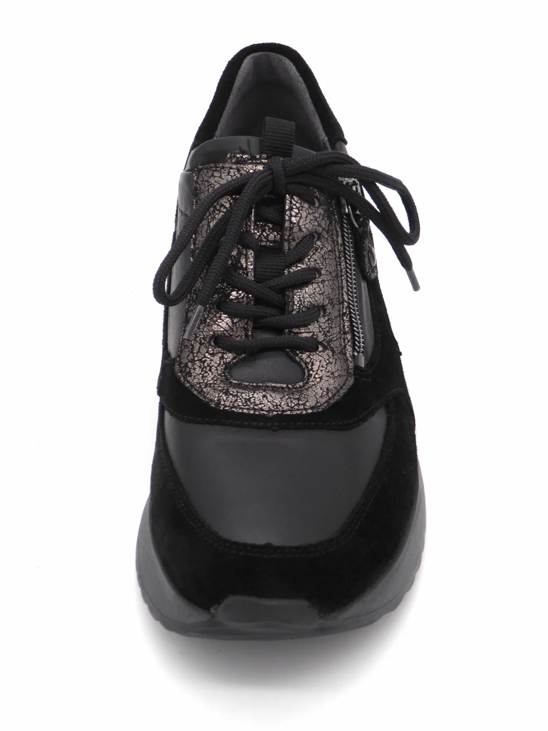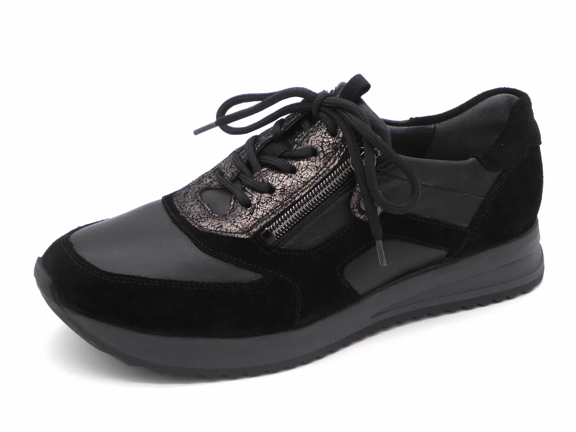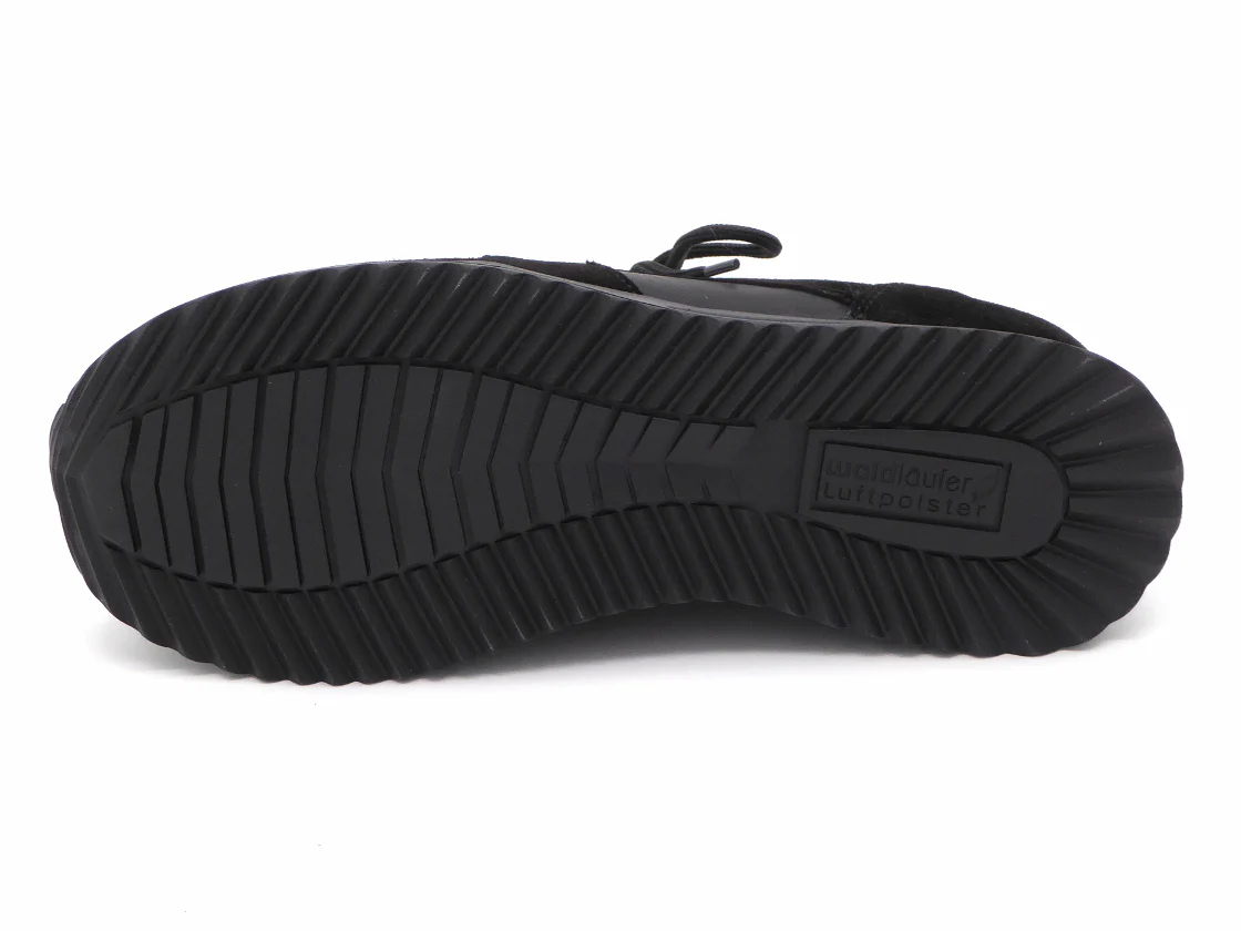 Waldläufer comfortabele dames sneaker uitgevoerd in een mix van materialen, zoals leer, nubuck en printleer. De veters en de rits zorgen ervoor dat de schoen eenvoudig aan- en uit kan worden getrokken en biedt de voet stevigheid. De voering is een combinatie van leder en textiel. De schoen heeft een uitneembaar voetbed dat, indien nodig, vervangen kan worden door losse inlegzolen. Dit model is gemaakt in een iets bredere leest wijdte H (leest H-Vicky) en heeft een rubberen zool voor een optimale grip.