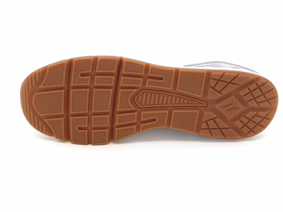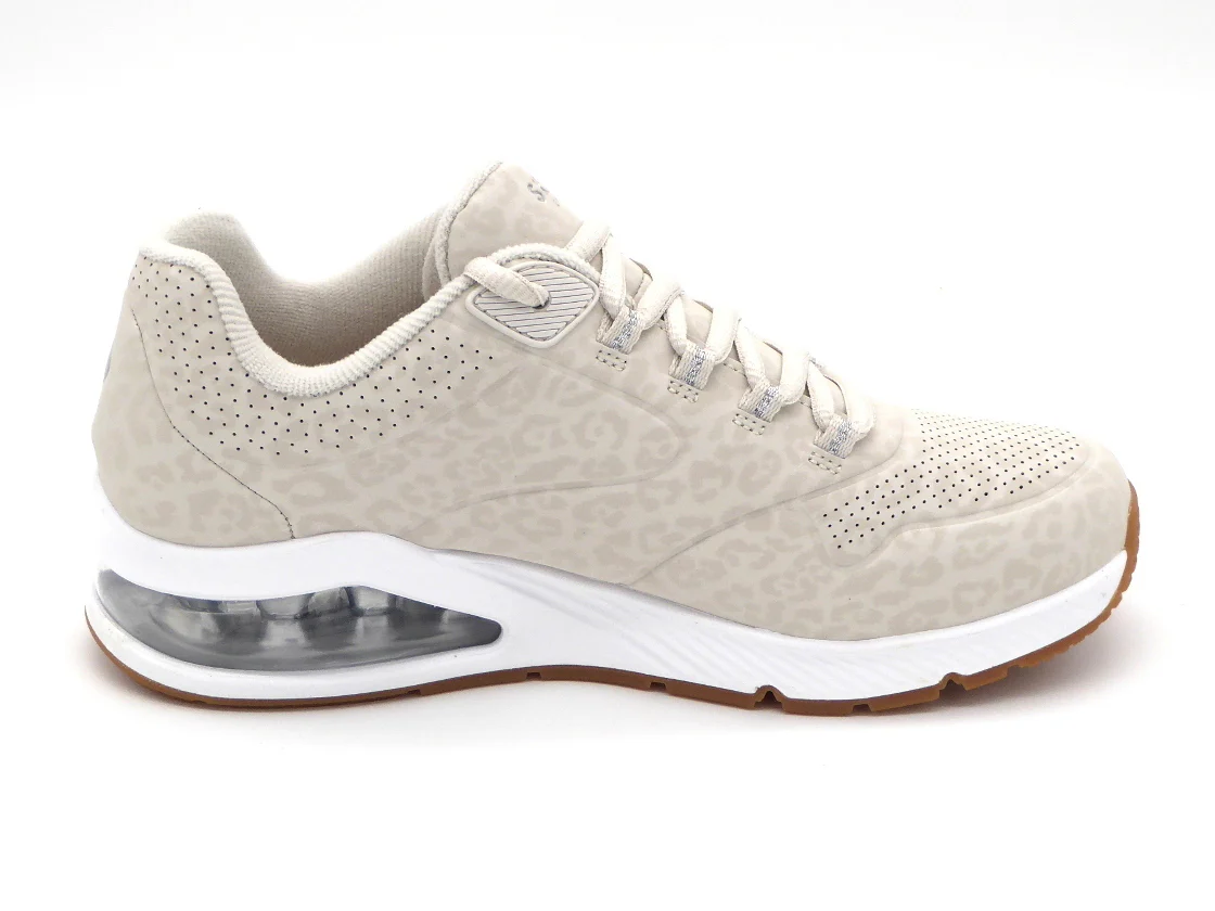 De trendy sneaker van Skechers Uno 2-In-Kat-Neato heeft een soepele bovenkant van geperforeerd synthetisch materiaal. met luipaardprint. De comfortabele binnenzool en de voering zijn gemaakt van textiel. De sneaker wordt gesloten door middel van een vetersluiting. Dankzij het dempende voetbed met Air-Cooled Memory Foam loopt de veterschoen extra comfortabel. Ook heeft dit voetbed een ventilerende werking. De perforaties op het bovenwerk zorgen voor een verkoelend effect. De tussenzool is voorzien van een een zichtbare Skech-Air®-airbag en biedt daardoor uitstekende ondersteuning en schokdemping bij iedere stap. De rubberen zool is flexibel en biedt veel grip. De Skechers Uno 2 sneaker heeft een vast voetbed.