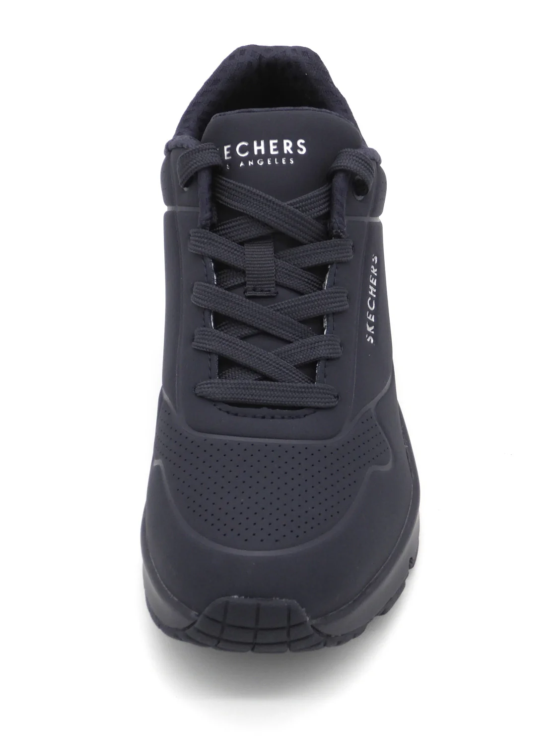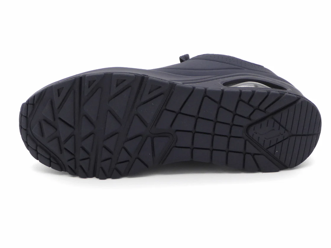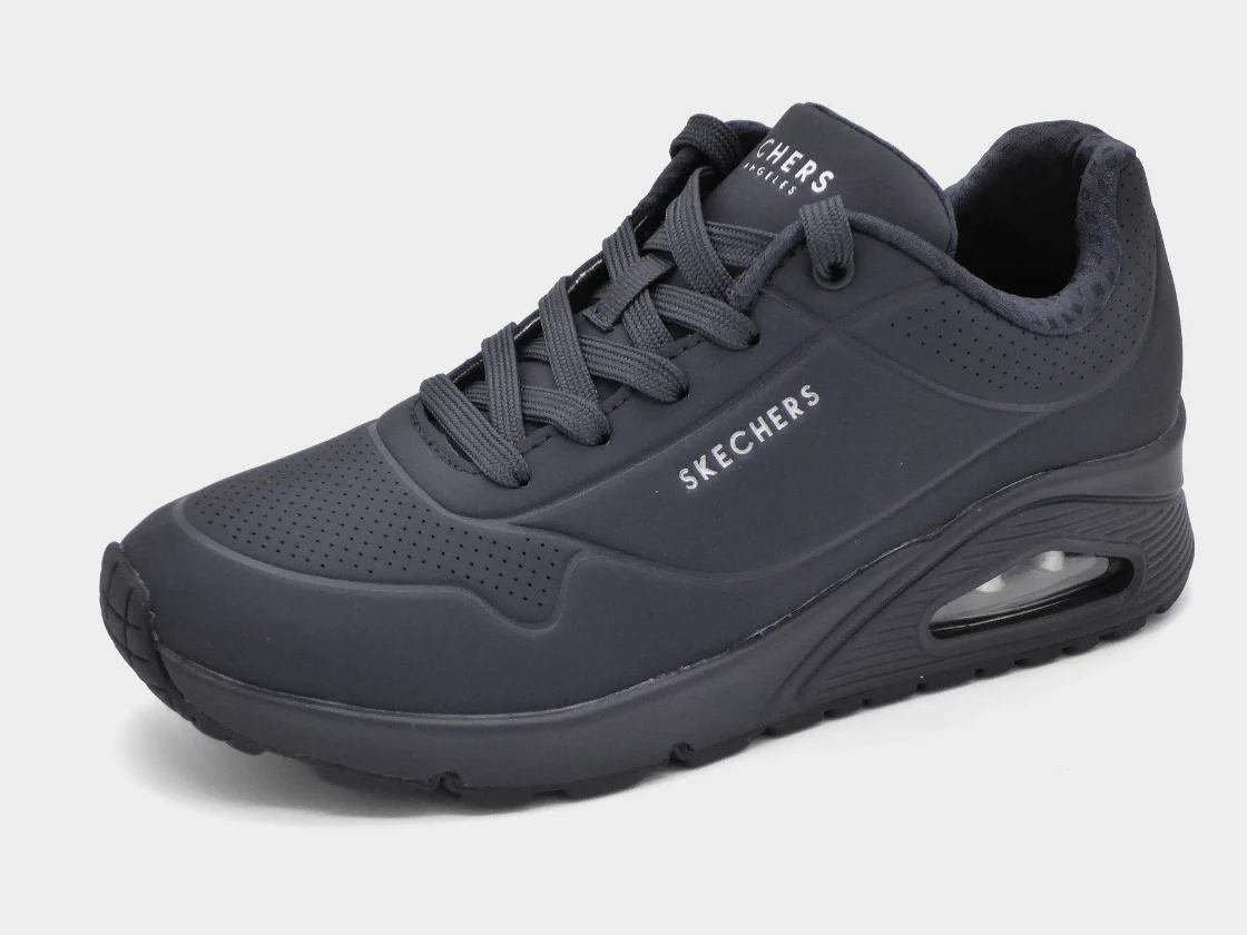 De trendy sneaker van Skechers Uno Stand On Air heeft een soepele bovenkant van geperforeerd synthetisch materiaal. De comfortabele binnenzool en de voering zijn gemaakt van textiel. De sneaker wordt gesloten door middel van een vetersluiting. Dankzij het dempende voetbed met Air-Cooled Memory Foam loopt de veterschoen extra comfortabel. Ook heeft dit voetbed een ventilerende werking. De perforaties op het bovenwerk zorgen voor een verkoelend effect. De tussenzool is voorzien van een een zichtbare Skech-Air®-airbag en biedt daardoor uitstekende ondersteuning en schokdemping bij iedere stap. De rubberen zool is flexibel en biedt veel grip. De Skechers Uno Stand On Air sneaker heeft een vast voetbed.