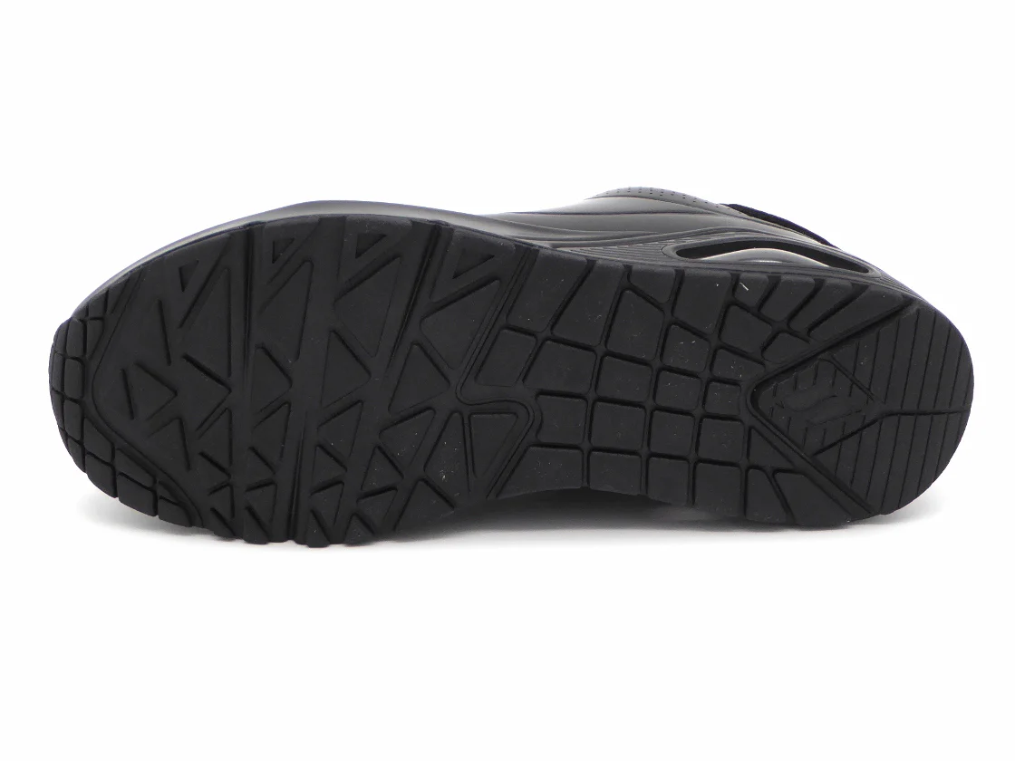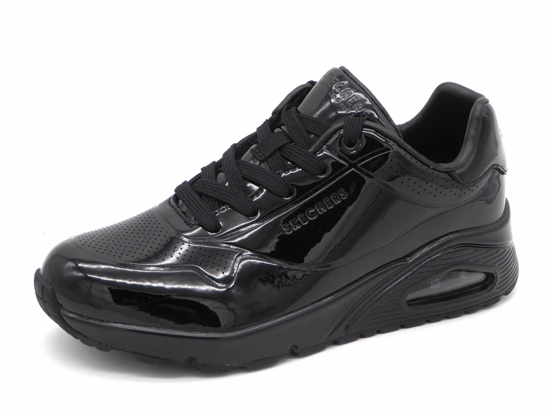 De trendy sneaker van Skechers Uno Stand On Air heeft een soepele bovenkant van geperforeerd synthetisch lakleer. De comfortabele binnenzool en de voering zijn gemaakt van textiel. De sneaker wordt gesloten door middel van een vetersluiting. Dankzij het dempende voetbed met Air-Cooled Memory Foam loopt de veterschoen extra comfortabel. Ook heeft dit voetbed een ventilerende werking. De perforaties op het bovenwerk zorgen voor een verkoelend effect. De tussenzool is voorzien van een luchtkussen en biedt daardoor uitstekende ondersteuning en schokdemping bij iedere stap. De rubberen zool is flexibel en biedt veel grip. De Skechers Uno Stand On Air sneaker heeft een vast voetbed.
