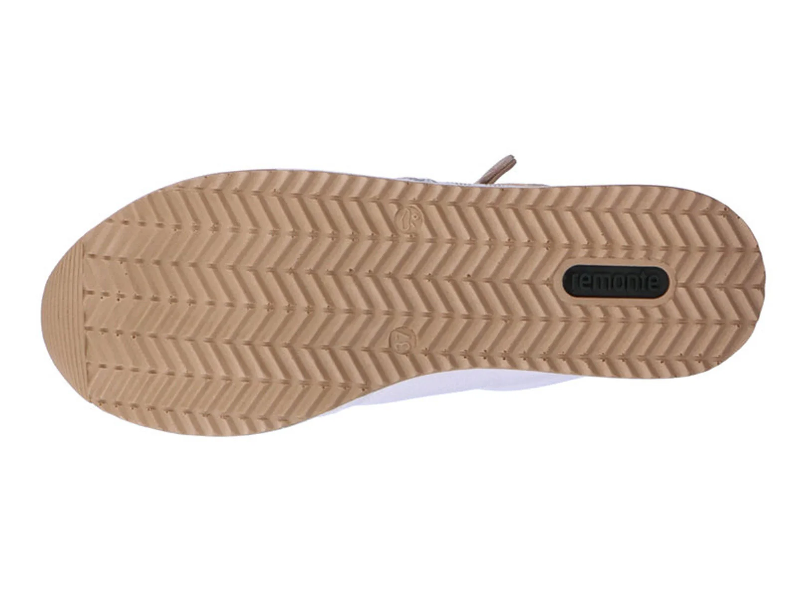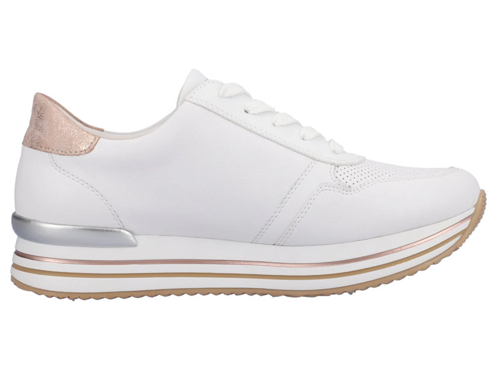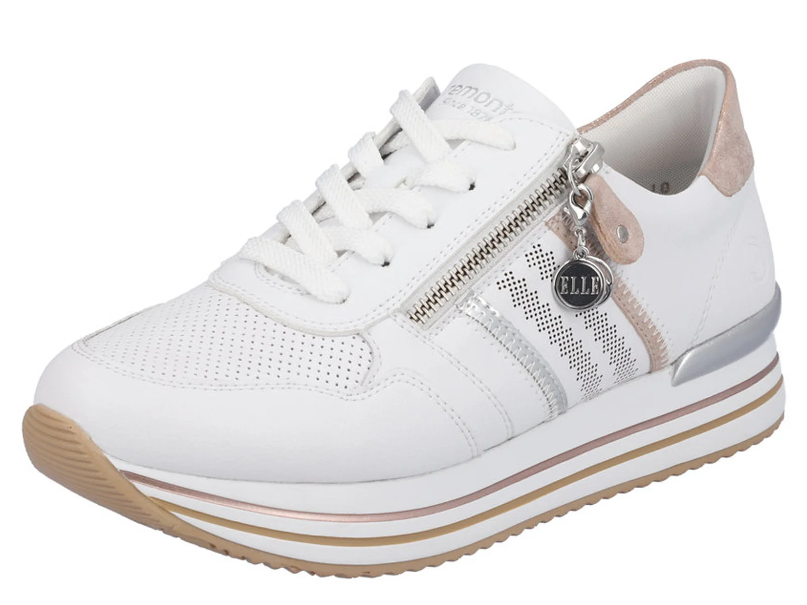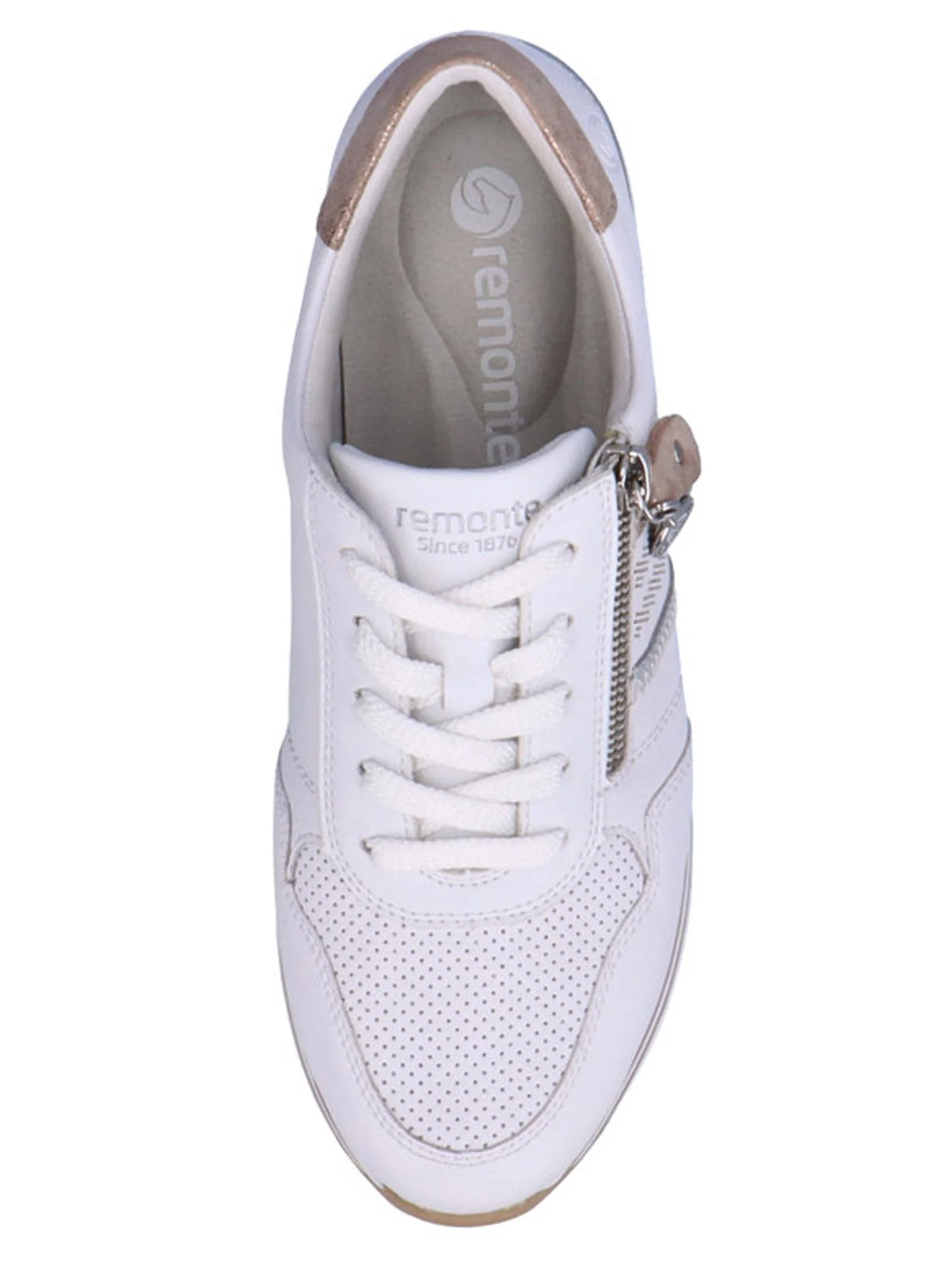 Moderne dames sneaker uit de Remonte Soft collectie, uitgevoerd in wit leder gecombineerd met gekleurde details als decoratie. De sneaker heeft een vetersluiting en aan de buitenzijde zit een handige rits voor het eenvoudig aan- en uittrekken van de schoen. De voering is van textiel. Het zachte uitneembare voetbed kan, indien nodig, vervangen worden door losse inlegzolen. Deze trendy maar toch zeer comfortabele sneaker heeft een comfortabele G-wijdte leest en staat op een dikke plateauzool van 3 cm dik.