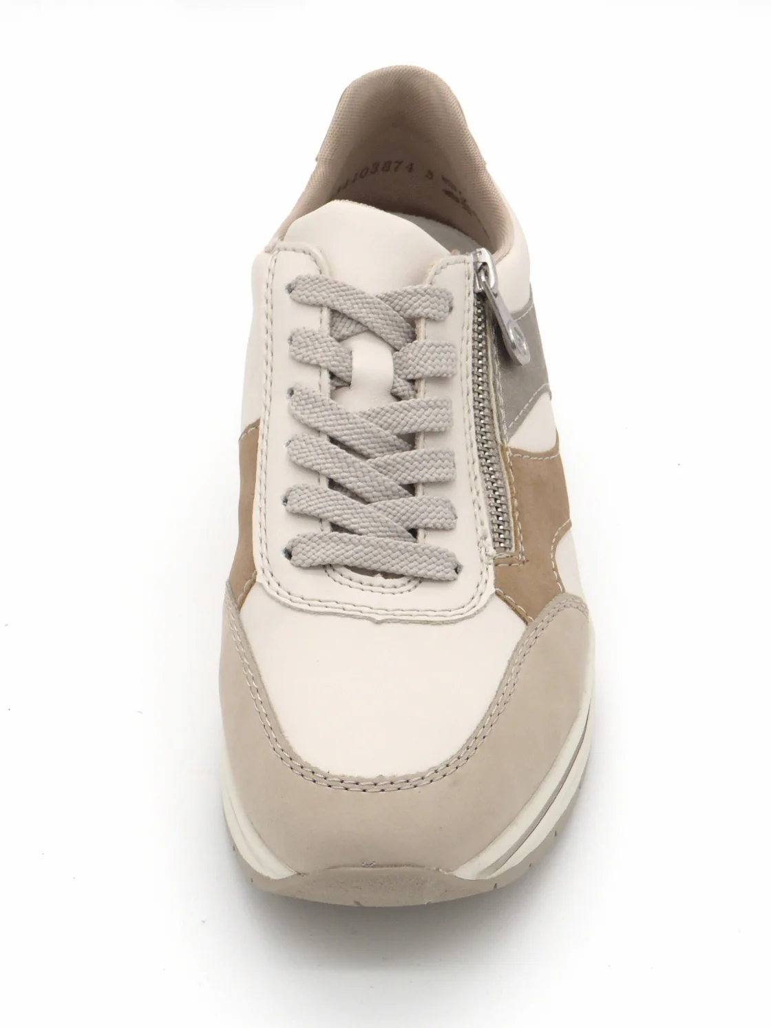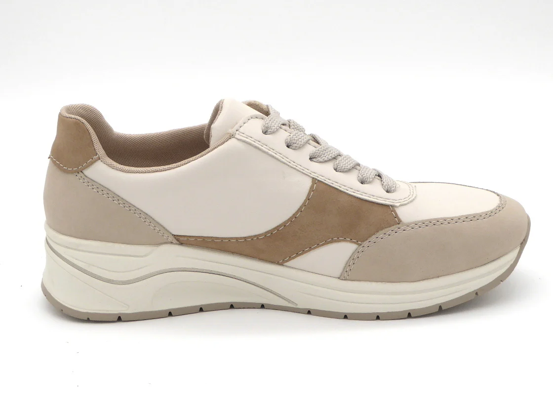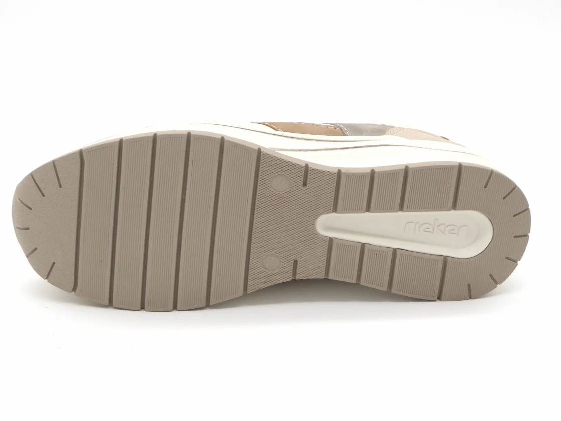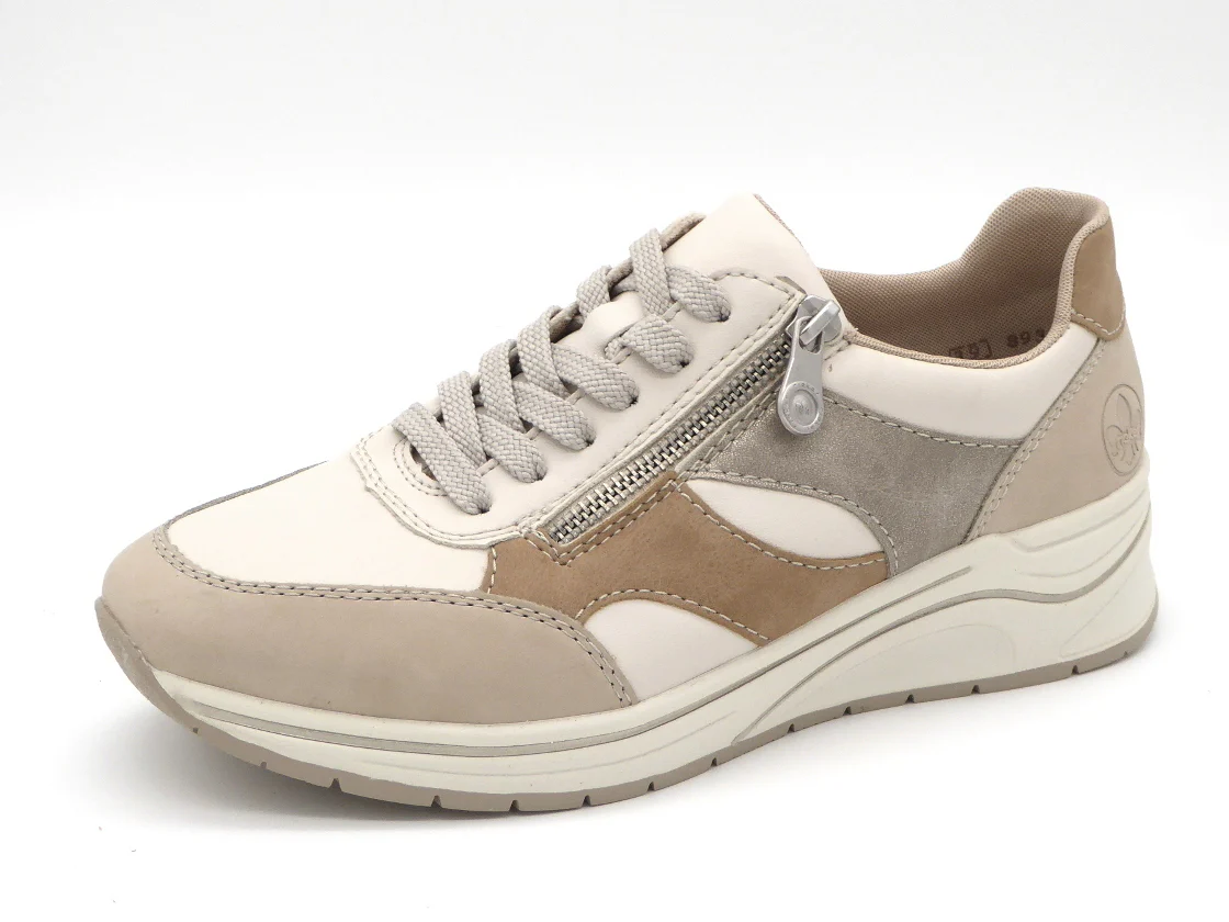Rieker sportieve dames sneaker uitgevoerd in imitatieleer met gekleurde details als decoratie. De sneaker heeft een vetersluiting én een rits, voor een makkelijke instap en een trendy look. De voering is van textiel en het voetbed is leer bekleed. Het voetbed is heerlijk zacht en uitneembaar, dus ook geschikt voor losse inlegzolen. Door het ingebouwde anti-stress systeem heeft deze schoen een uitstekende comfort, flexibiliteit en schokdemping. Met een trendy zool van lichtgewicht materiaal heb je een super fijn loopcomfort!