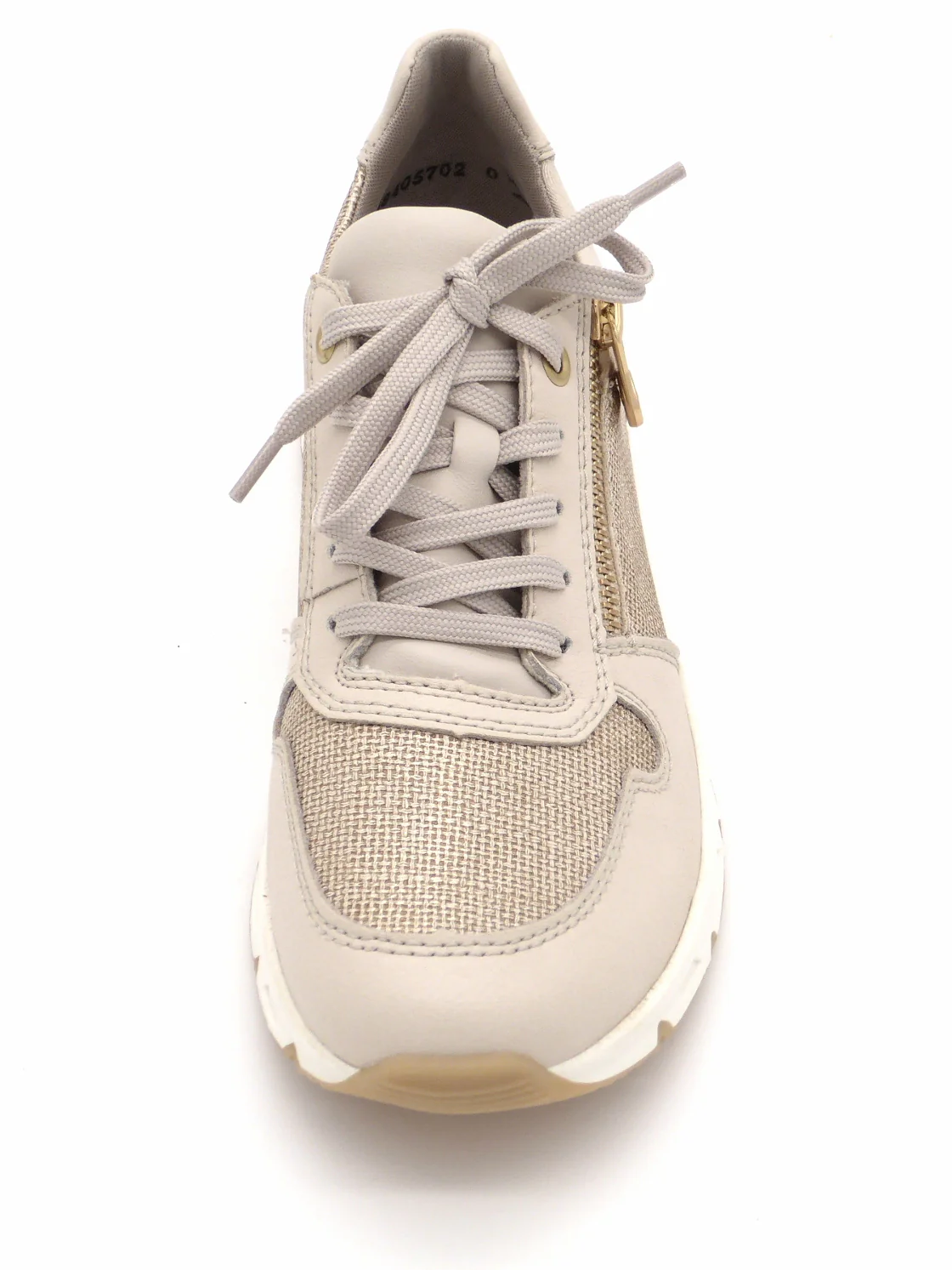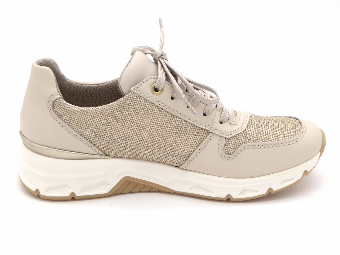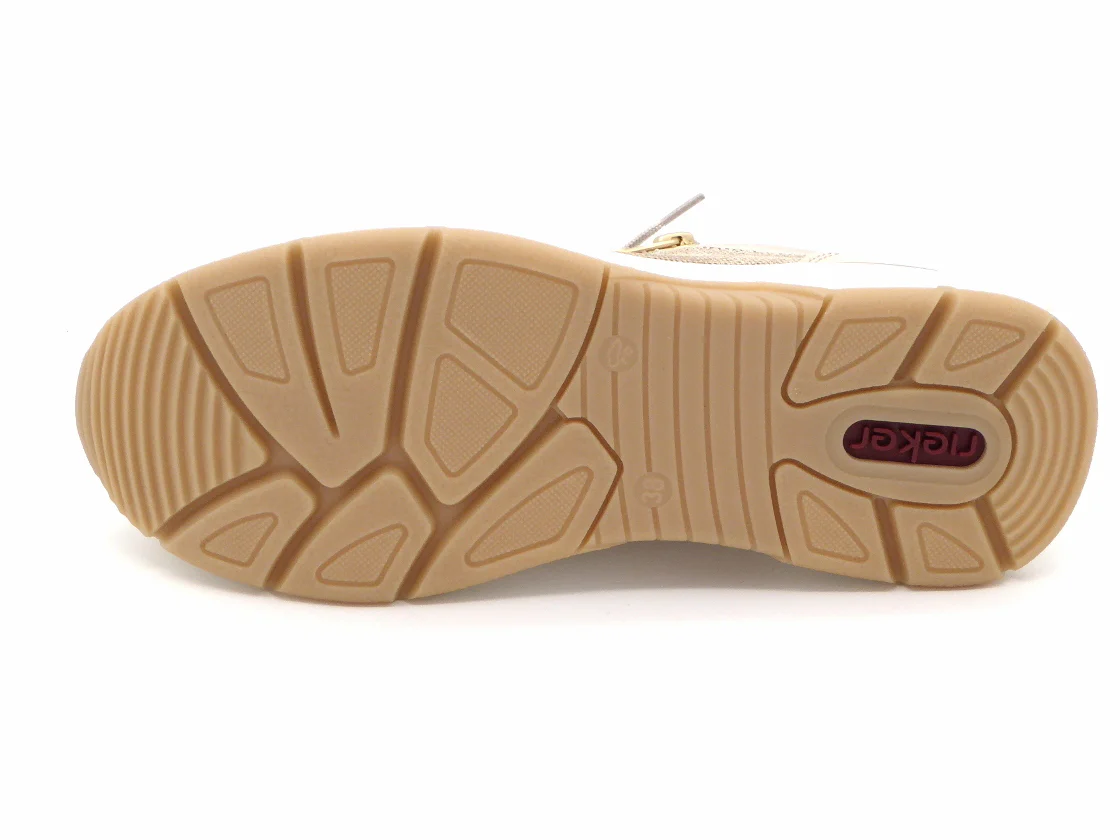 Rieker sportieve dames sneaker uitgevoerd in een combinatie van leer en imitatieleer met gekleurde details als decoratie. De sneaker heeft een vetersluiting én een rits, voor een makkelijke instap en een trendy look. De voering is van textiel en het voetbed is leer bekleed. Het voetbed is heerlijk zacht en uitneembaar, dus ook geschikt voor losse inlegzolen. Door het ingebouwde anti-stress systeem heeft deze schoen een uitstekende comfort, flexibiliteit en schokdemping. Met een trendy zool van lichtgewicht materiaal heb je een super fijn loopcomfort!