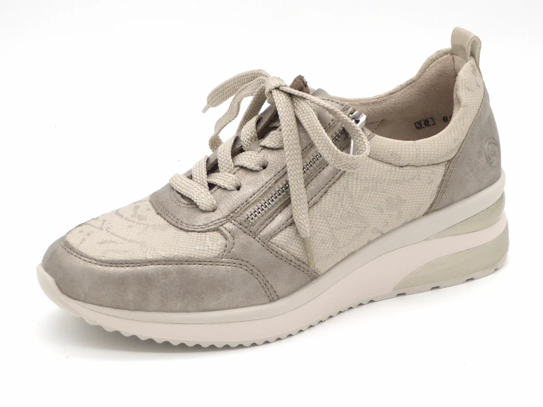 Comfortabele dames sneaker uit de Remonte Soft collectie, uitgevoerd in een combinatie van kunstleer en stretchmateriaal met een print. Door het rekbaar stretch bovenmateriaal is deze sneaker ideaal voor voetproblemen zoals hallux valgus, hamertenen en andere knobbels. De sneaker heeft een vetersluiting en een ritssluiting die je extra instapruimte geeft. De voering is van microvelours (textiel). Het zachte voetbed is uitneembaar, dus ook geschikt voor losse inlegzolen. De schoen heeft een lichtgewicht PU-zool met sleehak.