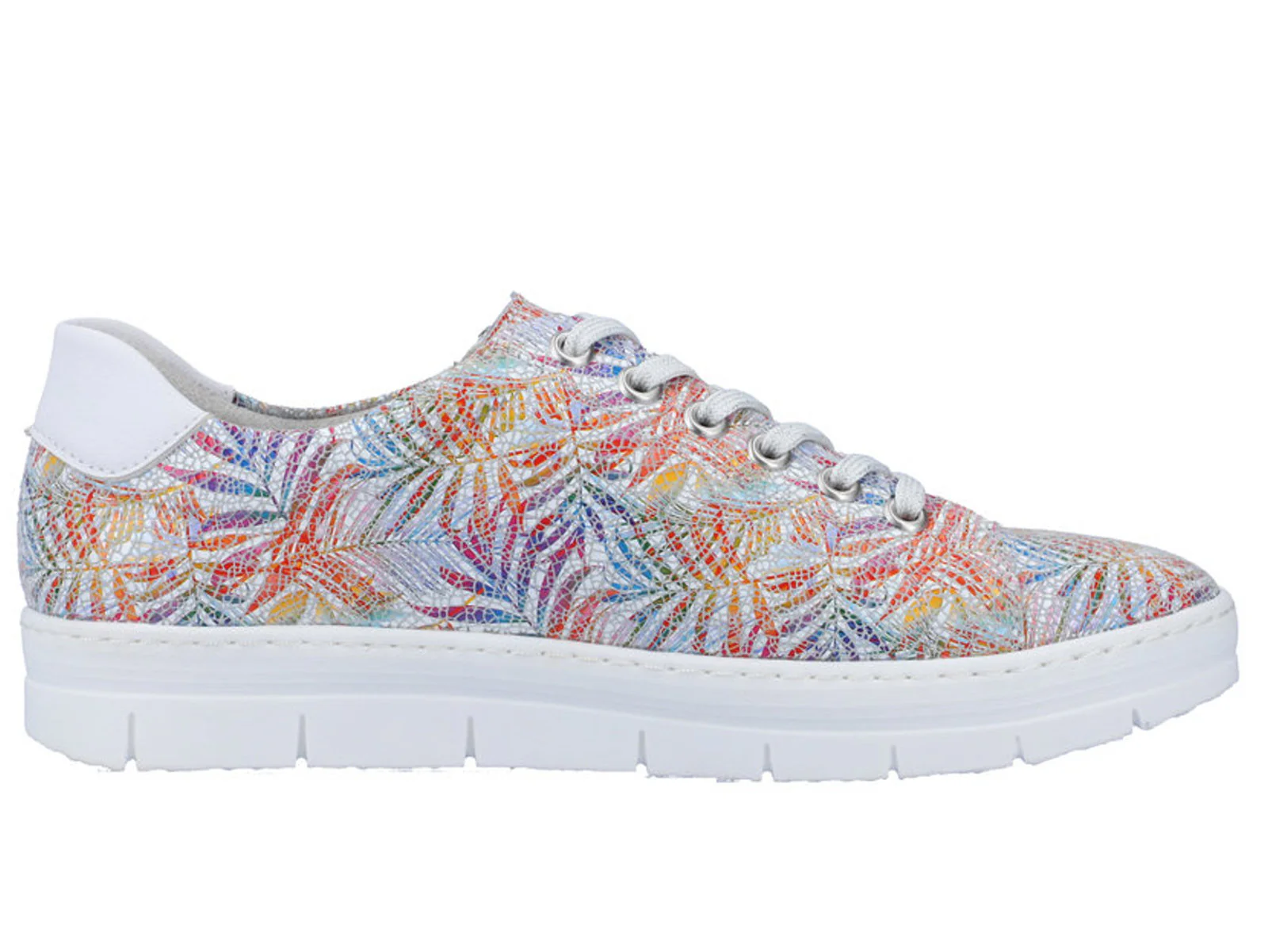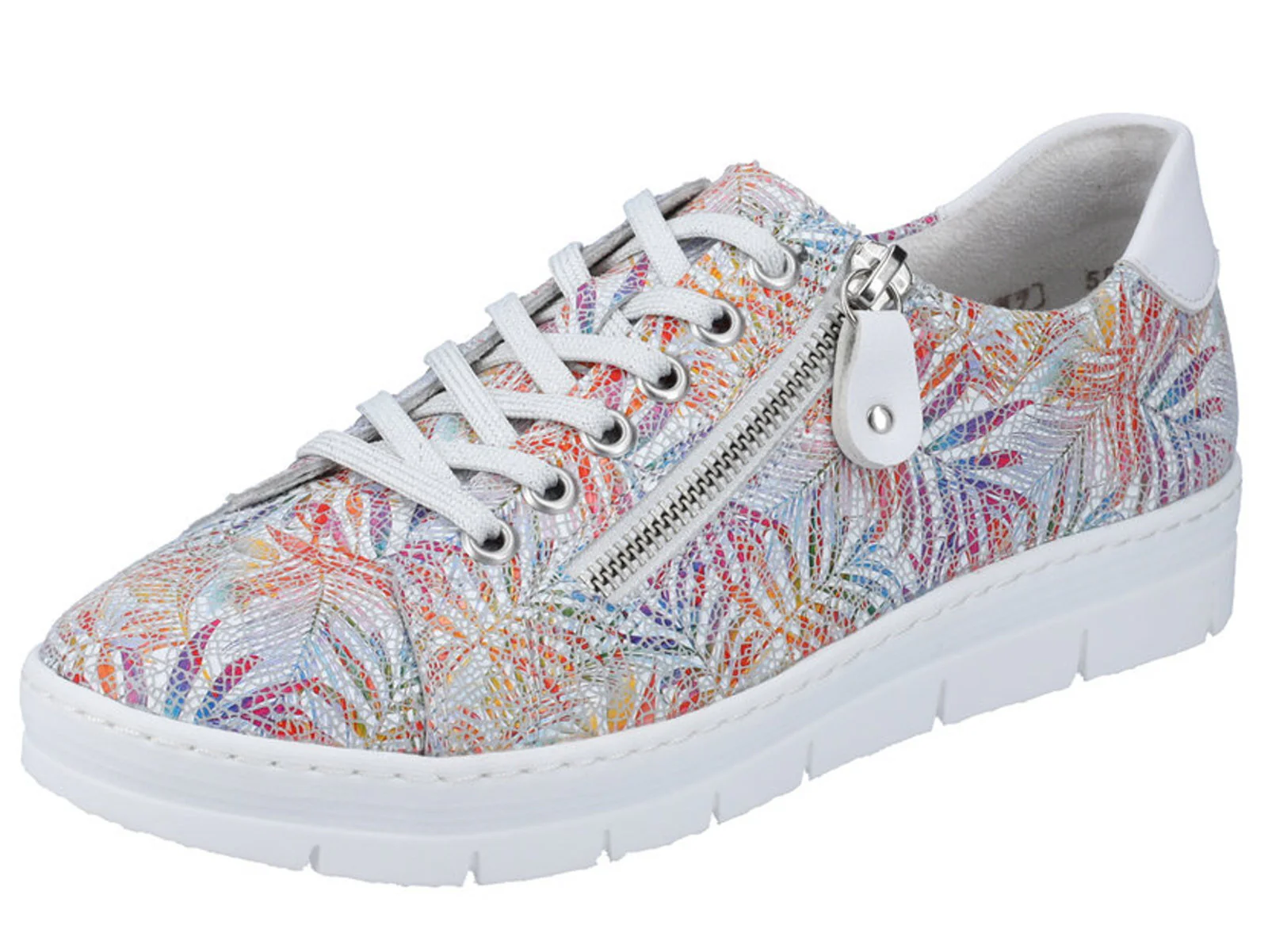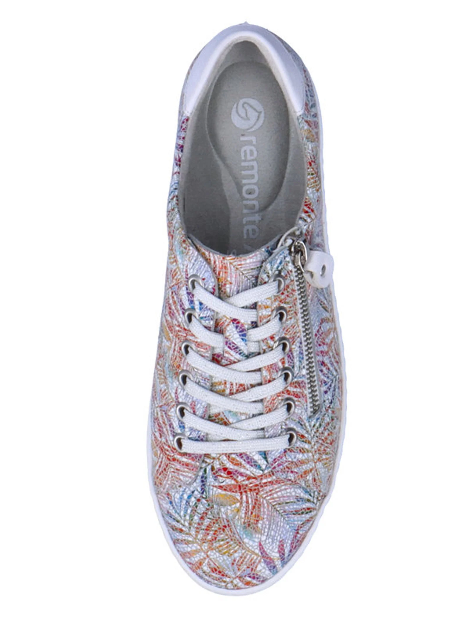 Moderne dames sneaker uit de Remonte Soft collectie. Deze sneaker is uitgevoerd in multi-colered leer, zodat hij overal bij past. De binnenkant van de schoen is uitgerust met textiel. De sneaker heeft een vetersluiting en een ritssluiting die je extra instapruimte geeft. Het uitneembare voetbed kan, indien nodig, vervangen worden door losse inlegzolen.. Dit model heeft een sportieve witte loopzool.