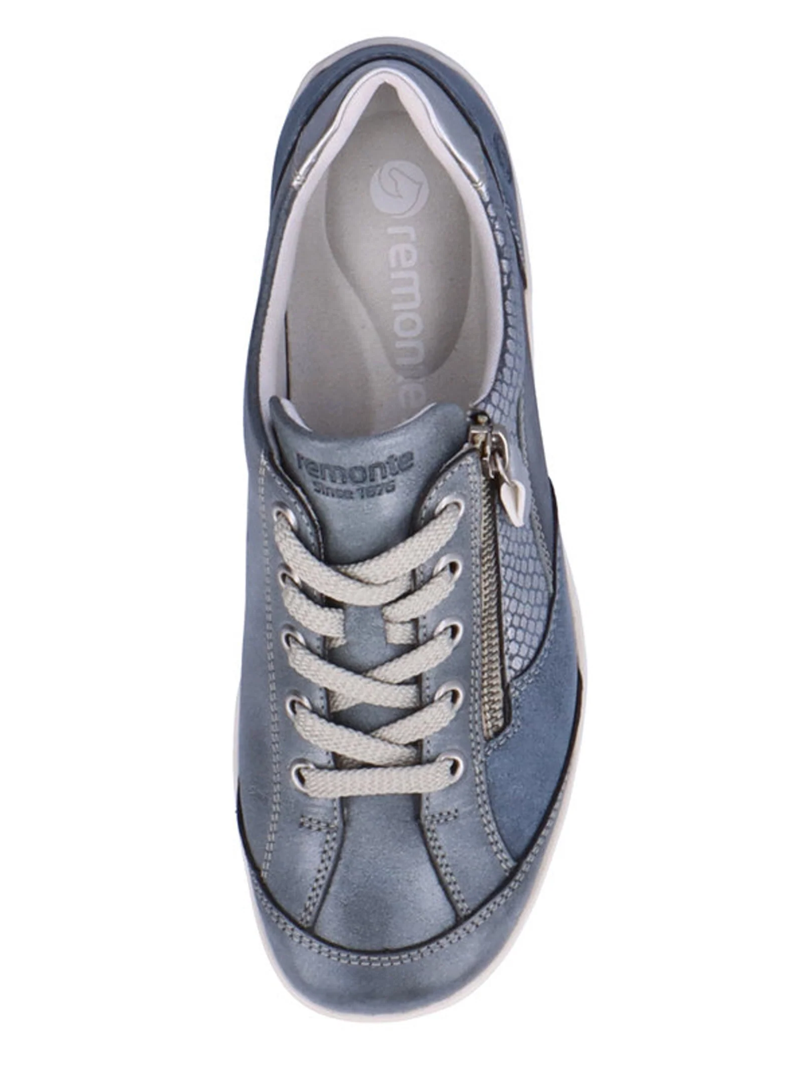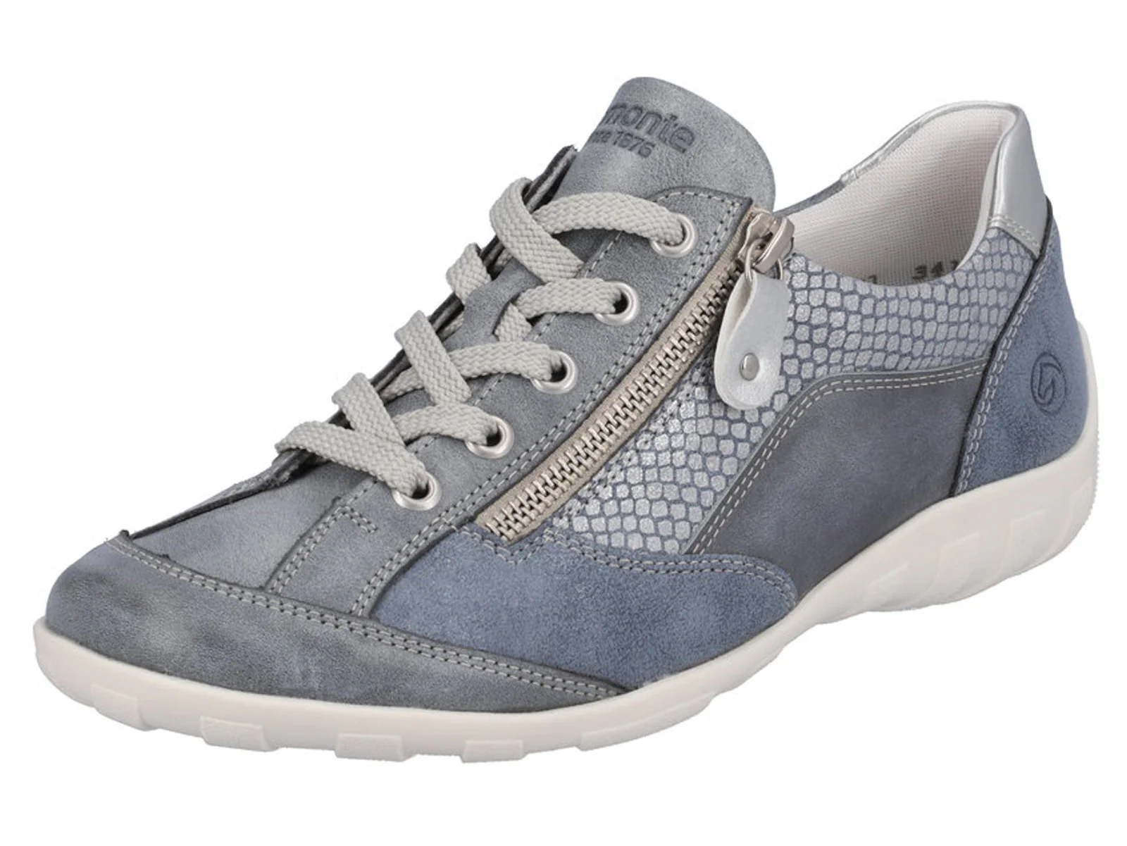 Comfortabele dames sneaker uit de Remonte Soft collectie, uitgevoerd in een combinatie van verschillende decoratieve leersoorten. De sneaker heeft naast de vetersluiting ook een rits voor een gemakkelijke instap. De voering is van microvelours (textiel). Het zachte uitneembare voetbed kan, indien nodig, vervangen worden door losse inlegzolen. De sneaker heeft een gripvaste TR-zool.