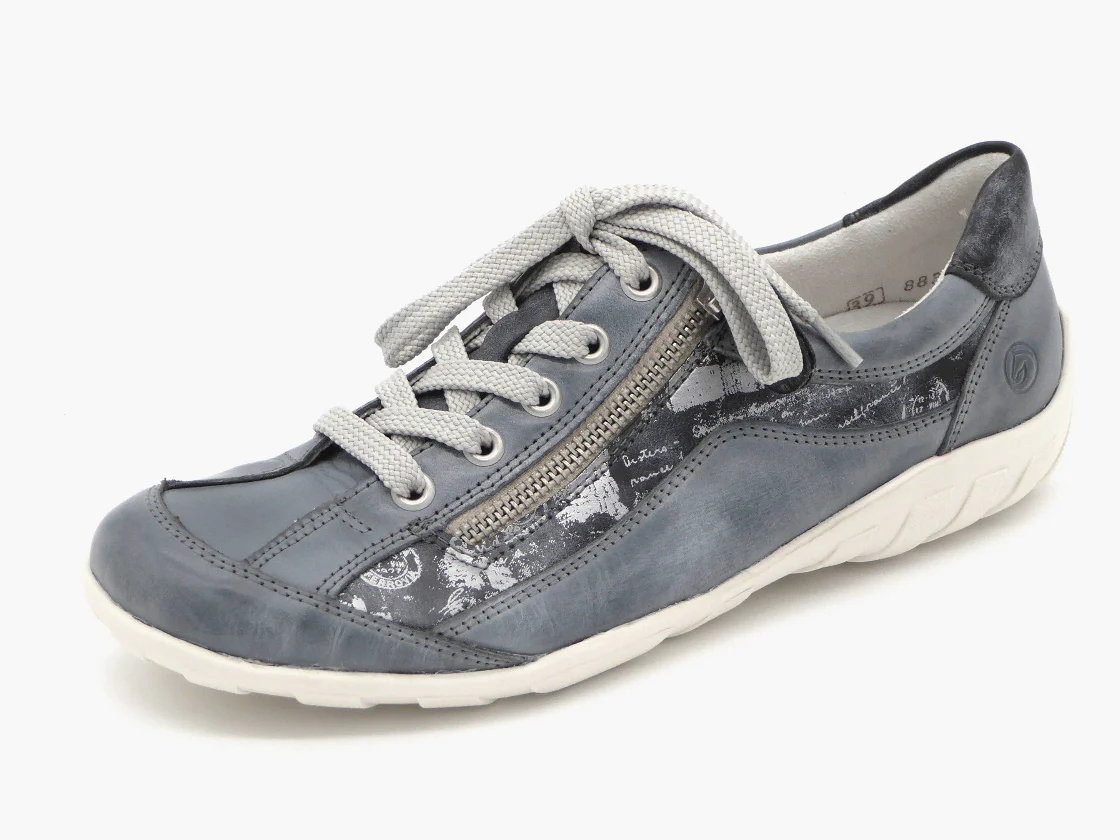 Comfortabele dames sneaker uit de Remonte Soft collectie, uitgevoerd in een combinatie van verschillende decoratieve leersoorten. De sneaker heeft veters en een rits voor een gemakkelijke instap. De voering is van textiel. Het uitneembare voetbed kan, indien nodig, vervangen worden door losse inlegzolen. De sneaker heeft een gripvaste rubberzool.