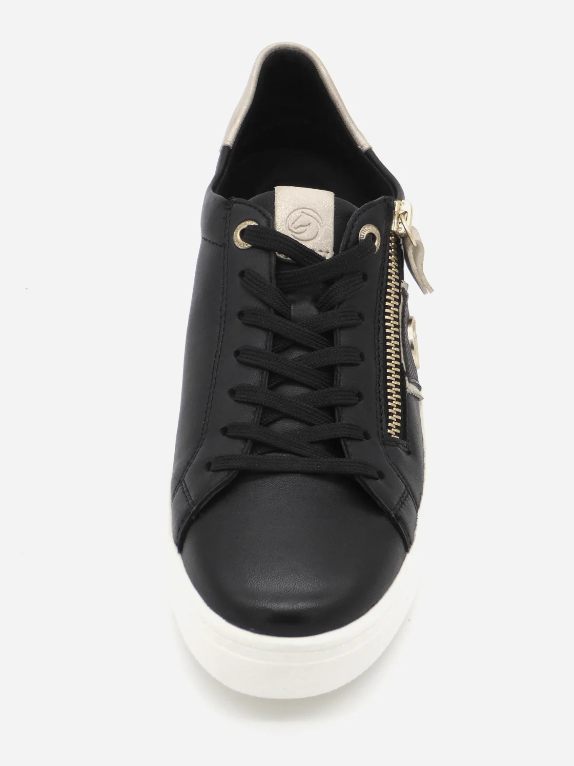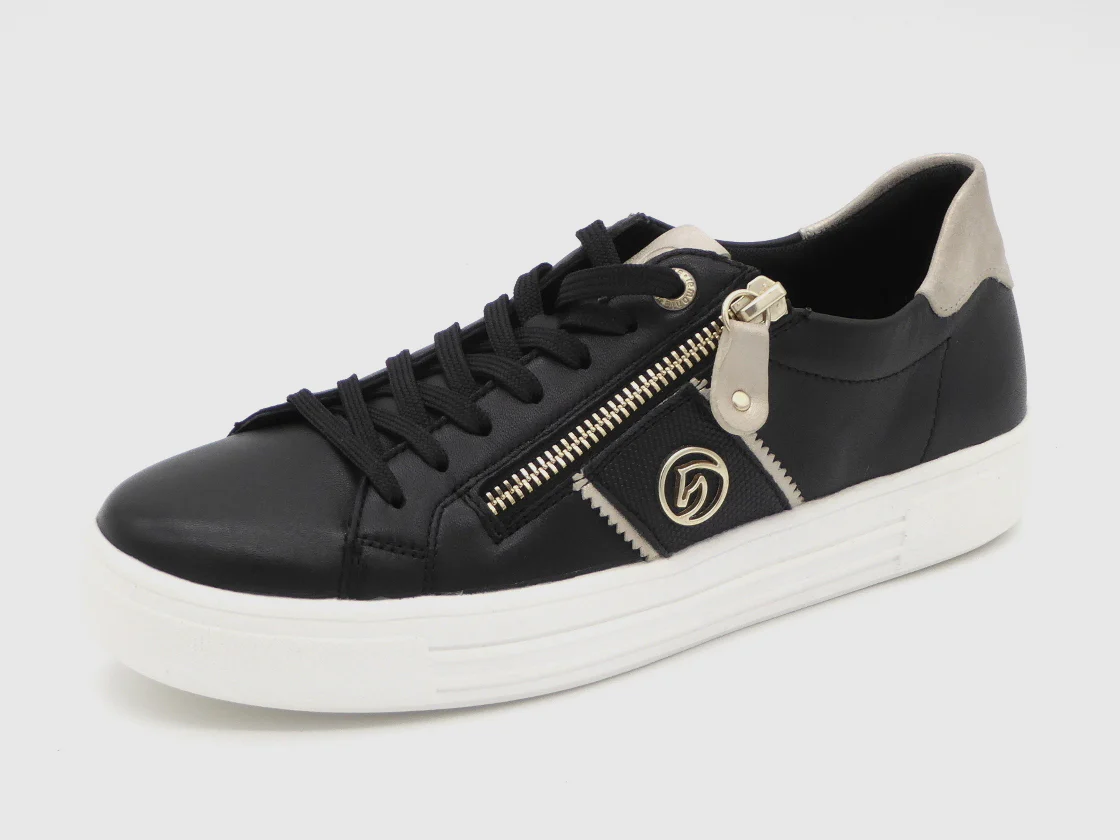 Modische dames sneaker uit de Remonte Soft collectie, uitgevoerd in zwart leer met goud accenten. De sneaker heeft een vetersluiting en aan de buitenzijde zit een handige rits voor het eenvoudig aan- en uittrekken van de schoen. De voering is van microvelours (textiel). Het zachte voetbed is uitneembaar, dus ook geschikt voor losse inlegzolen. De schoen heeft en lichtgewicht PU-zool met een dikte van 3 cm.