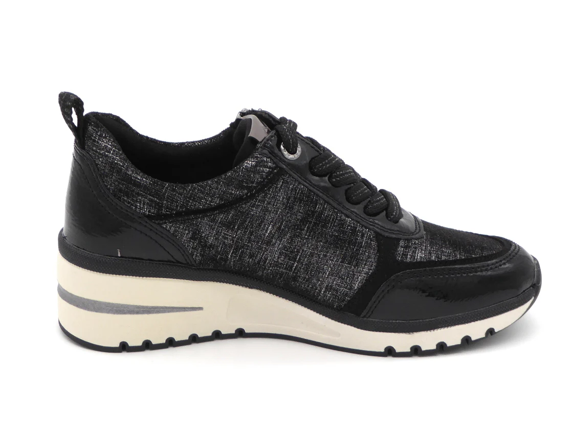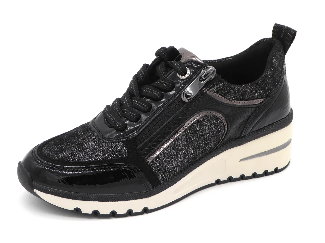 Marco Tozzi dames sneaker met een bovenwerk van synthetisch materiaal met textiel. Naast de vetersluiting beschikt deze sneaker ook over een rits, voor een makkelijke instap. Het ‘Feel Me’ foam-voetbed ís zacht en zorgt voor een fijne demping bij iedere stap. De voering is van textiel met een verwisselbaar zacht ‘Feel Me’ foam-voetbed dat zorgt voor een fijne demping bij iedere stap. Afgewerkt met een sportieve dikke loopzool met sleehak en een goede grip.
