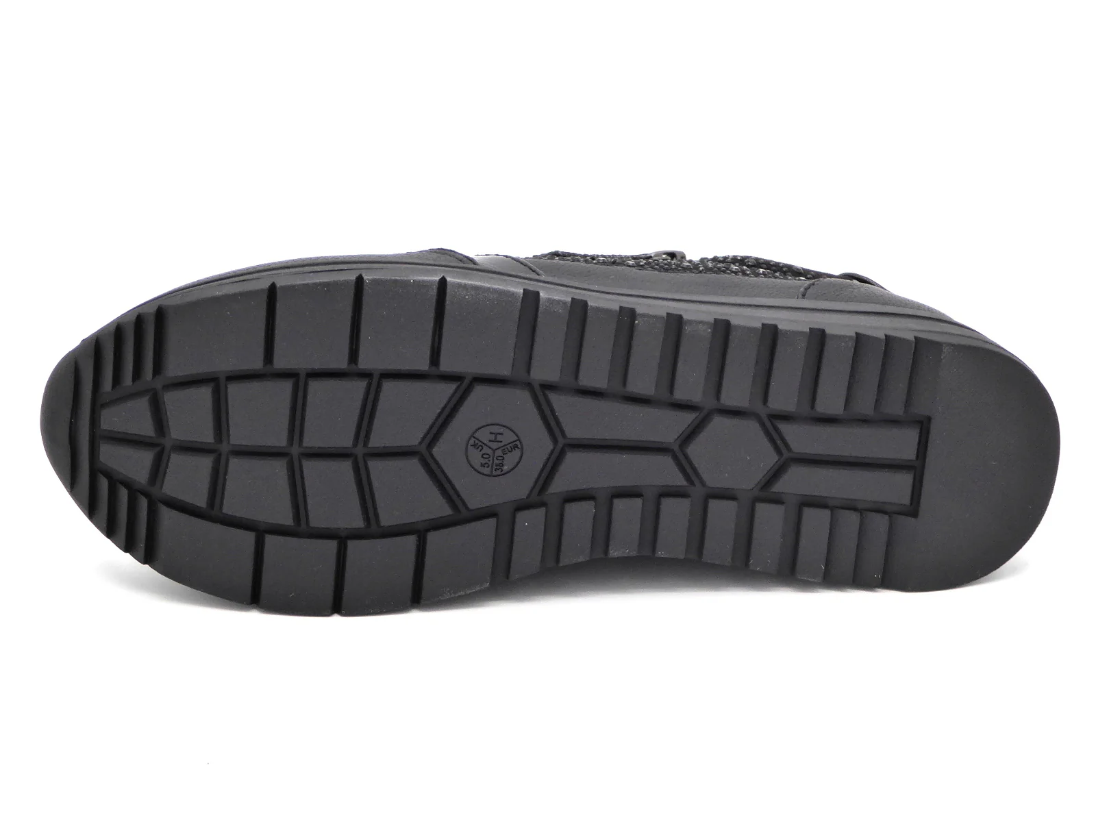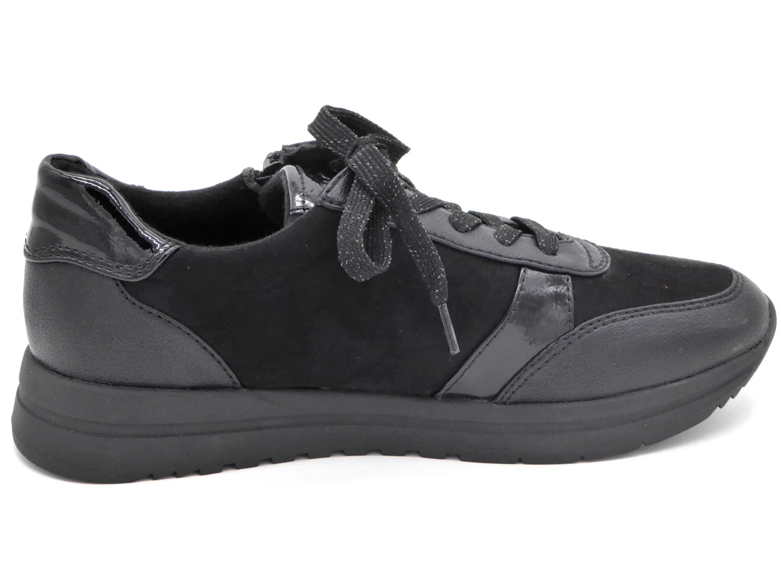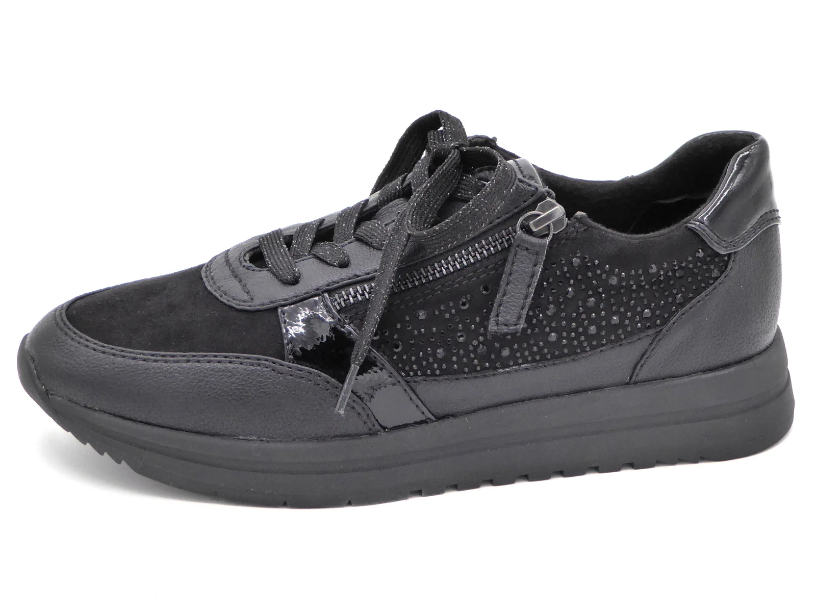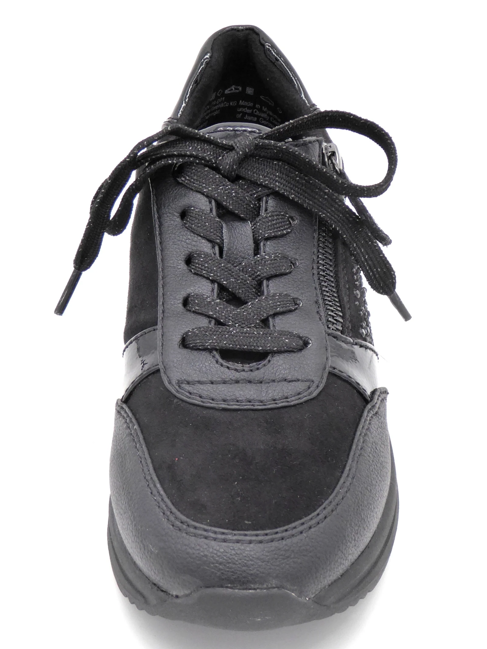 Zwarte sneaker voor dames uit de Jana Softline collectie. De sneaker heeft een vetersluiting en een rits voor extra gemakkelijke instap. Het bovenwerk van de schoen is gemaakt van synthetisch materiaal. De voering is van textiel met een vast voetbed. De Jana sneaker heeft een stevige zool die grip en demping biedt. Dit model is gemaakt in een iets bredere leest wijdt H. Verder bevat de schoen gerecycled PET flessen onderdelen.