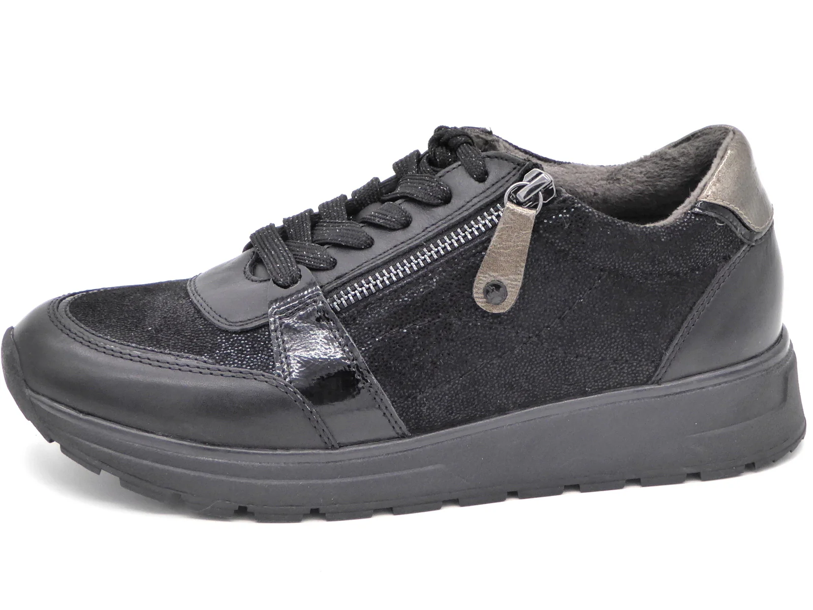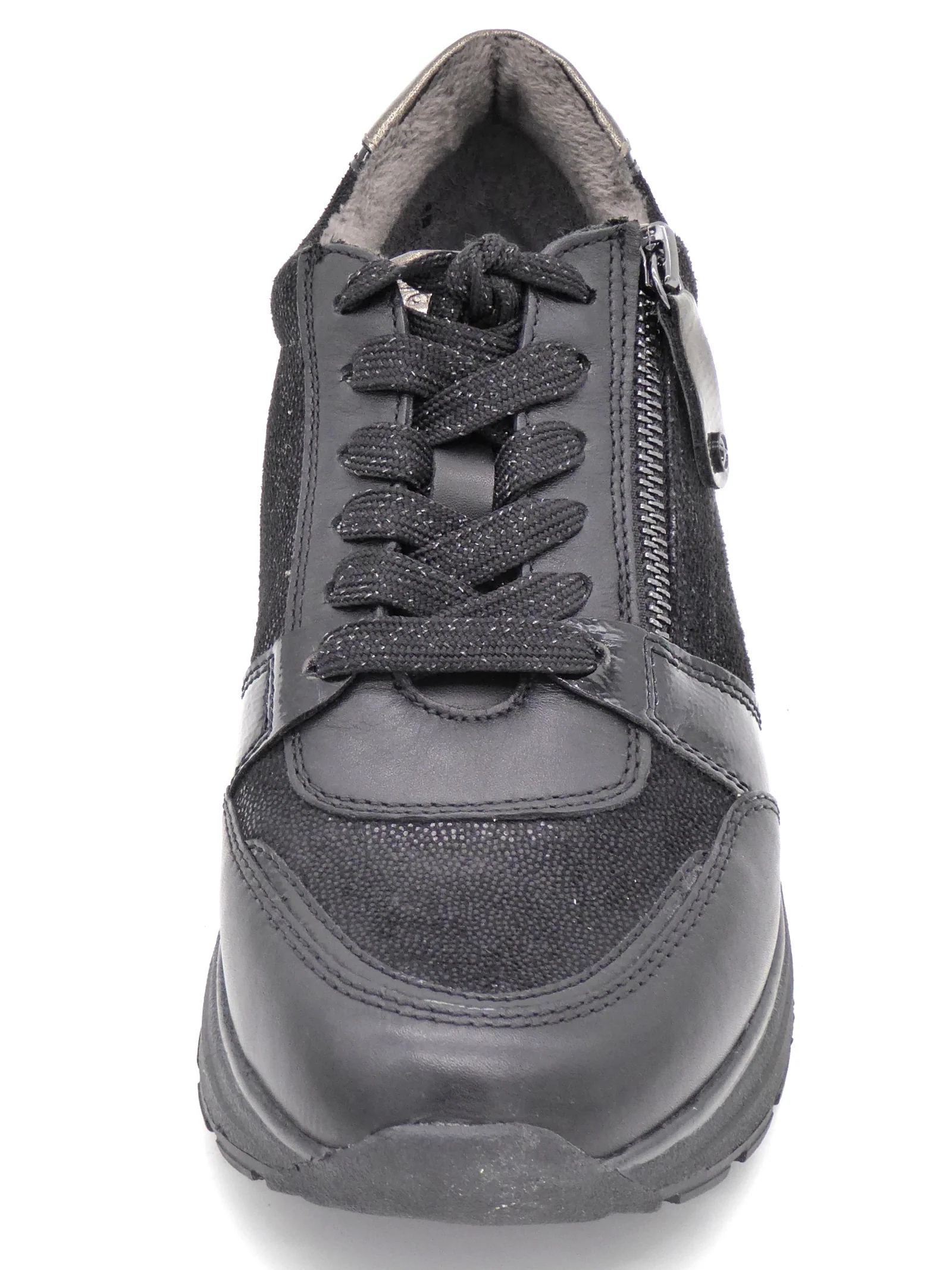 Sneaker voor dames uit de Tamaris Comfort collectie. De sneaker heeft een vetersluiting en een rits voor extra gemakkelijke instap. Het bovenwerk van de schoen is gemaakt van leer in combinatie synthetisch materiaal. De voering is van zacht textiel met een comfortabel Comfort Fit voetbed, dat uitneembaar is. De sneaker heeft een soepele zool die grip en demping biedt. Dit model is gemaakt in een iets bredere leest wijdt H. Verder bevat de schoen onderdelen van gerecycled PET flessen.