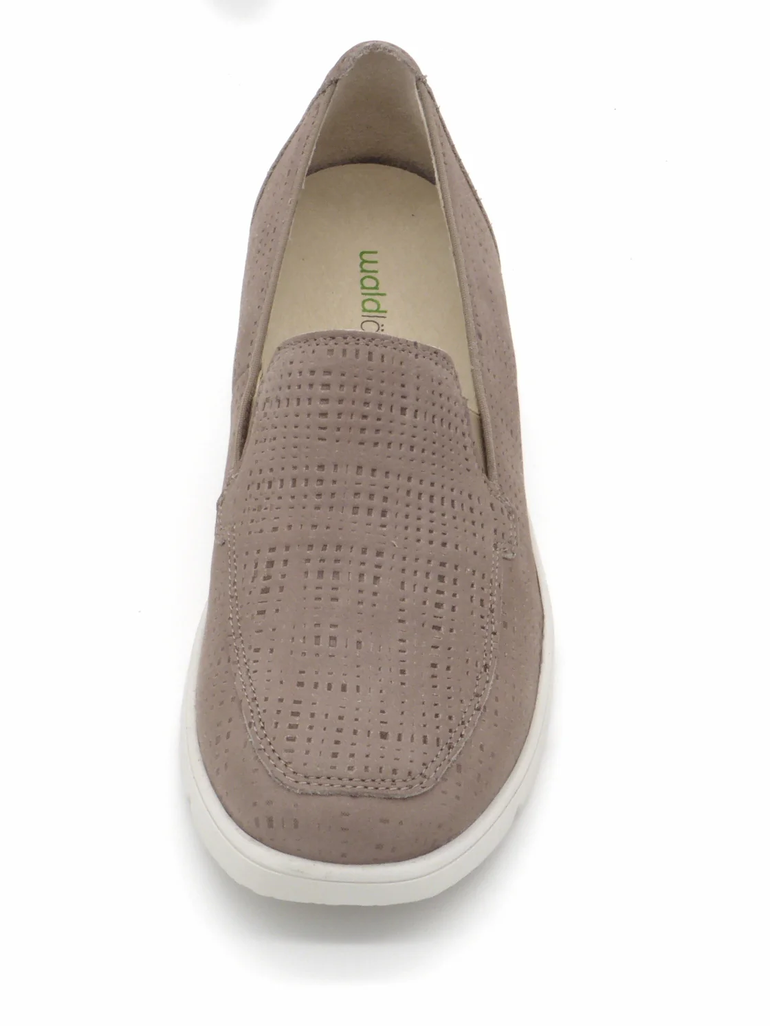 Waldläufer comfortabele mocassin instapper van een aangenaam, hoogwaardig leer. Het bovenwerk is gemaakt van nubuck met op het voorblad een mooie print. Aan beide zijden zit elastiek voor een betere sluiting. De binnenkant van de schoen is uitgerust met chroomvrij leer. Het voetbed is uitneembaar, zodat de schoenen ook geschikt is voor het dragen van eigen zolen. De schoen valt normaal en is gemaakt in de iets bredere leest wijdte H (H-Bruni). De zool is van kunststof met een hakhoogte van 35 mm.