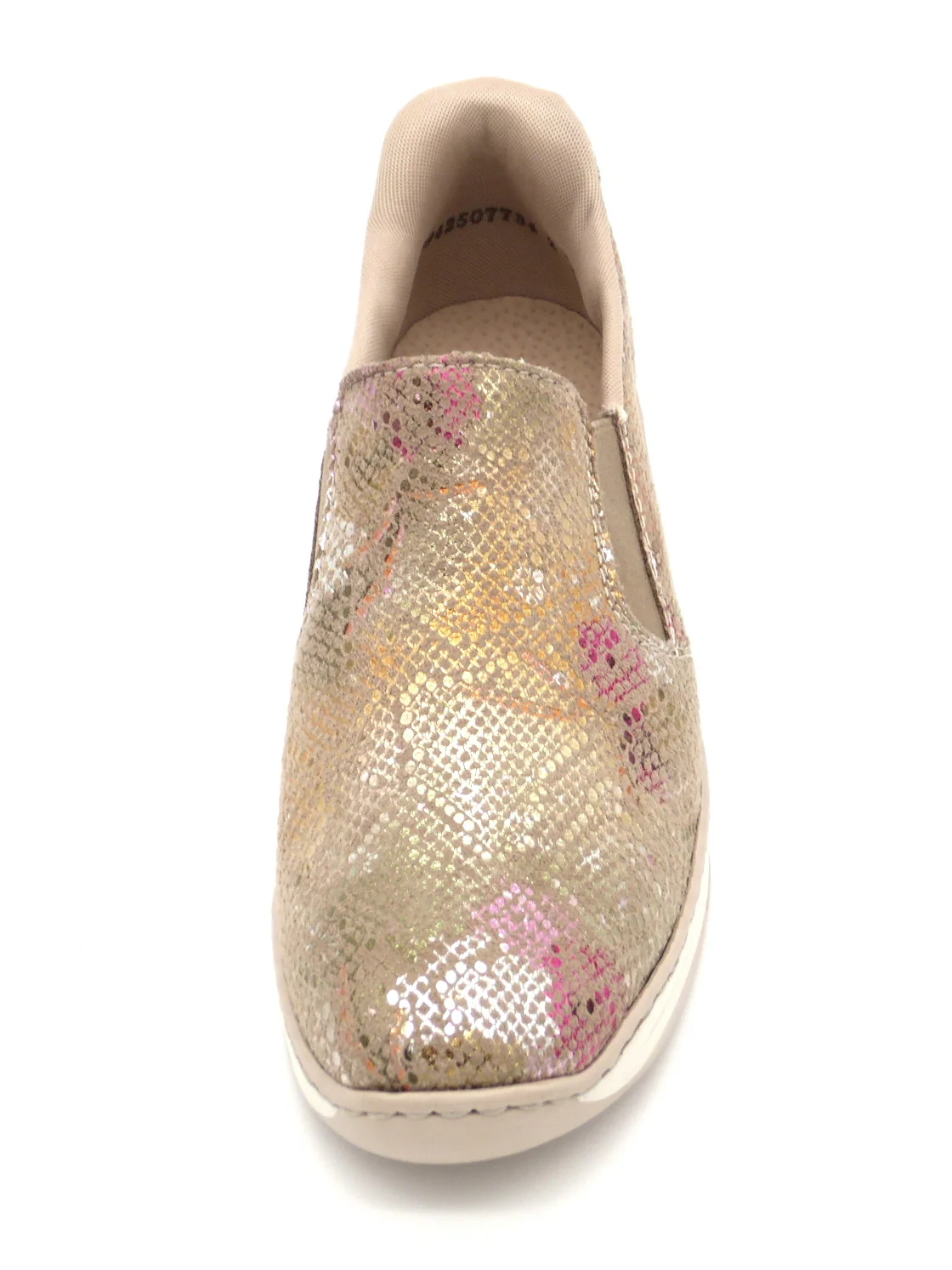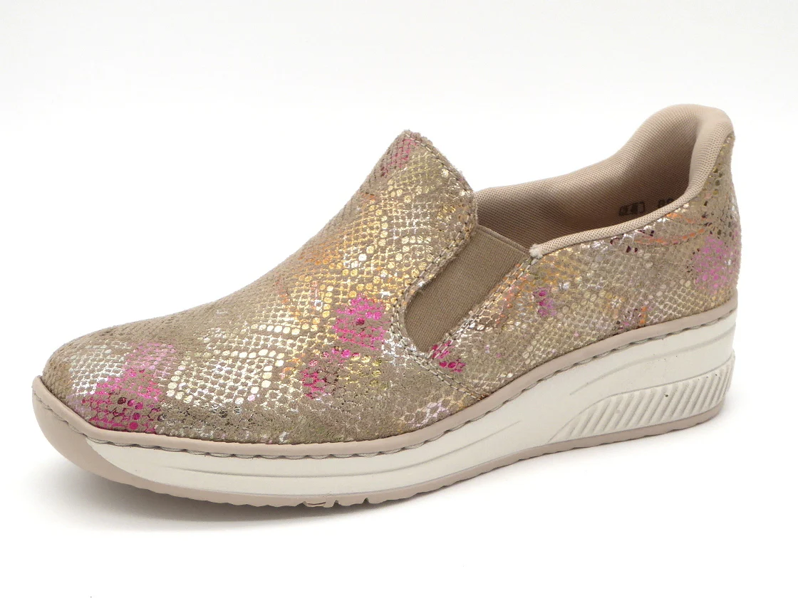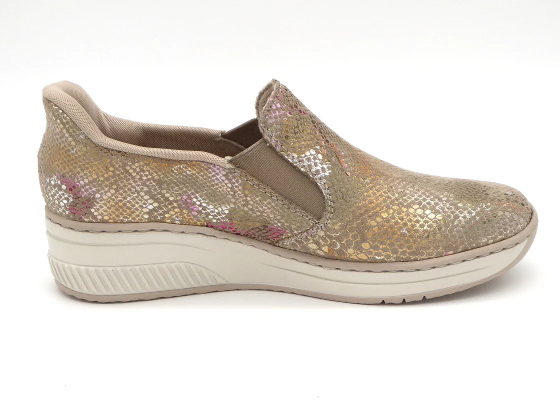 Rieker Ready 2 Go instapper, uitgevoerd in zacht multi-colored bovenwerk van textiel. Deze instapper van Rieker is ontworpen met de innovatieve Hands Free Ready 2 Go technologie, waardoor je de schoen gemakkelijk en snel aantrekt zonder handen te gebruiken dankzij de vaste hielkap en de elastische inzetten. De voering is van textiel. De binnenzool is met leer bekleed. Door het ingebouwde anti-stress systeem heeft deze schoen een uitstekende comfort, flexibiliteit en schokdemping. Deze schoen heeft een PU-zool met sleehak.