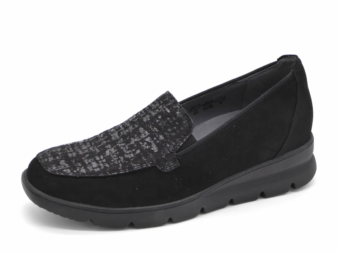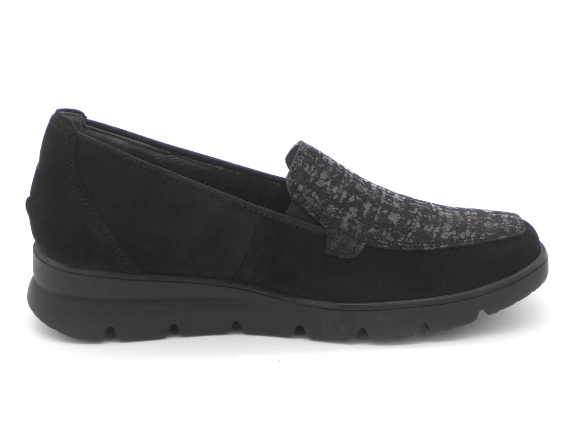Waldläufer comfortabele mocassin instapper van een aangenaam, hoogwaardig leer. Het bovenwerk is gemaakt van nubuck met op het voorblad een mooie print. Aan beide zijden zit elastiek voor een betere sluiting. De binnenkant van de schoen is uitgerust met chroomvrij leer. Het voetbed is uitneembaar, zodat de schoenen ook geschikt is voor het dragen van eigen zolen. De schoen valt normaal en is gemaakt in de iets bredere leest wijdte H (H-Bruni). De zool is van kunststof met een hakhoogte van 35 mm.