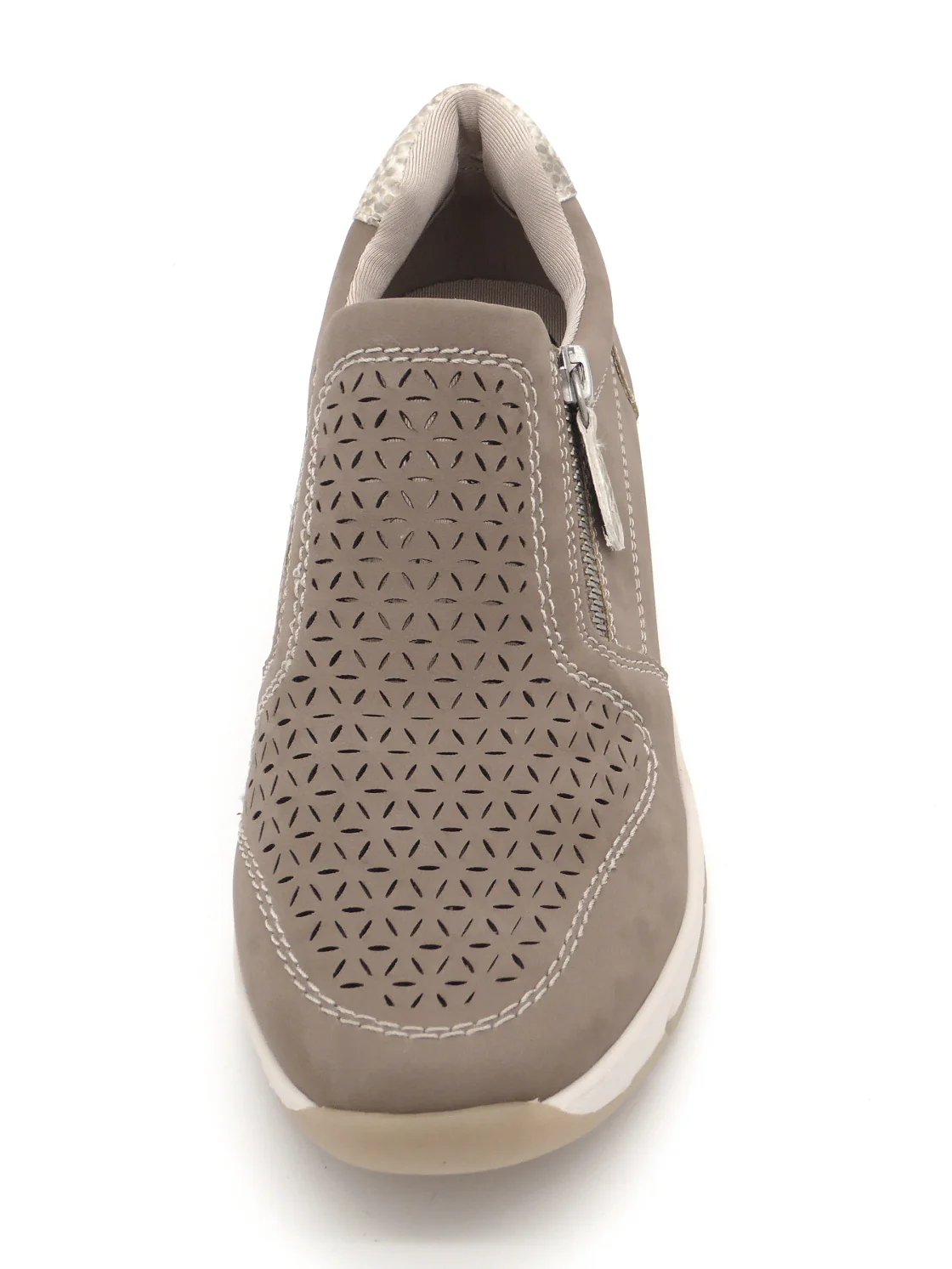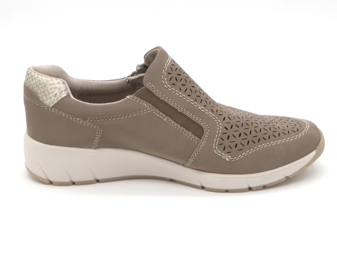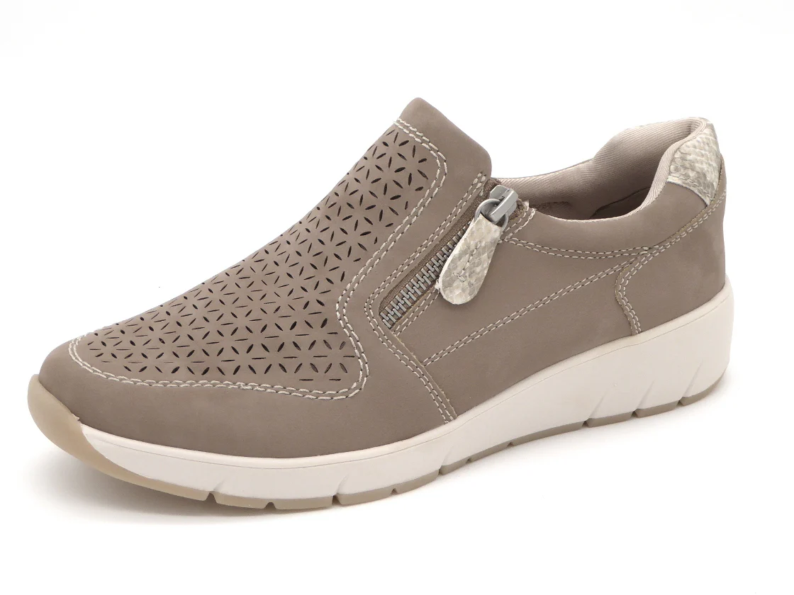 Jana dames instapper uit de Softline serie, uitgevoerd in hoogwaardig synthetisch materiaal nubucklook met decoratieve perforaties wat een zomerse look geeft. De schoen heeft een rits aan de buitenzijde en een elastieken inzet aan de binnenzijde voor een gemakkelijke instap De voering is van synthetisch materiaal met een vast voetbed. De schoen heeft een sportieve zool. Dit model is gemaakt in een iets bredere leest wijdt H en is vervaardigd met 100% vegan, PFI-gecertificeerde materialen voor een duurzame keuze.