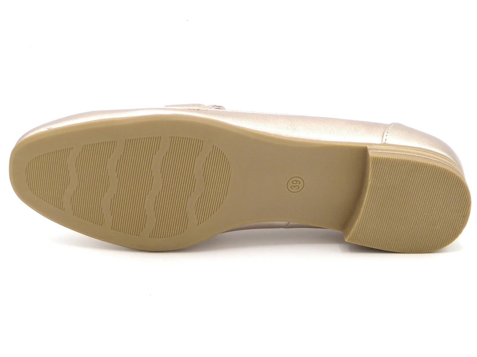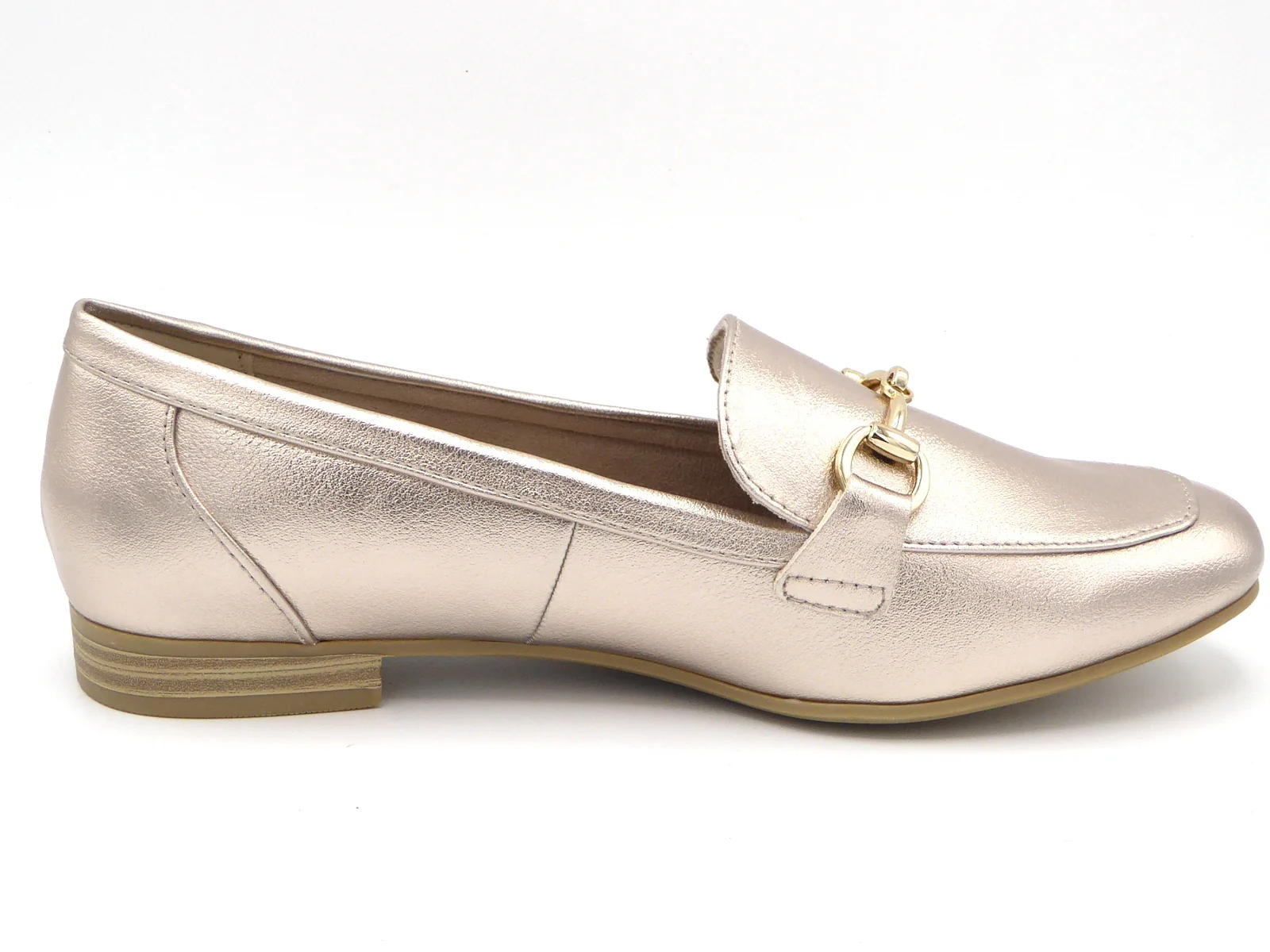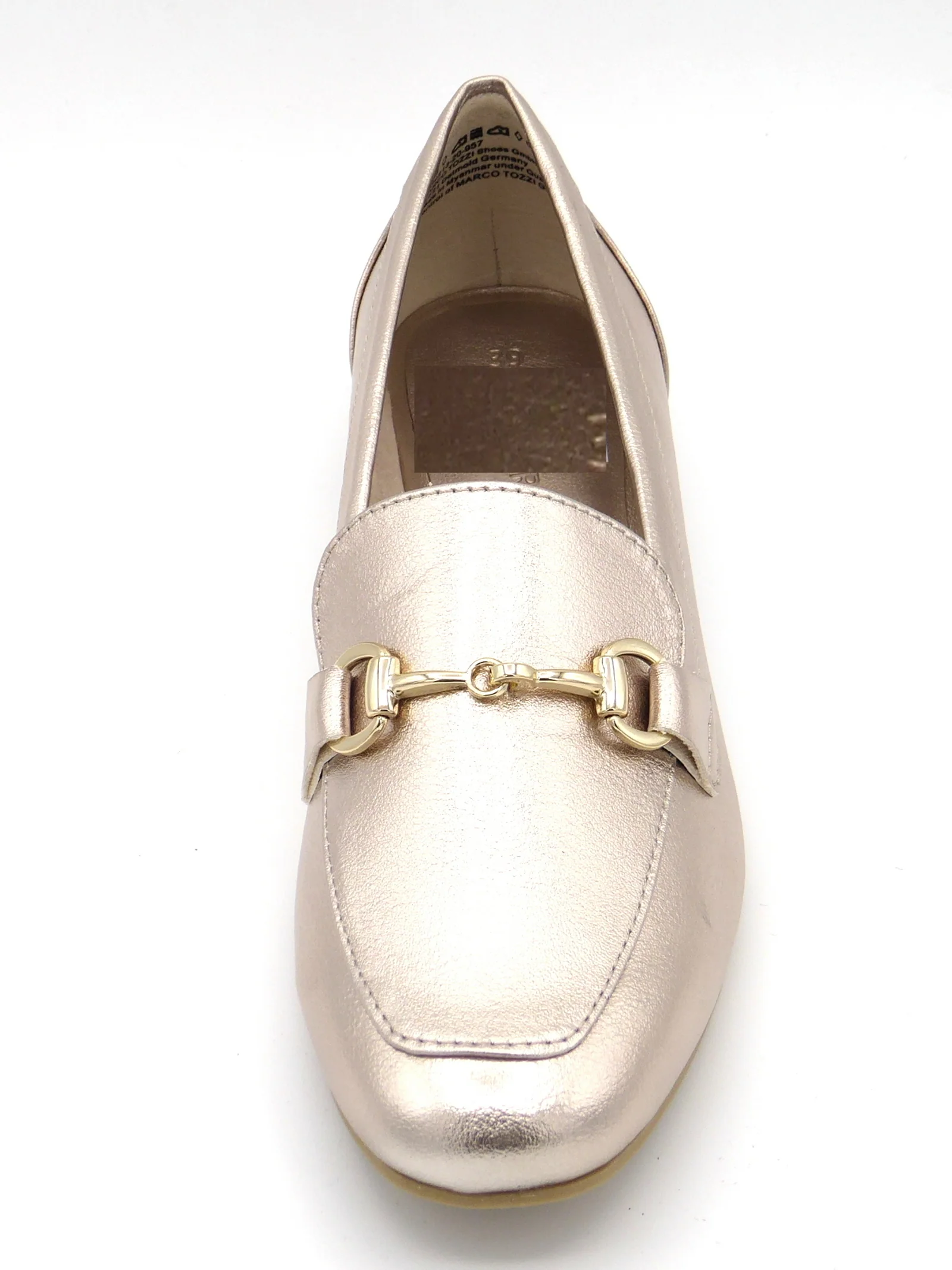 Marco Tozzi instapper/loafer gemaakt van synthetisch materiaal in metallic leerlook.. Deze loafer heeft een klassieke look met het kenmerkende bandje met gouden bit op de wreef. De voering is van textiel. Het ‘Feel Me’ foam-voetbed ís zacht en zorgt voor een fijne demping bij iedere stap. De PU zool heeft een laag hakje van 2 centimeter. De instapper heeft een vast voetbed.