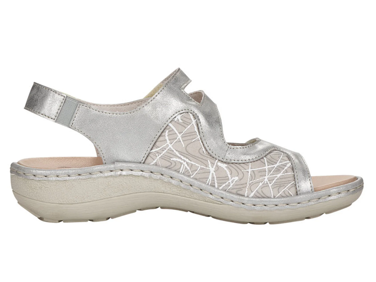 Remonte dames sandaal uitgevoerd in een combinatie van imitatieleer en stretchmateriaal met een print. Door het rekbaar stretchmateriaal aan de zijkanten is deze sandaal ideaal voor voetproblemen zoals hallux valgus, hamertenen en andere knobbels. De schoen heeft 3 klittenbandsluiting; op de voorvoet, op de wreef en om de hiel die aanpasbaar zijn aan de voet. Het met leer beklede uitneembare voetbed kan, indien nodig, vervangen worden door losse inlegzolen. De lichtgewicht PU-zool geeft goede demping en heeft een hakhoogte van 35 mm.