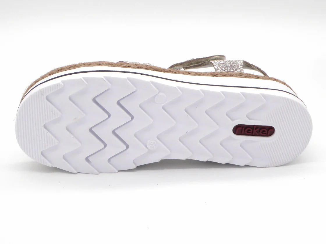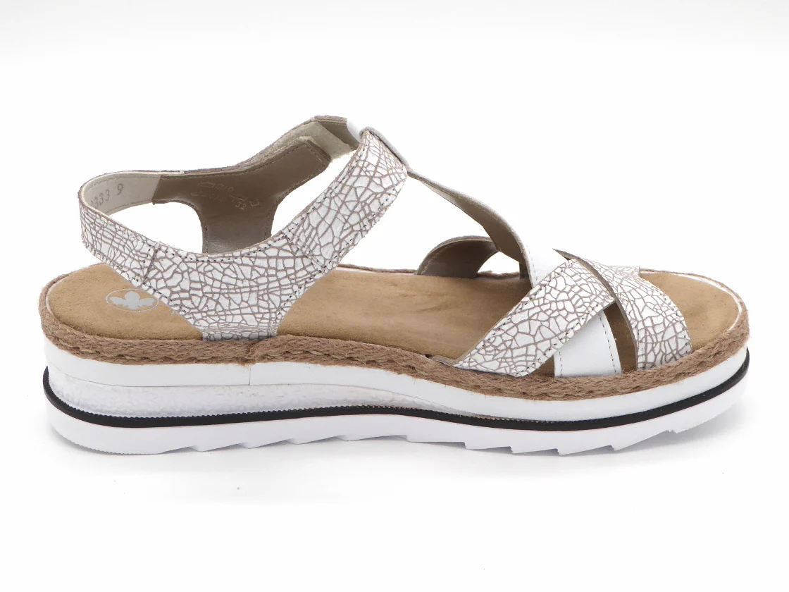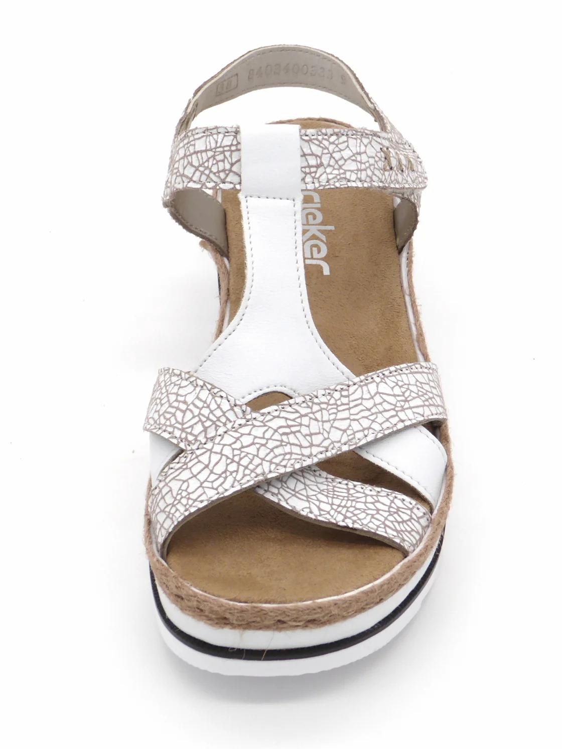 Rieker dames sandaal gemaakt van imitatieleer in wit met printleer. De binnenkant en het zachte voetbed zijn gemaakt van synthetisch materiaal. De sandaal heeft een t-band met klittenband sluiting. Door de Antistress-technologie is de Rieker schoen lichter en soepeler en voorzien van schokabsorptie. De dikke buitenzool heeft een sleehak en is gemaakt van kunststof.