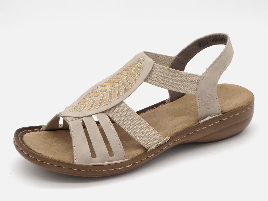 Rieker dames sandaal gemaakt van imitatieleer met elastieken banden. Perfect voor het warme weer! De binnenkant en het zachte voetbed zijn gemaakt van synthetisch materiaal. De sandaal krijgt door de versieringen op de wreef een vrolijke uitstraling. Door het ingebouwde anti-stress systeem heeft deze sandaal een uitstekende comfort, flexibiliteit en schokdemping. De lichte PU-buitenzool is 2 cm dik.