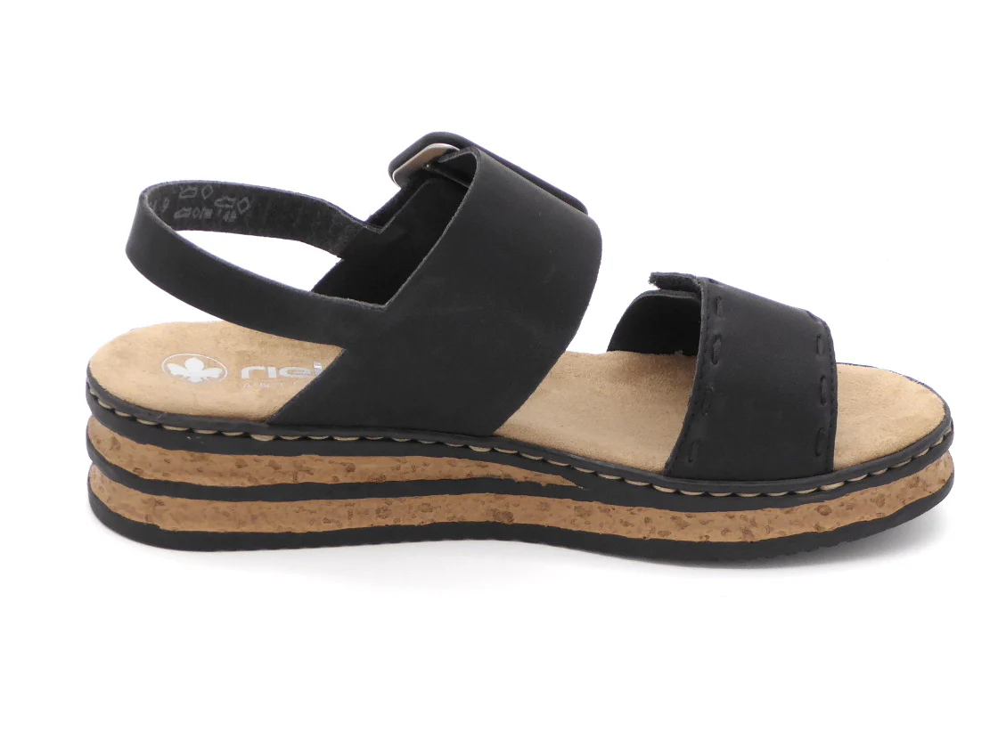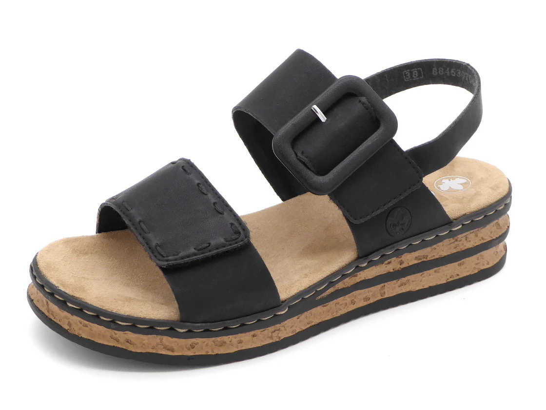 Rieker dames sandaal met een bovenwerk van mooi imitatieleer. Het voetbed en de voering zijn ook allebei gemaakt van synthetisch materiaal. Dankzij de 2 klittenbandsluitingen kun je de pasvorm aanpassen, zodat de sandaal perfect aansluit op jouw voet. Door de Antistress-technologie is de Rieker schoen lichter en soepeler en voorzien van schokabsorptie. Deze sandaal heeft een moderne plateauzool in kurklook met een PU-loopzool.