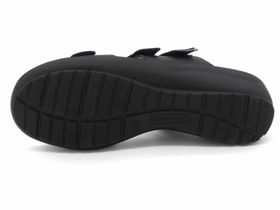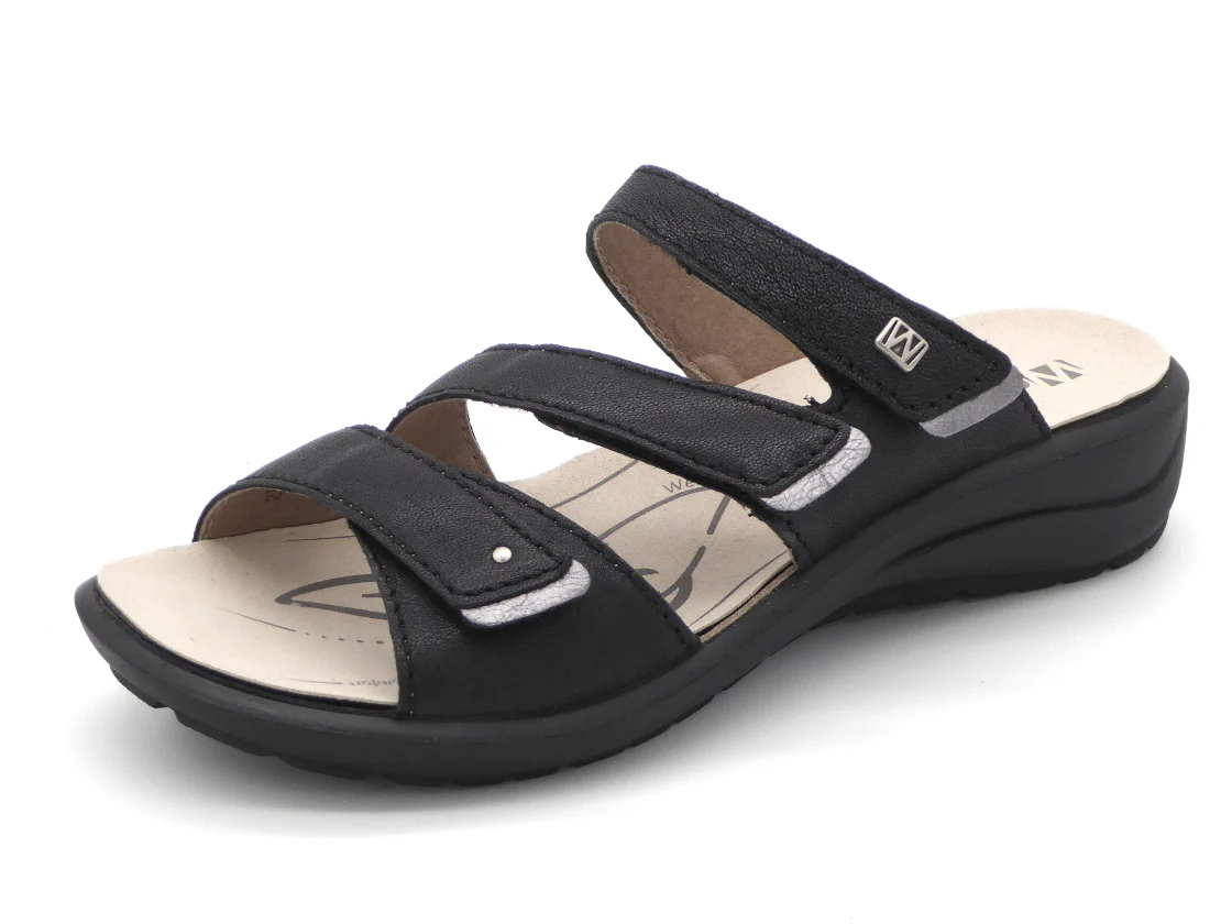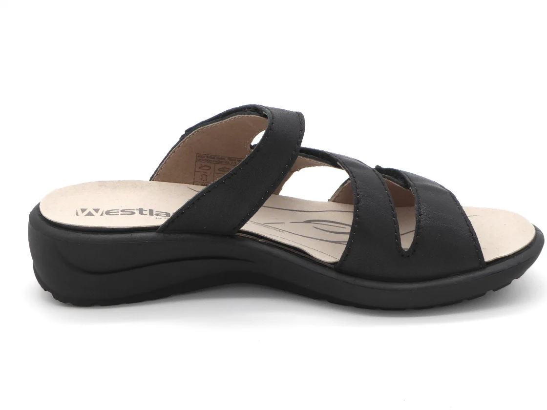 Westland artikel/model 16766 Ibiza 66 is een comfortabele dames slipper/muil met een bovenwerk van leer. De voering ook ook van leer. De slipper is aanpasbaar aan de voeten door drie aparte klittenbanden (velcro’s) en heeft een uitneembaar voetbed, dat indien nodig, vervangen kan worden door eigen (steun)zolen. De soepele schokabsorberende PU loopzool heeft een hakhoogte van 3 cm.