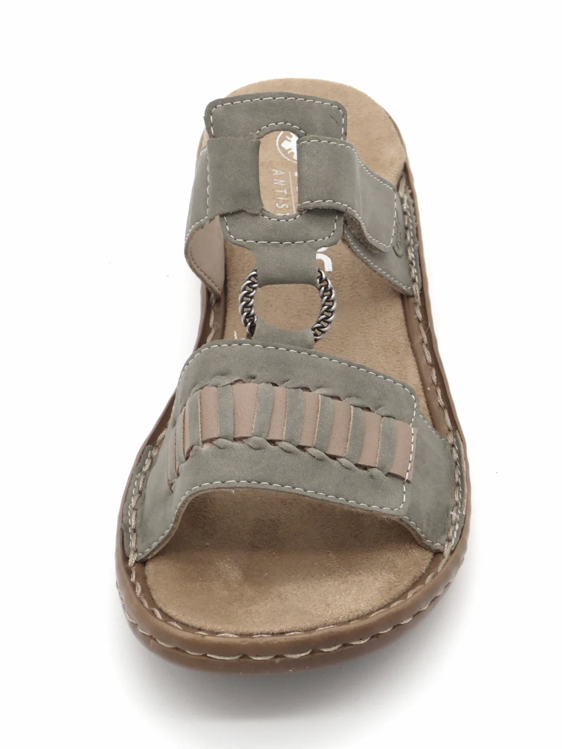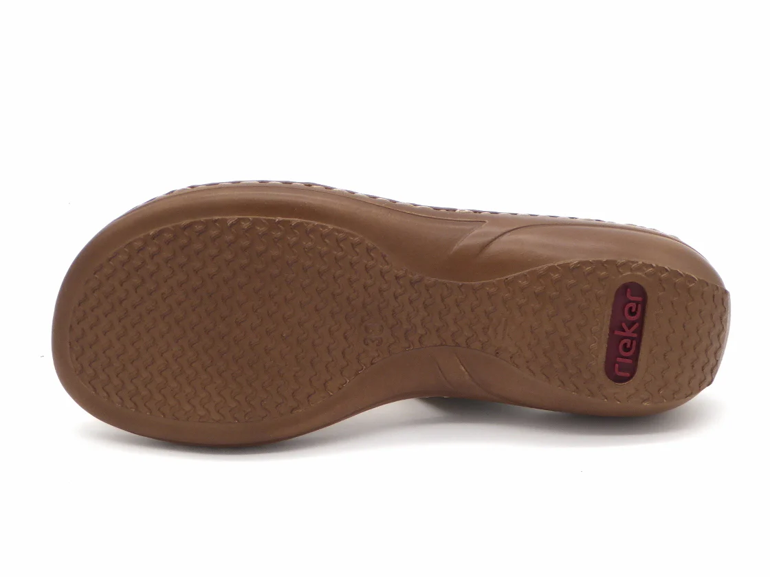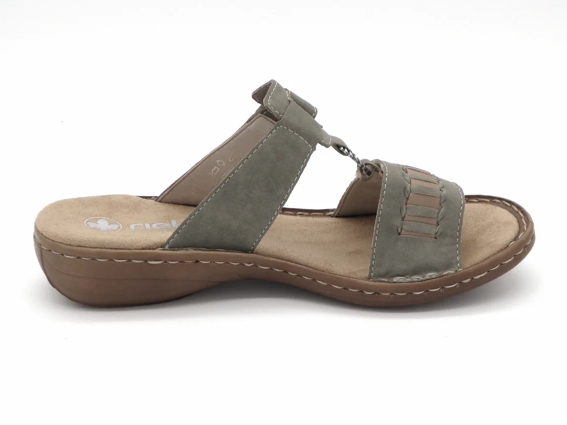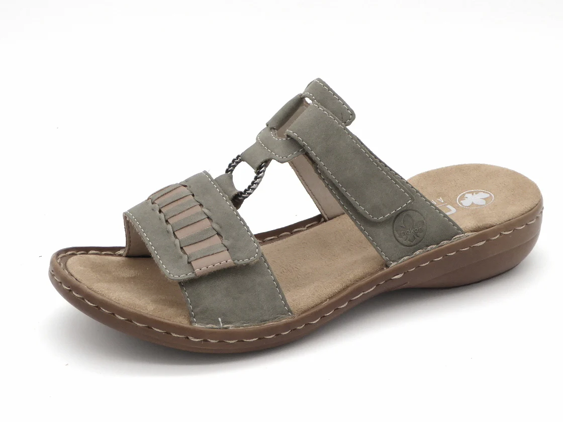 Rieker dames slipper met een bovenwerk van imitatieleer. Het voetbed en de voering zijn ook allebei gemaakt van synthetisch materiaal. Dankzij de klittenbandsluiting op de voorvoet en op de wreef kan je de pasvorm aanpassen, zodat de slipper perfect aansluit op de voet. Een leuk detail is de ring die de twee banden verbindt. Dit zorgt voor een elegante uitstraling. Door het ingebouwde anti-stress systeem heeft deze sandaal een uitstekende comfort, flexibiliteit en schokdemping. De lichte PU-buitenzool is 2 cm dik.
