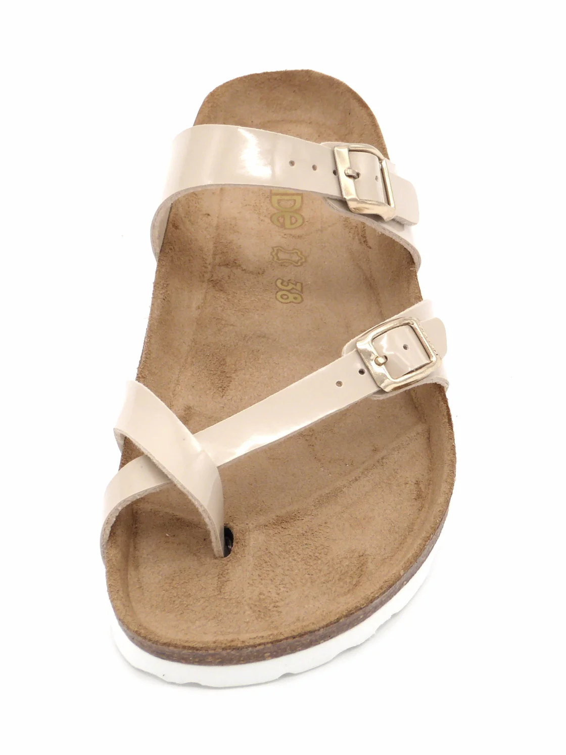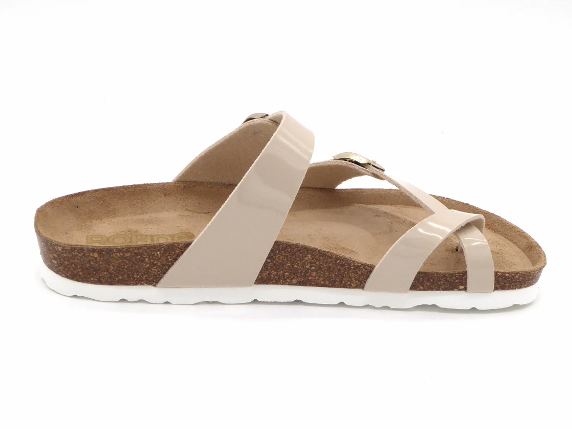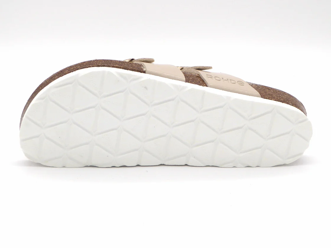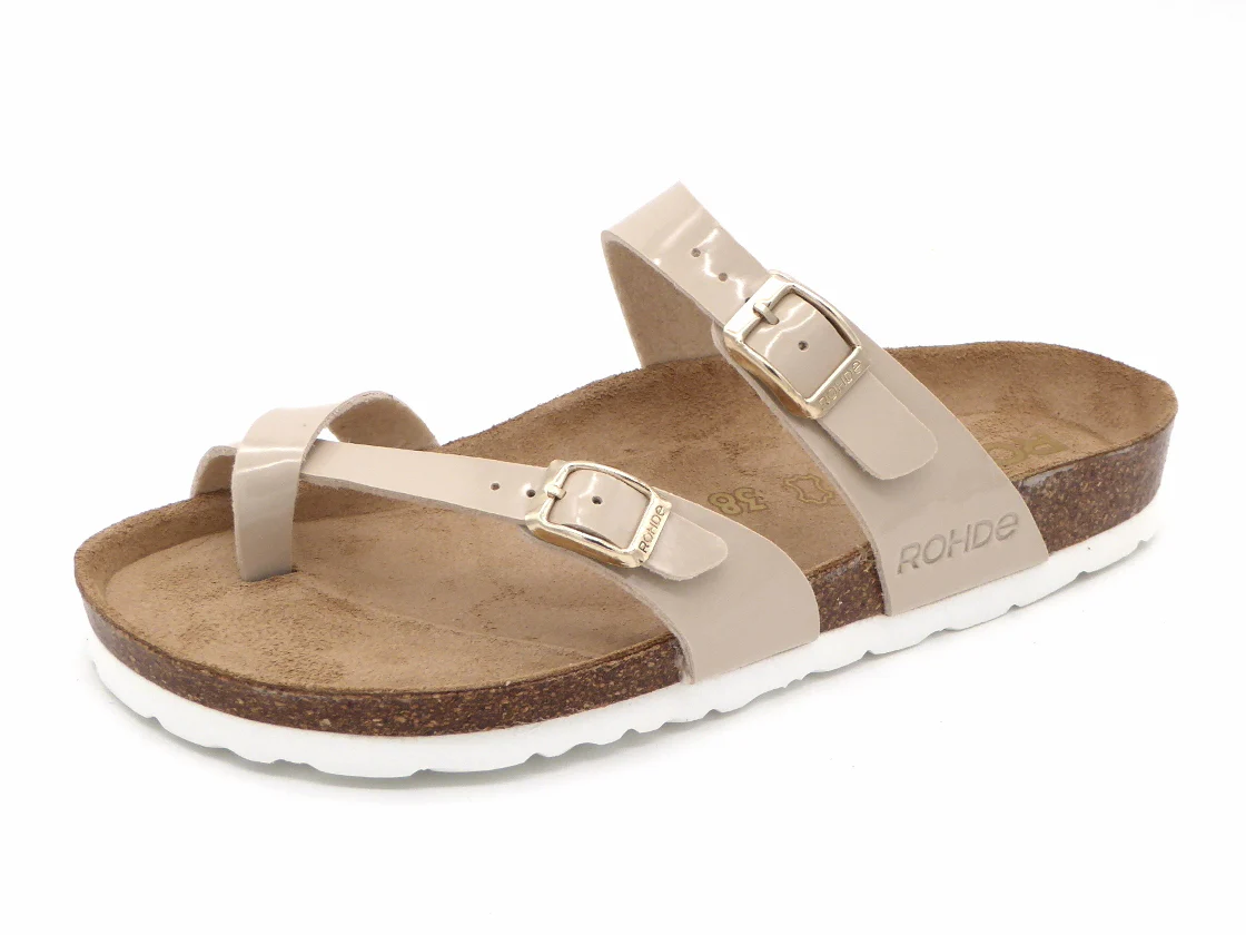 De Rohde dames slipper model 5575 is uitgevoerd in lak kunstleer. Deze teenslipper met een uitstekende pasvorm heeft een teenlus en 2 verstelbare gespbanden. Het comfortabele voetbed is gemaakt van suède met daaronder een kurklaag. Het unieke voetbed volgt de natuurlijke vorm van de voet en creëert daardoor ondersteuning en optimaal comfort. De slipper heeft een flexibele EVA zool die demping en schokabsorptie biedt.