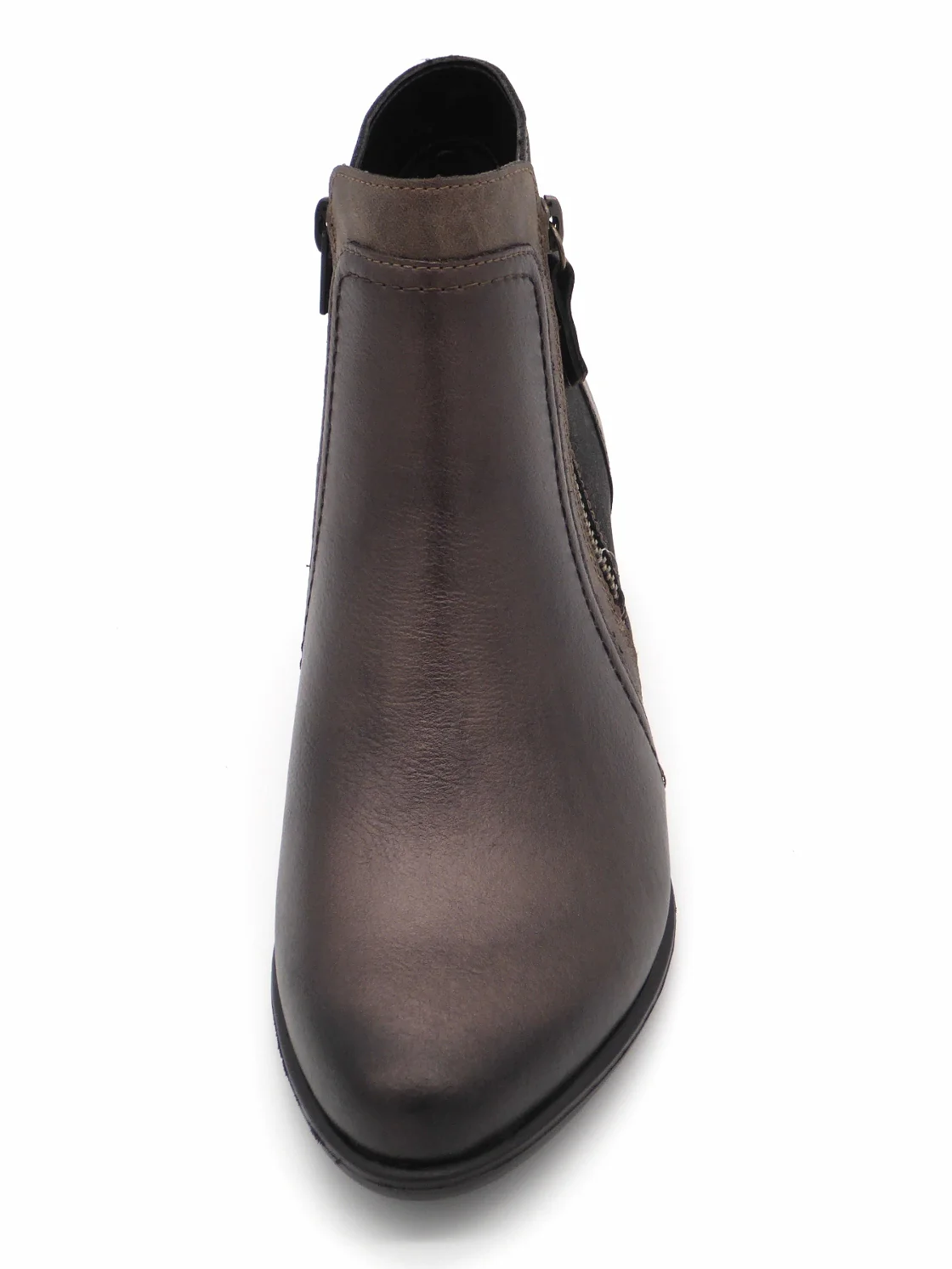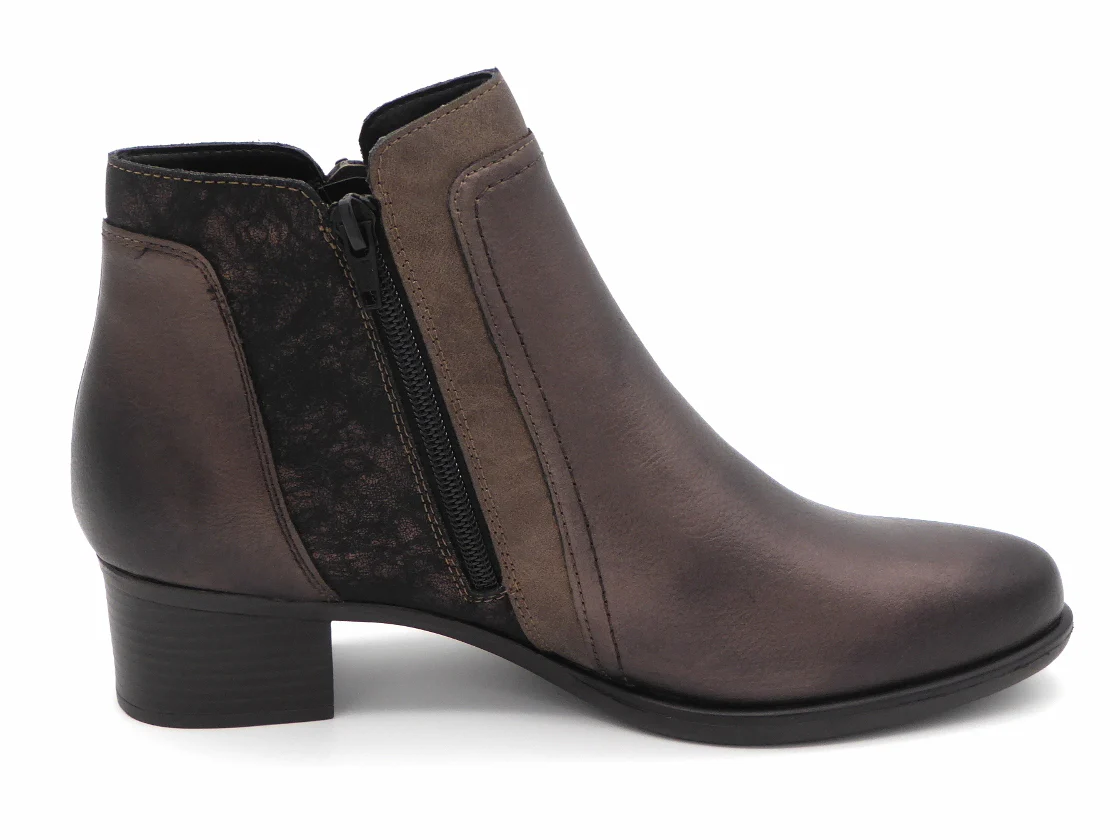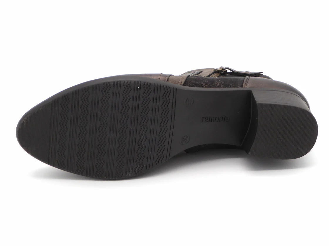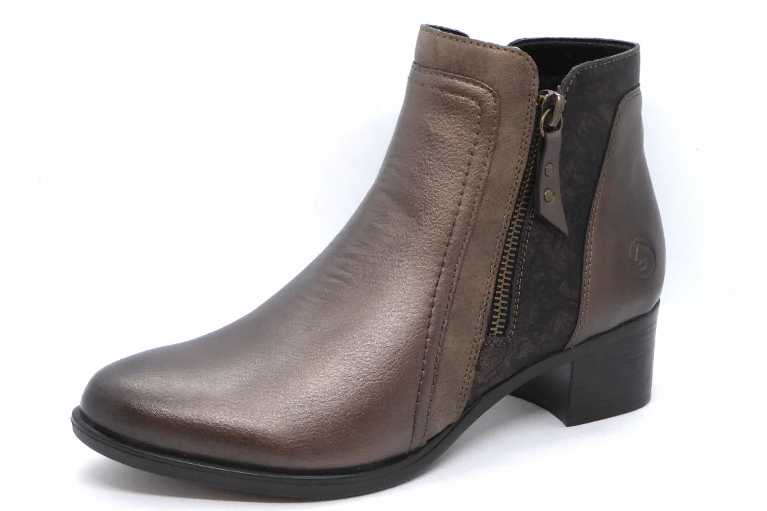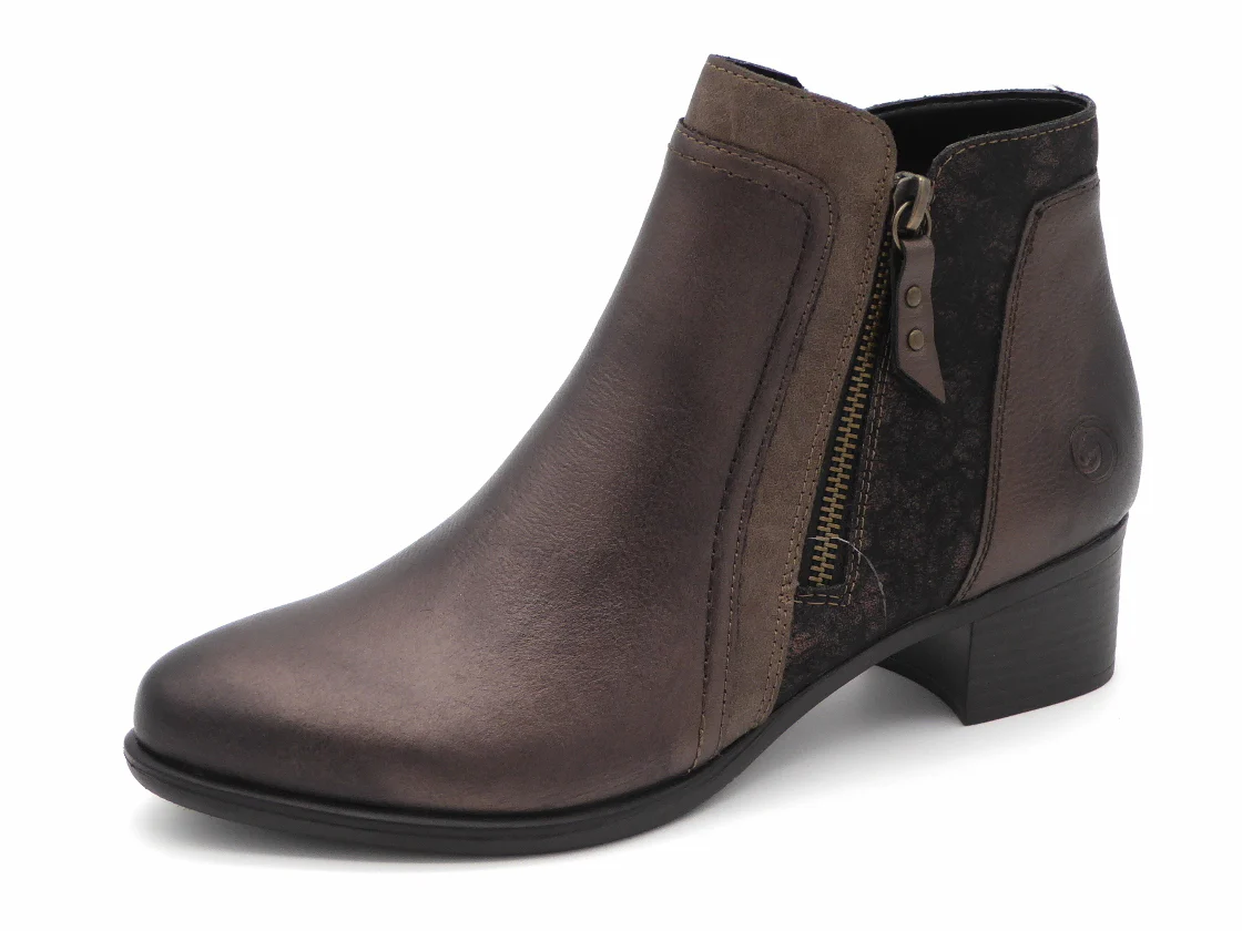 Remonte enkellaars uitgevoerd in een combinatie van brons metallic leer en imitatieleer. Dit model heeft 2 ritsen voor een gemakkelijke instap. De voering is van textiel. Het zachte uitneembare voetbed kan, indien nodig, vervangen worden door losse inlegzolen. De TR-zool heeft een hakhoogte is 4 cm.