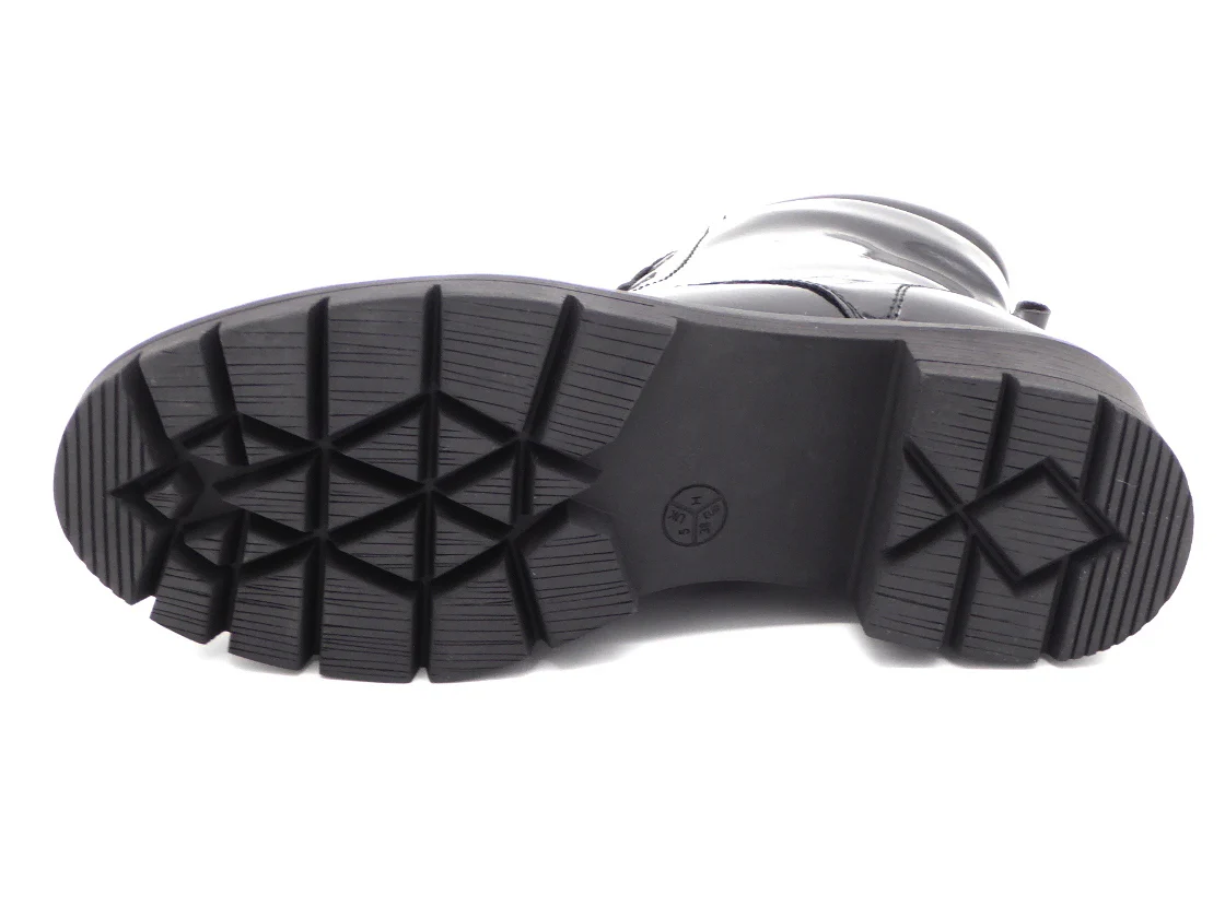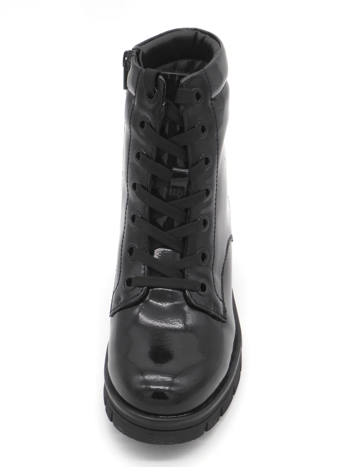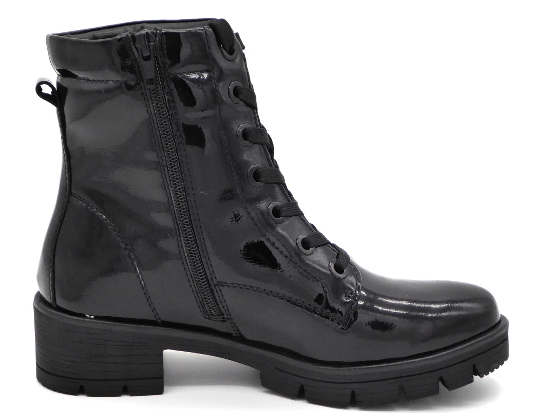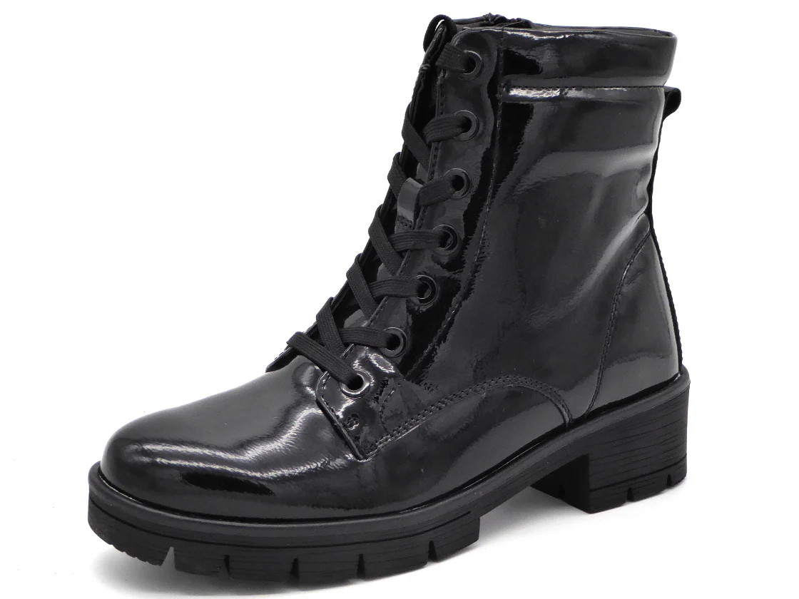 Jana veterboot uit de Softline serie. Het bovenwerk is gemaakt van mooi zwart lak imitatieleer. De binnenkant van de schoen is uitgerust met zacht textiel. De rubberen profiel zool geeft je een uitstekende grip. De praktische ritssluiting zorgt ervoor dat de schoen gemakkelijk aan- en uit kan worden getrokken. De schoen valt normaal en heeft een sportieve profiel loopzool met een hakhoogte van 45 mm. Dit model is gemaakt in een iets bredere leest wijdt H en is vervaardigd met 100% vegan, PFI-gecertificeerde materialen voor een duurzame keuze.