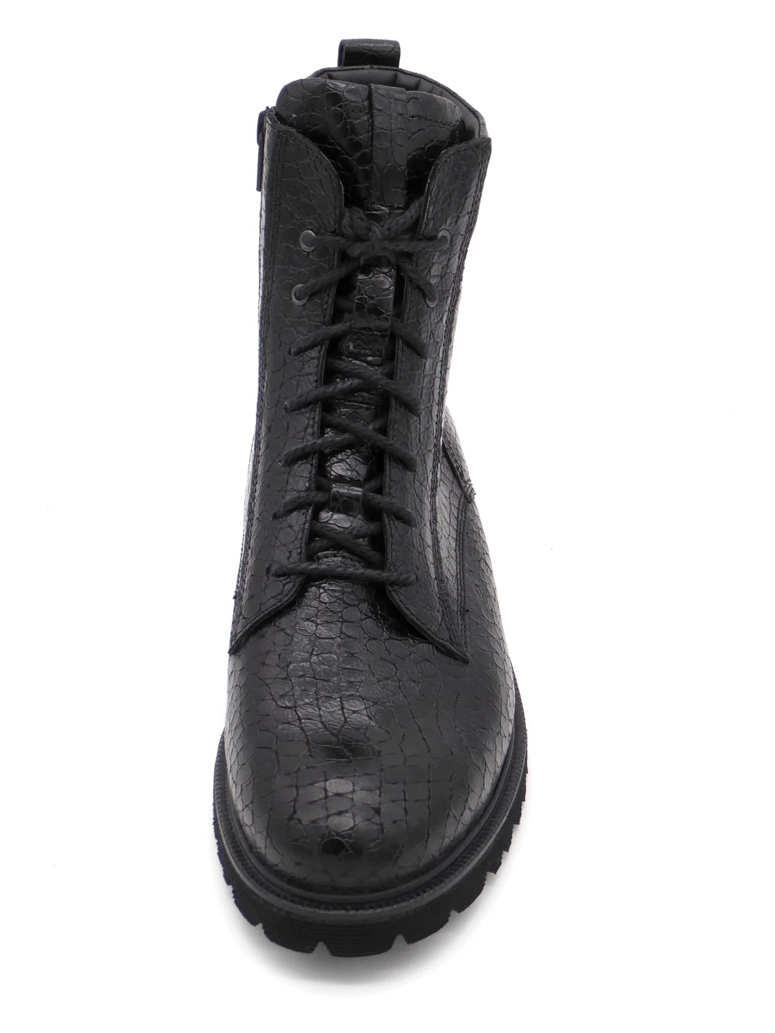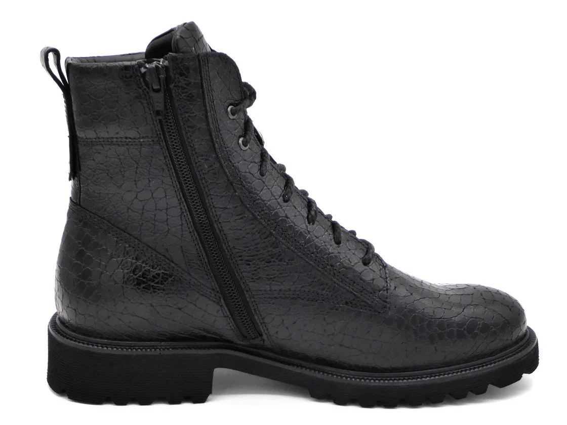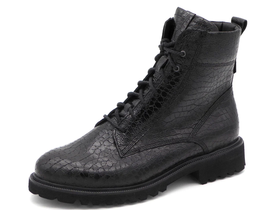 Durea comfortabele modische leren veterboot, uitgevoerd in printleer. Dit model heeft veters in combinatie met een ritssluiting aan de binnenzijde, zo trek je schoen gemakkelijk aan en uit. Het voetbed is uitneembaar, dus ook geschikt voor eigen (steun)zolen. De schoen is gemaakt in een brede leest wijdte K (leest 188). De massief ogende, maar lichtgewicht EVA zool is gemaakt van anti-slip en uitgerust met extra dempend vermogen. De loopzool is voorzien van een grof profiel.