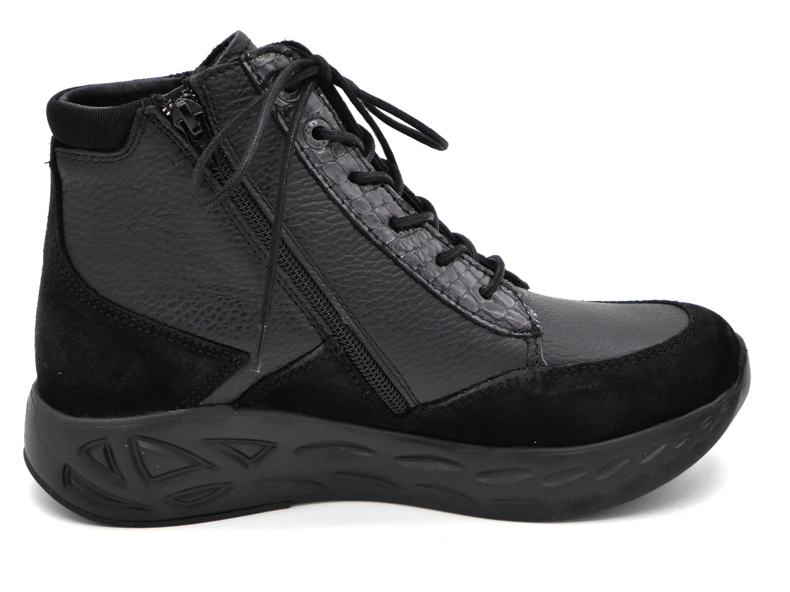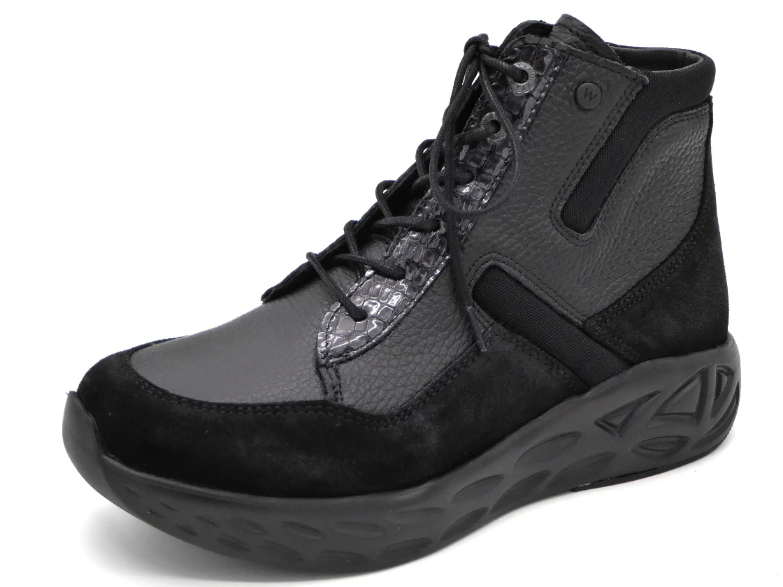 Deze stoere comfortabele Wolky dames veterboot, model Leap heeft een bovenwerk van zacht soepel leer. Naast de veters heeft dit model ook een rits om het in- en uitstappen te versoepelen en is dus optimaal verstelbaar. Aan de bovenkant zie je een verdikking, de polsterrand, dit is een soort kussentje voor je enkel dat het snijden van de rand in je huid voorkomt. De schoen is volledig leer gevoerd en heeft een uitneembaar voetbed dat, indien nodig, vervangen kan worden door losse inlegzolen. De zool is licht en superdempend; ideaal voor vrouwen met hielspoor en eigenlijk voor iedereen want je krijgt zo minder snel vermoeide voeten. Voor loopt de zool iets op. Die oplopende neus zie je veel bij Wolky en die is er niet voor niets, want hierdoor wikkel je je voeten moeiteloos af en dat maakt lopen makkelijker. Nog een pluspunt: de Leap is gemaakt op een ronde leest, de tenen hebben zo lekker veel ruimte. Kortom, wij hebben er alles aan gedaan om de Leap jouw ideale winterschoen te laten zijn!