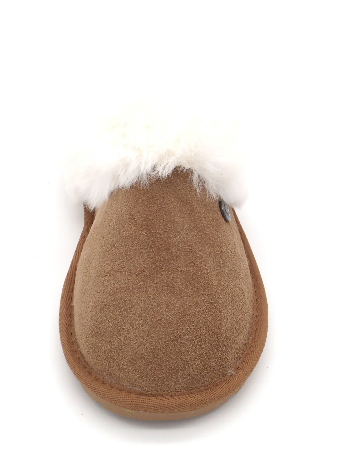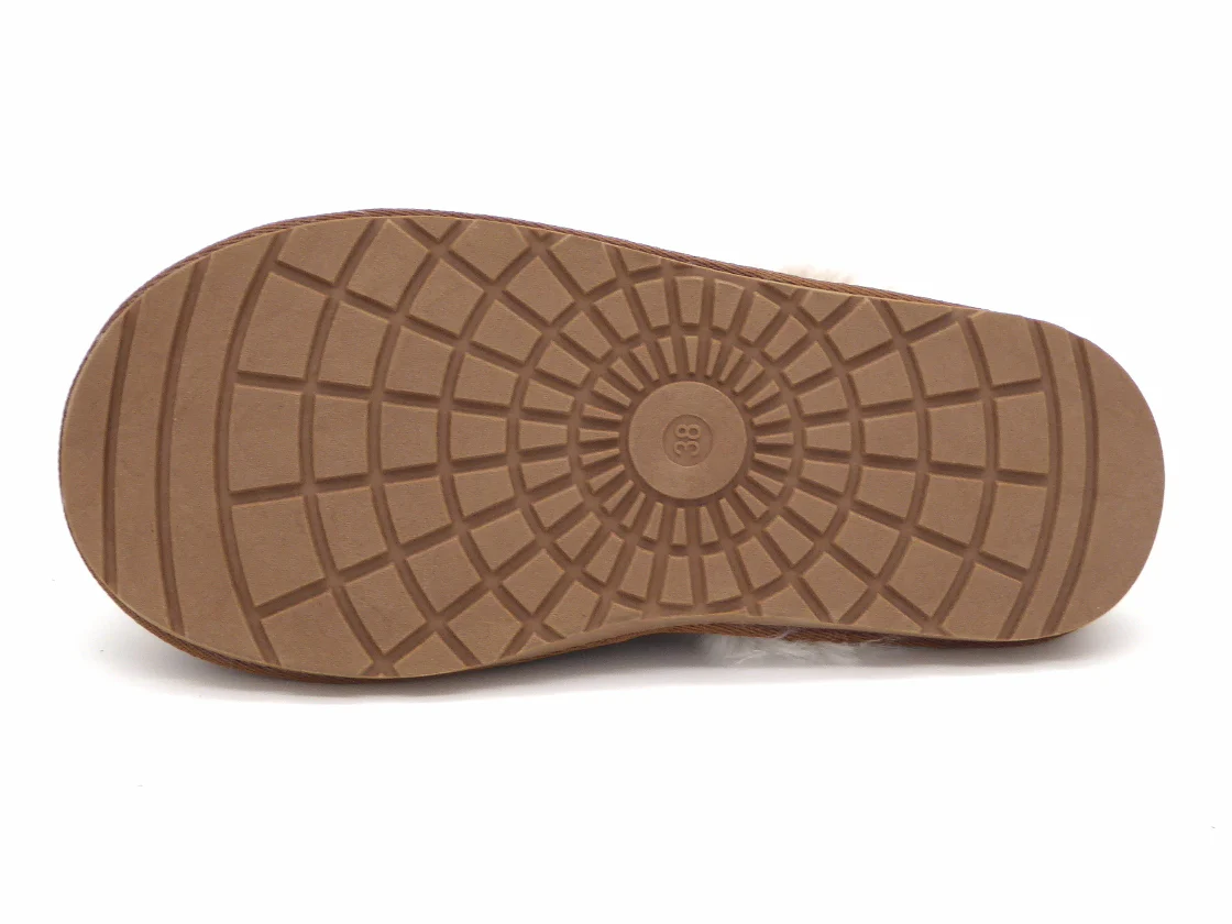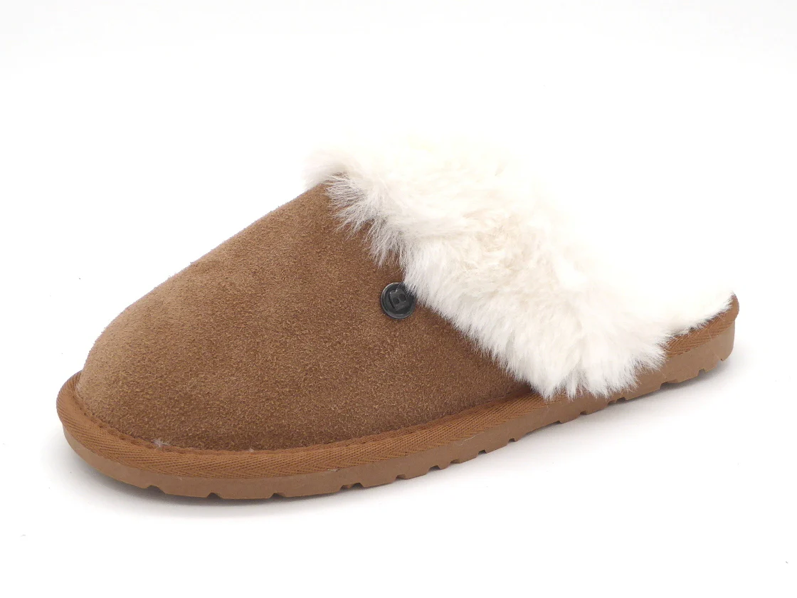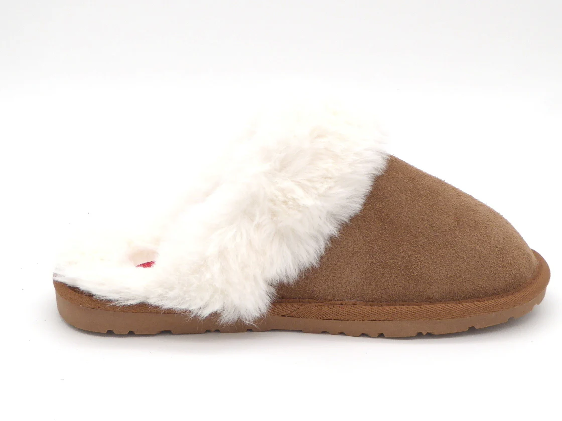 Blenzo dames pantoffel muil met een bovenwerk van suède met imitatie bontrand. De warme voering is van teddy. De stevige TPR-zool kan binnen en buiten gebruikt worden en is behoorlijk antislip.