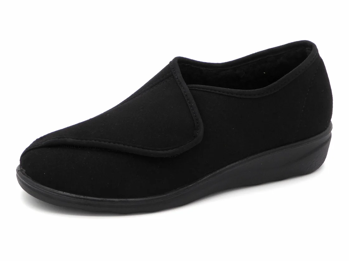Josef Seibel model Nice 105 is een warme gesloten dames pantoffel met een bovenwerk van zacht suèdine (textiel). De klittenband sluiting over de wreef kan tot aan de tenen worden opengemaakt voor een gemakkelijke instap en goede sluiting. De voering is van warm gevoerde pluche. De flexibele en duurzame PU-zool draagt bij aan een fijn loopcomfort. De pantoffel heeft een vast voetbed en is gemaakt in een iets bredere leest wijdte H.