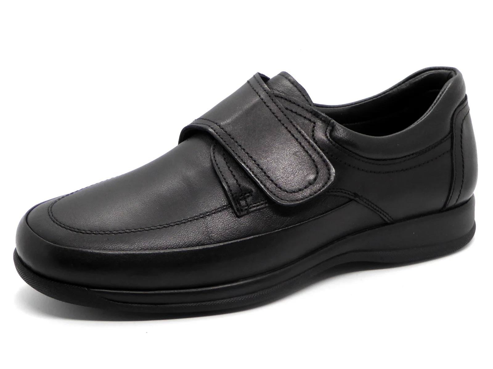 Q Fit comfortabele heren klittenbandschoen model Bonn met 1 klittenbandsluiting, uitgevoerd in zacht leer. De schoen heeft ruimte voor de tenen door het comfortabel stretchmateriaal en is dus ideaal voor mensen met voetproblemen (hallux, hamertenen, artrose, gezwollen voeten, diabetes enz.). De uitneembare hoogwaardige, 2-voudige inlegzool zorgt voor een zacht loopcomfort met zachte bekleding en katoenweefsel. Middenstuk en hiel (binnenkant) is van microvelours voor een aangenaam draaggevoel. Verder heeft deze schoen een lichte, schokdempende en doorlopende antislipzool met Air Comfort System.