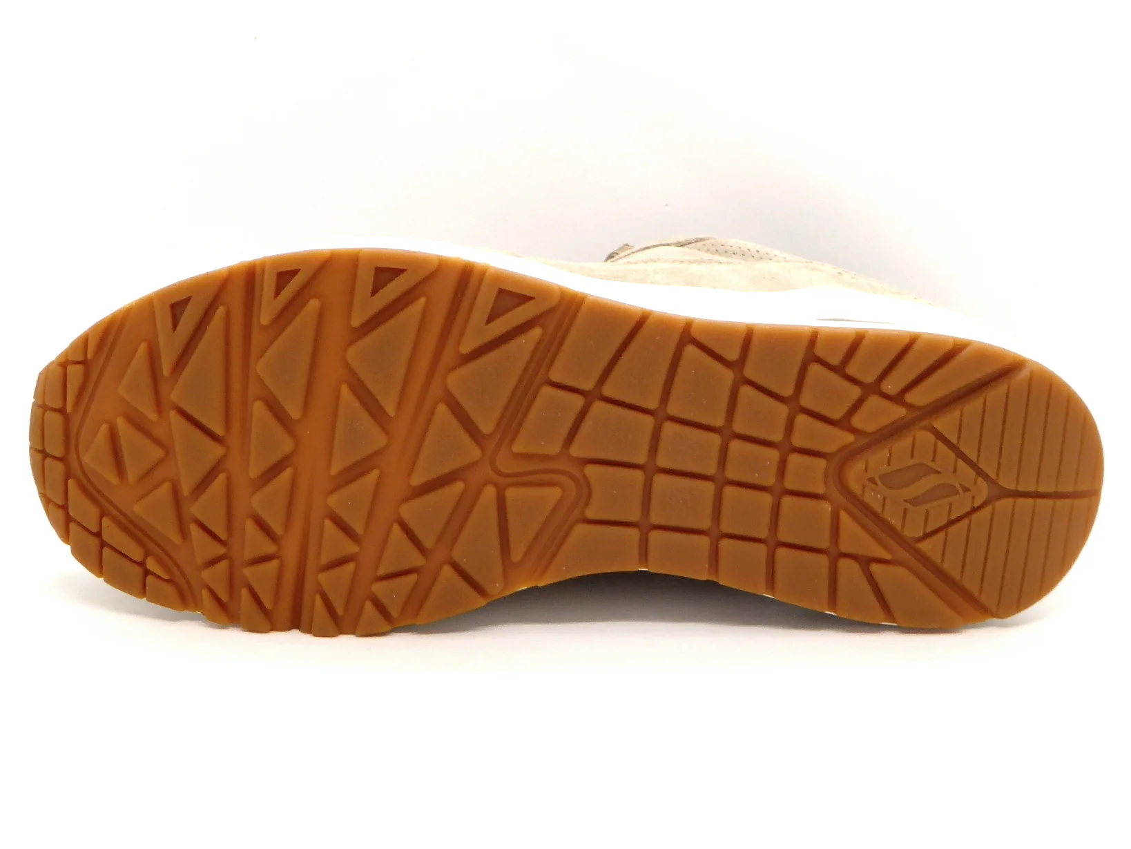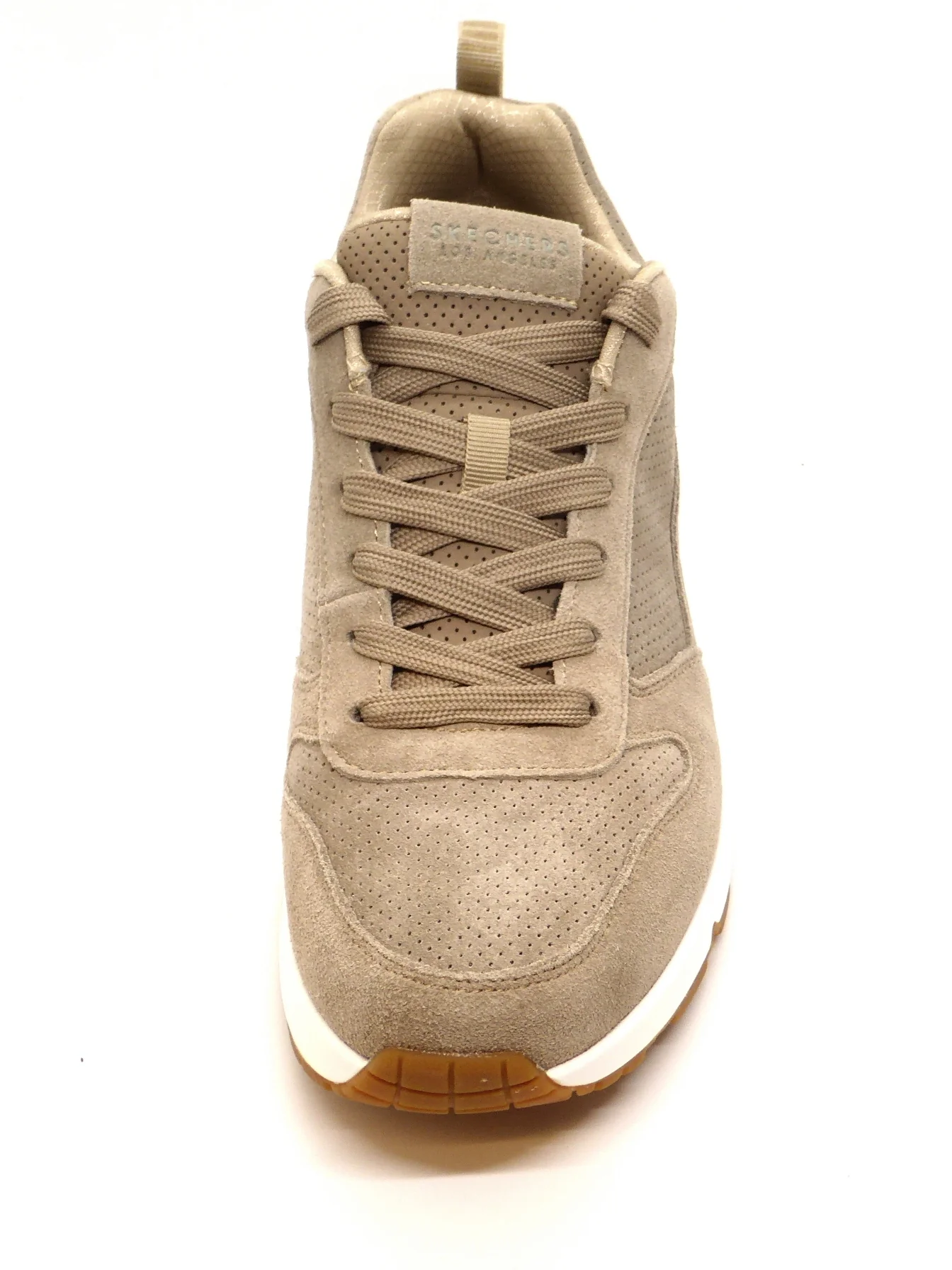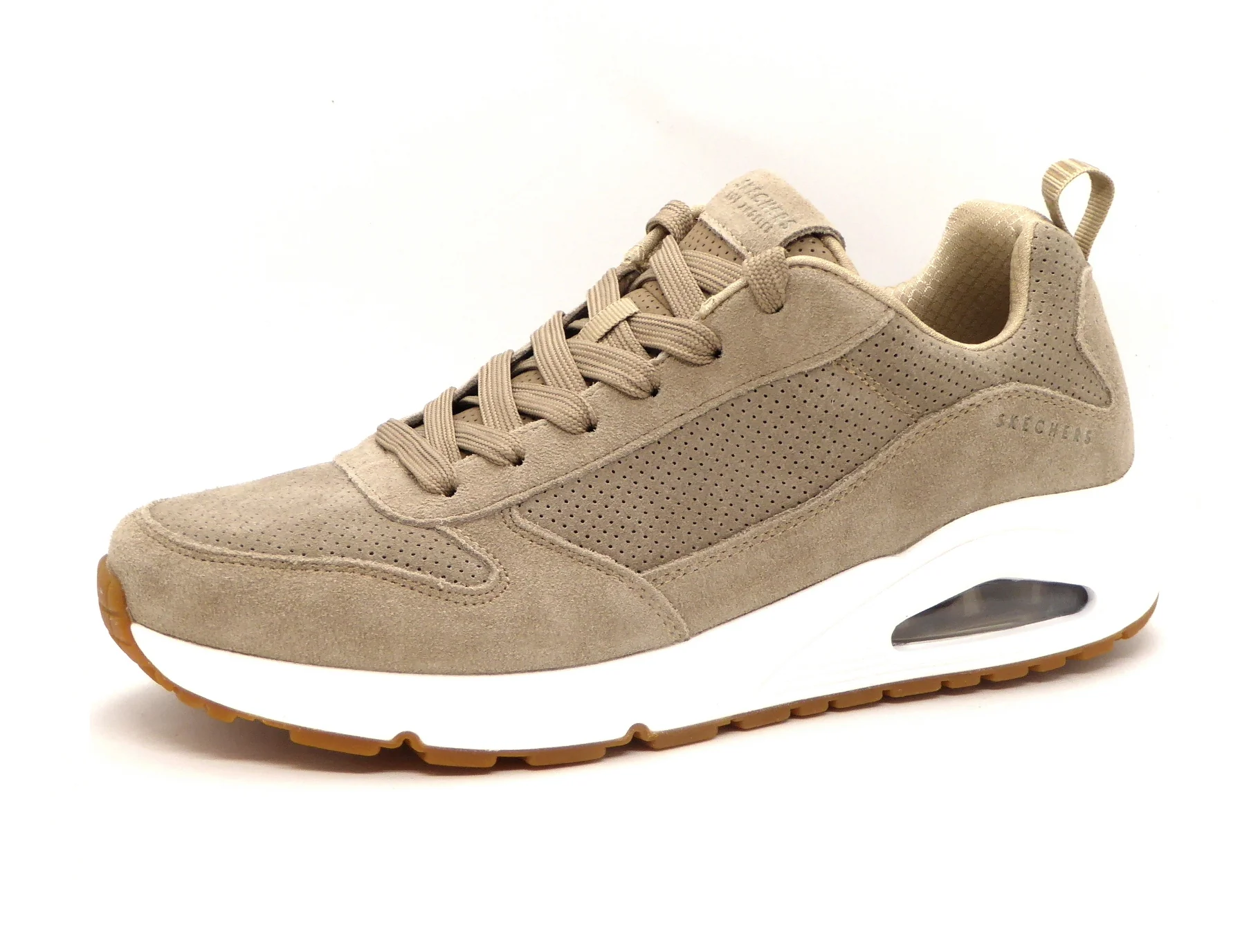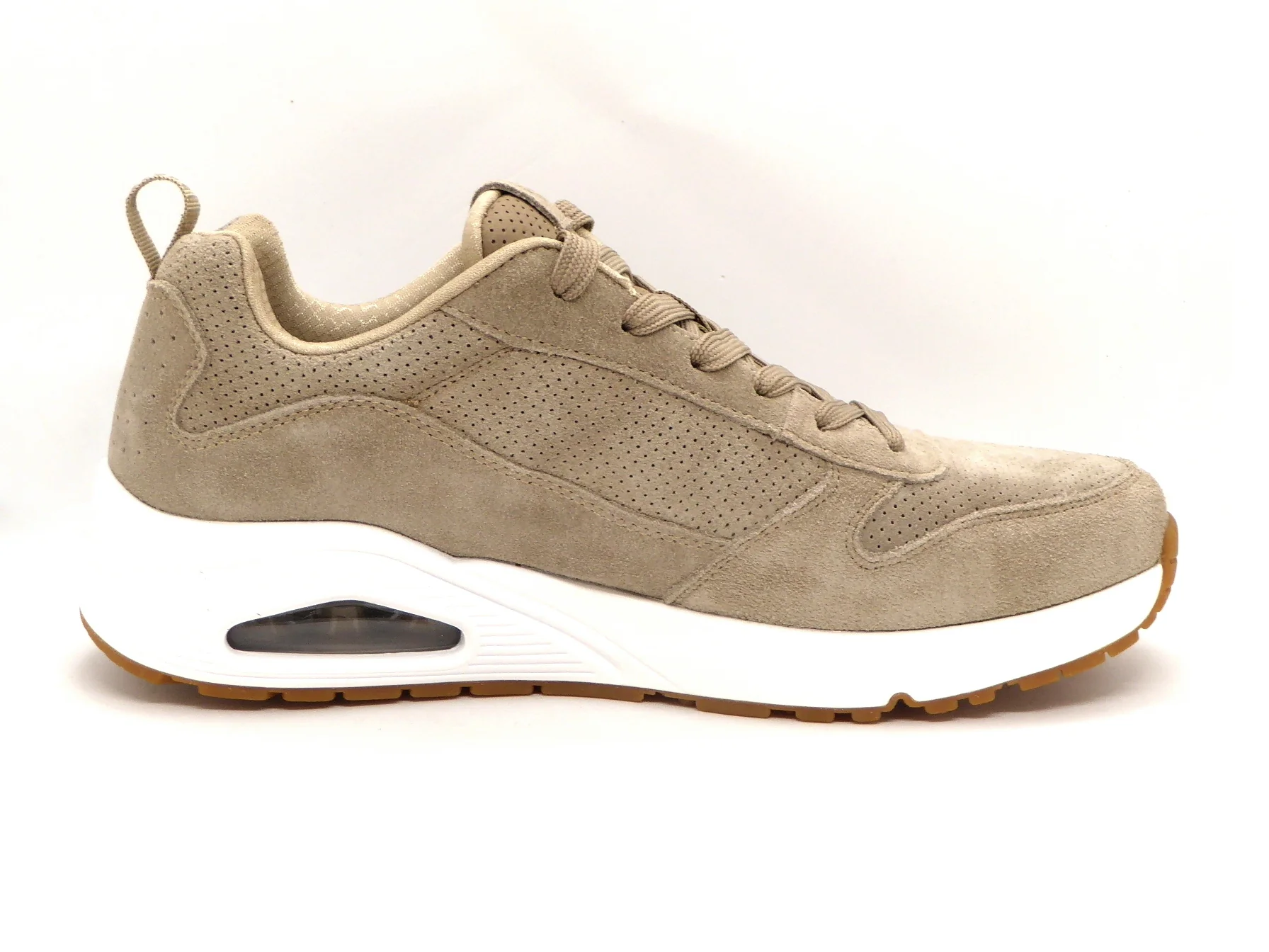 Sportieve taupekleurige Skechers Uno Stand On Air sneaker, gemaakt van suèdeleer. De comfortabele binnenzool en de voering zijn gemaakt van textiel. De sneaker wordt gesloten door middel van een vetersluiting. Dankzij het dempende voetbed met Air-Cooled Memory Foam loopt de veterschoen extra comfortabel. Ook heeft dit voetbed een ventilerende werking. De perforaties op het bovenwerk zorgen voor een verkoelend effect. De tussenzool is voorzien van een een zichtbare Skech-Air®-airbag en biedt daardoor uitstekende ondersteuning en schokdemping bij iedere stap. De rubberen zool is flexibel en biedt veel grip. De Skechers Uno Stand On Air sneaker heeft een vast voetbed.
