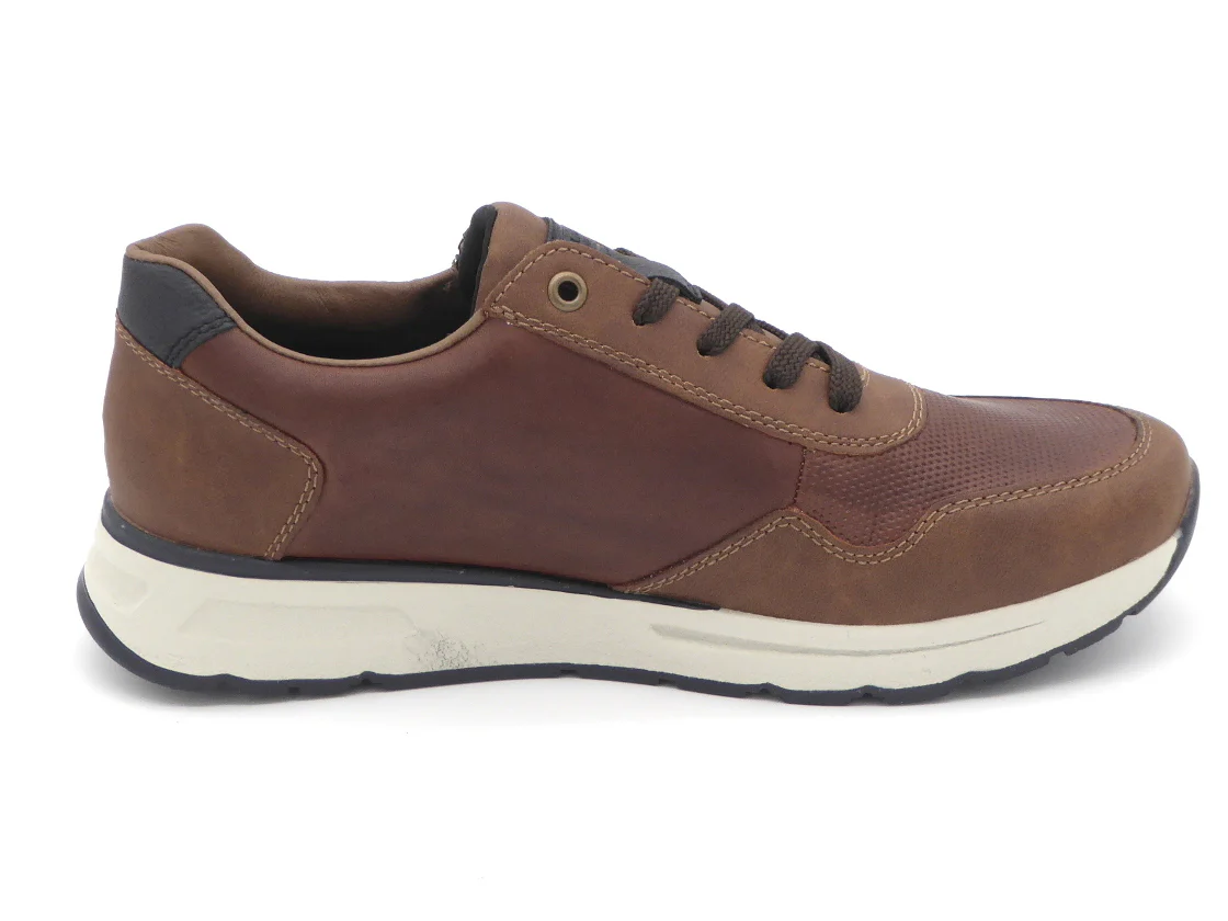 Rieker heren sneaker uitgevoerd in nubuckleer met sierstiksels en kleurige accenten. De sneaker heeft een vetersluiting én een rits, voor een makkelijke instap. Zowel de voering als de comfortabele binnenzool bestaat uit textiel. Het met leer beklede uitneembare voetbed kan, indien nodig, vervangen worden door losse inlegzolen. Door het ingebouwde anti-stress systeem heeft deze schoen een uitstekende comfort, flexibiliteit en schokdemping. De opvallende witte zool is gemaakt van rubber en heeft een dikte van 2 centimeter.