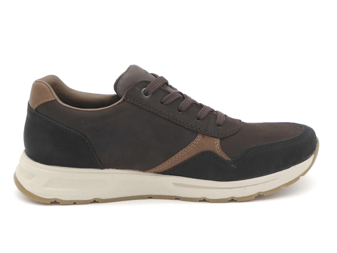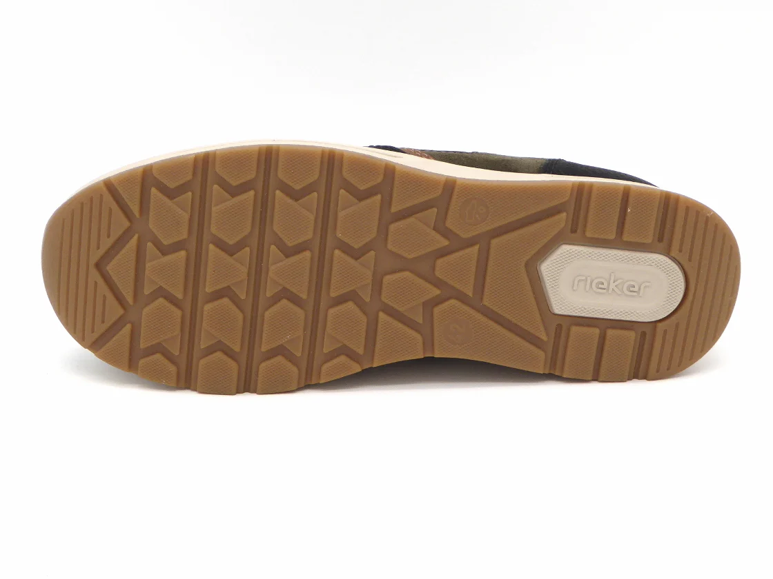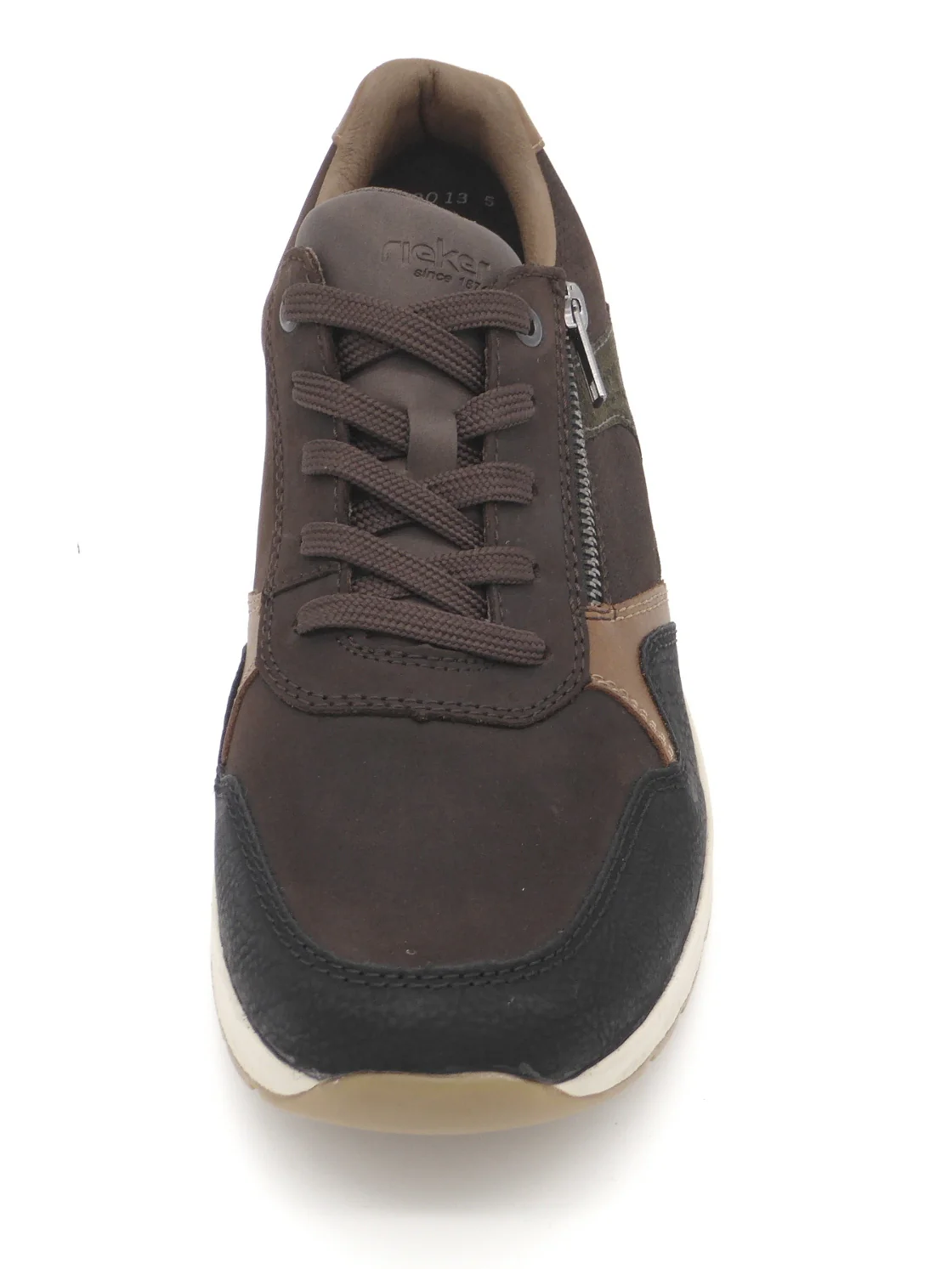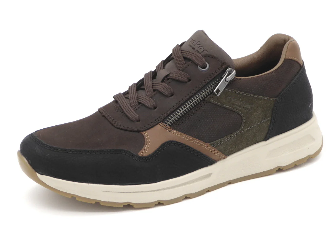 Rieker bruine sneaker uitgevoerd in een combinatie van leer en synthetisch materiaal en voorzien van sierstiksels en kleurige accenten. De sneaker heeft een vetersluiting én een rits, voor een makkelijke instap. Zowel de voering als de comfortabele binnenzool bestaat uit textiel. Het voetbed is uitneembaar, dus ook geschikt voor losse inlegzolen. Door het ingebouwde anti-stress systeem heeft deze schoen een uitstekende comfort, flexibiliteit en schokdemping. De profiel zool is gemaakt van rubber.