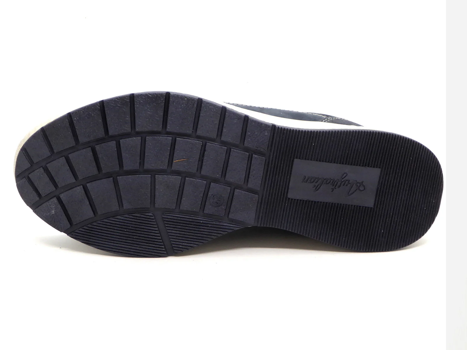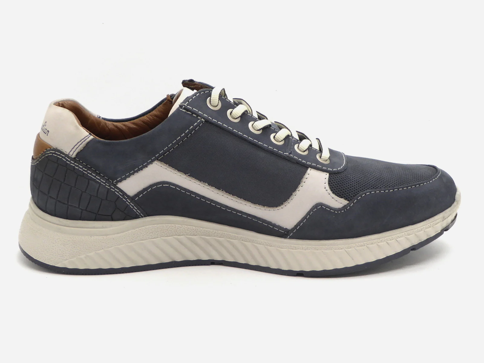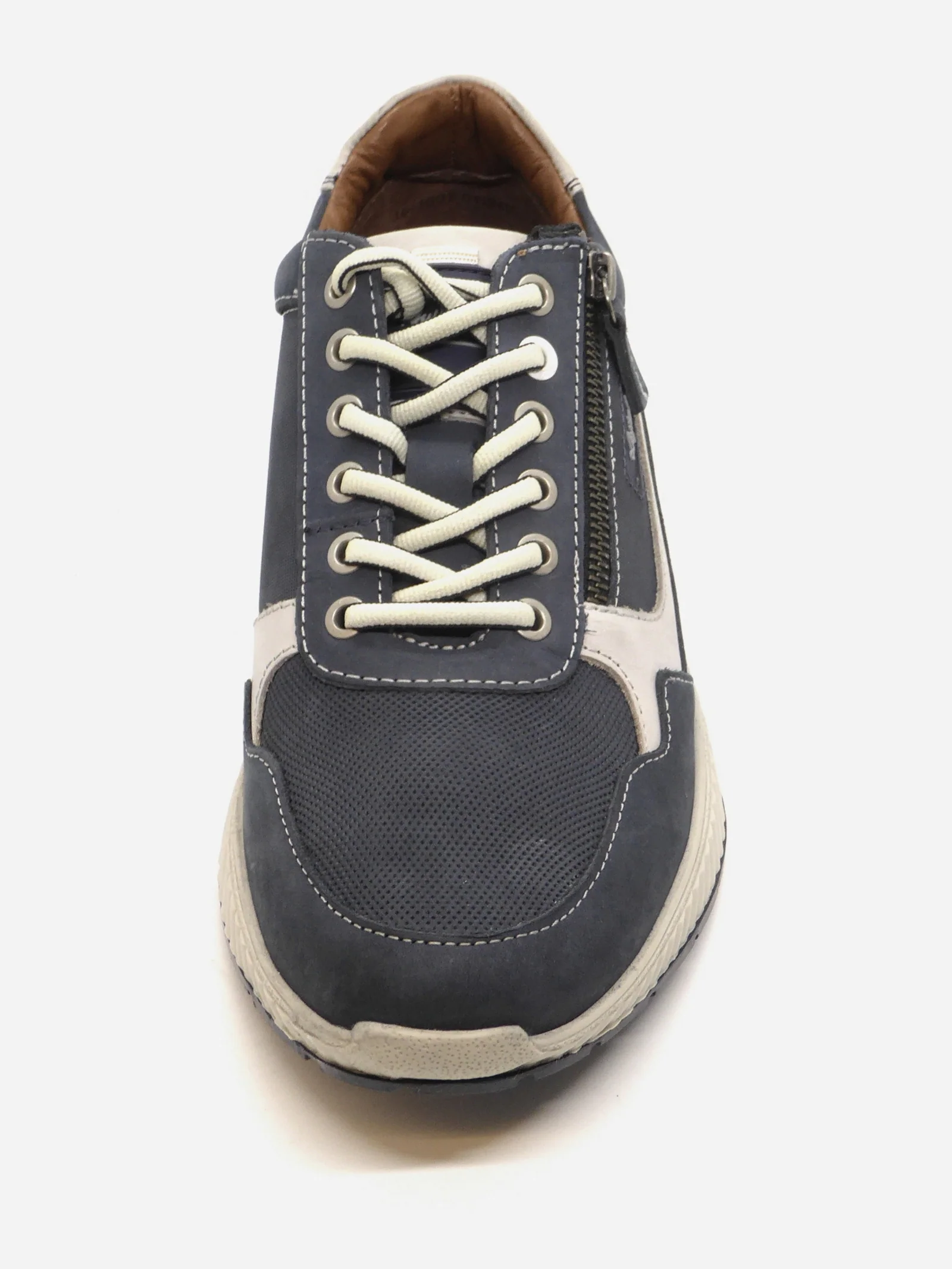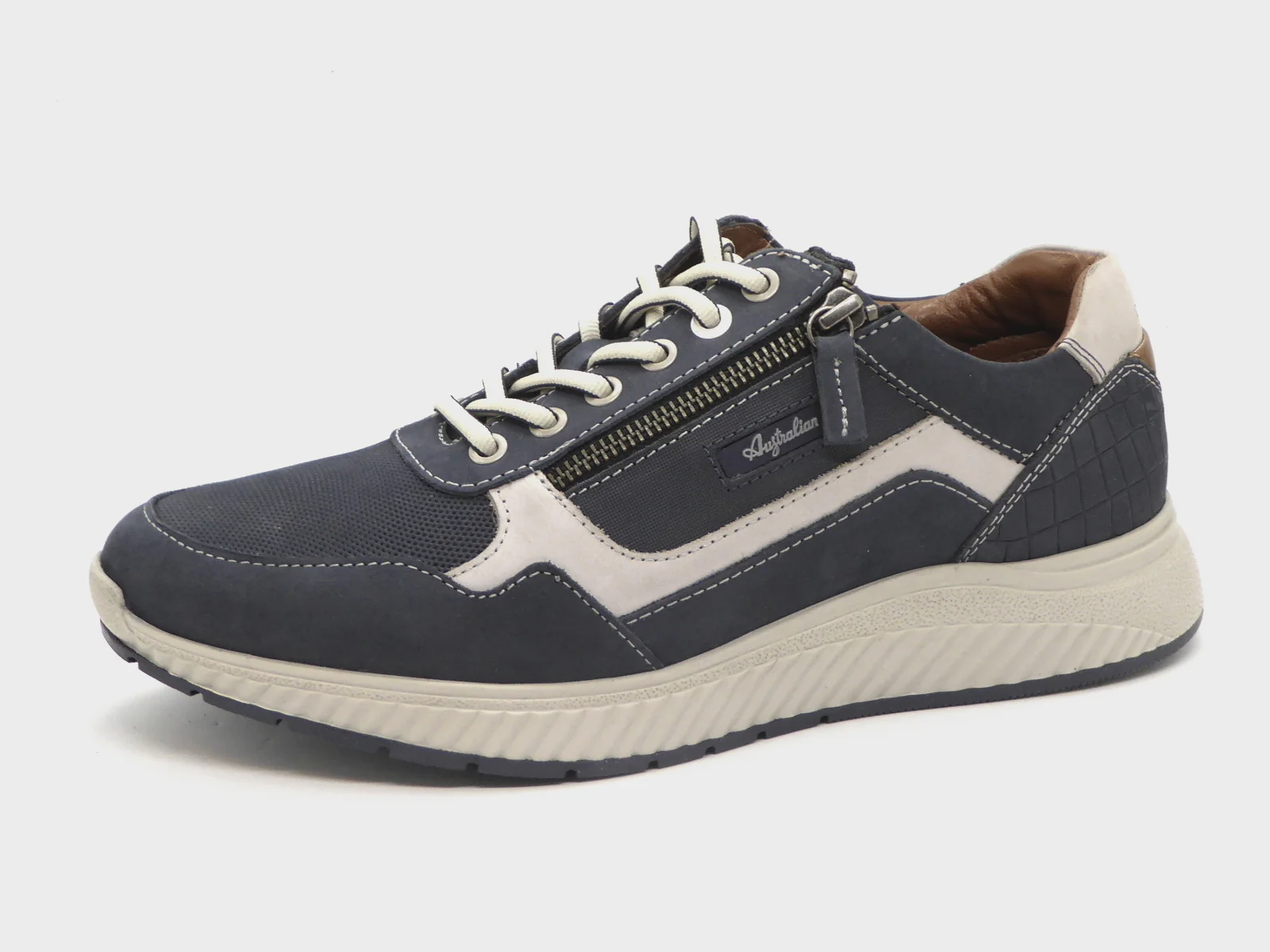 Sportieve sneaker van het merk Australian Footwear, model ‘Hatchback’ (15.1607.01-SD5), uitgevoerd in de kleur blauw. De schoen is gemaakt van leer met gekleurde details en merkopdrukken. Dankzij de vetersluiting en de rits trek je deze schoen moeiteloos aan. De voering is van leer met een uitneembaar voetbed, dus ook geschikt voor eigen (steun)zolen. De sportieve contrasterende buitenzool is gemaakt van thermoplastisch rubber, wat gekenmerkt wordt als een stevige en flexibele materiaalsoort.