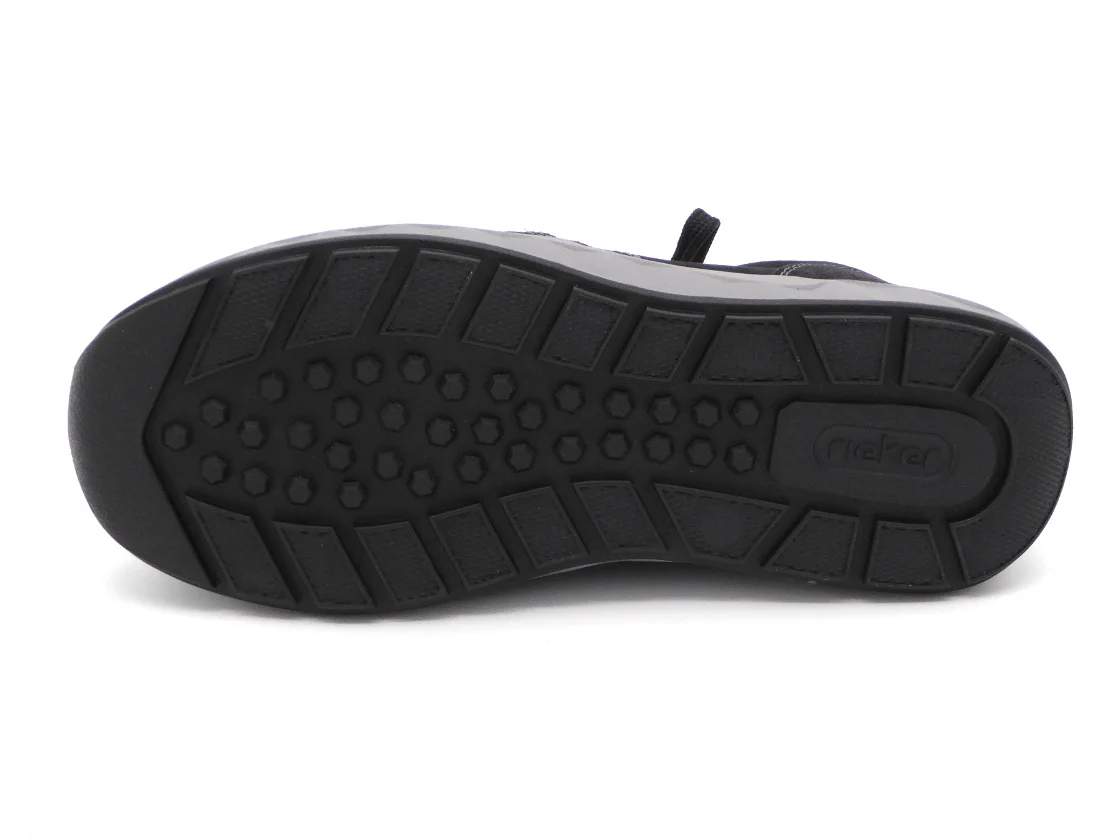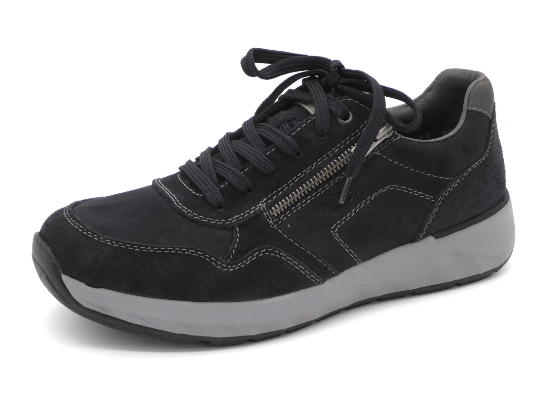 Rieker heren sneaker uitgevoerd in een combinatie van leer en synthetisch materiaal en voorzien van sierstiksels en kleurige accenten. De sneaker heeft een vetersluiting én een rits, voor een makkelijke instap. De voering is van zacht textiel met een uitneembare inlegzool dat, indien nodig, vervangen kan worden door losse inlegzolen. Door het ingebouwde anti-stress systeem heeft deze schoen een uitstekende comfort, flexibiliteit en schokdemping. De schoen heeft een soepele profiel loopzool van rubber en is gemaakt in een iets bredere leest wijdte H.