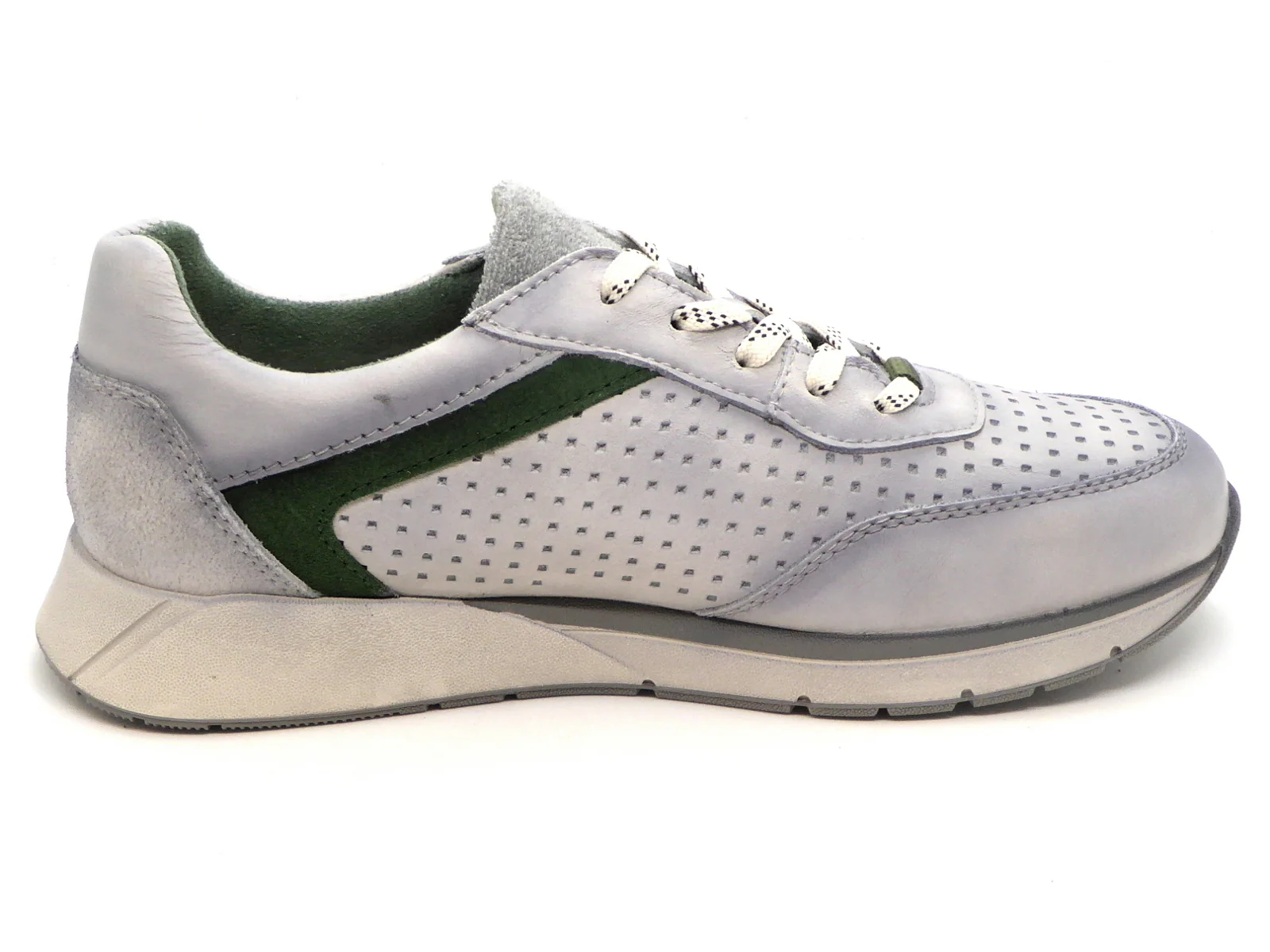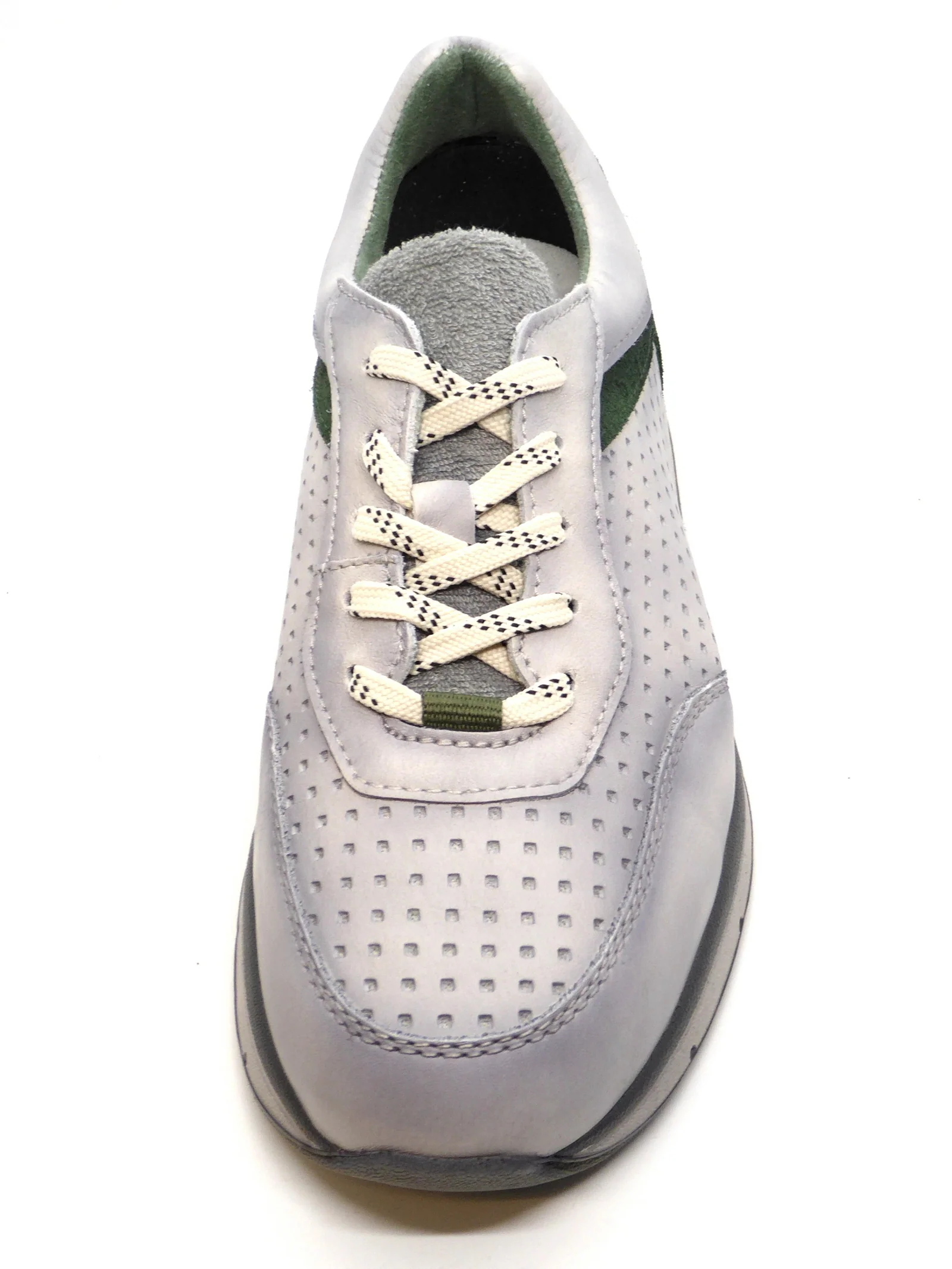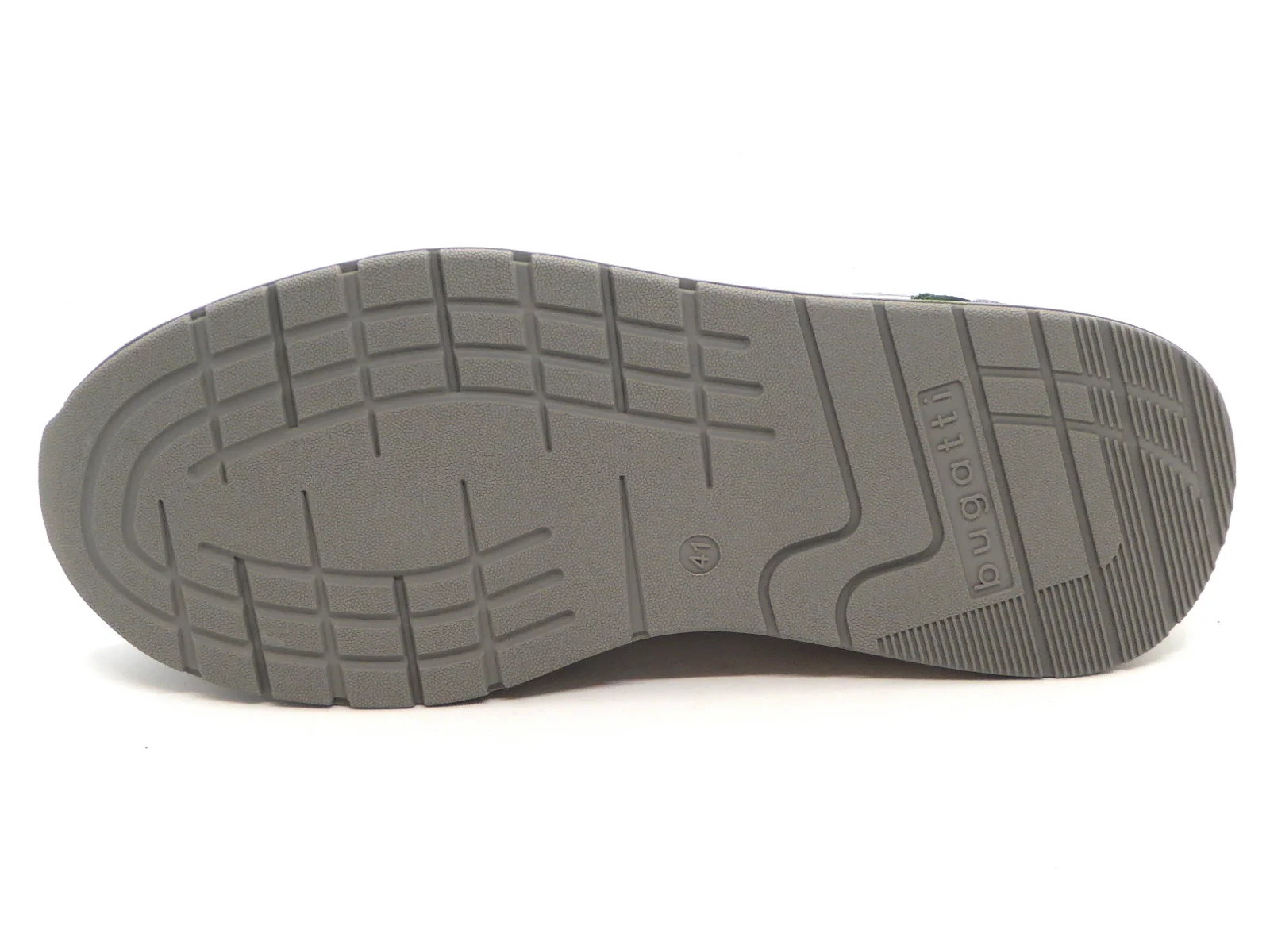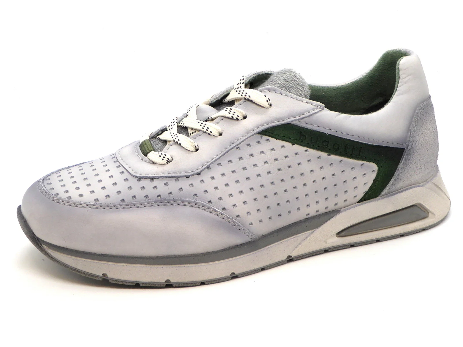 Bugatti sportieve heren sneaker in lichtgrijs used look en groen accent geeft jouw casual outfit een modern tintje dankzij de combinatie van texturen en het trendy design. Deze sneaker is uitgevoerd in leer en de voering is van textiel. Het voetbed is zacht en uitneembaar. De loopzool is van soepel rubber.