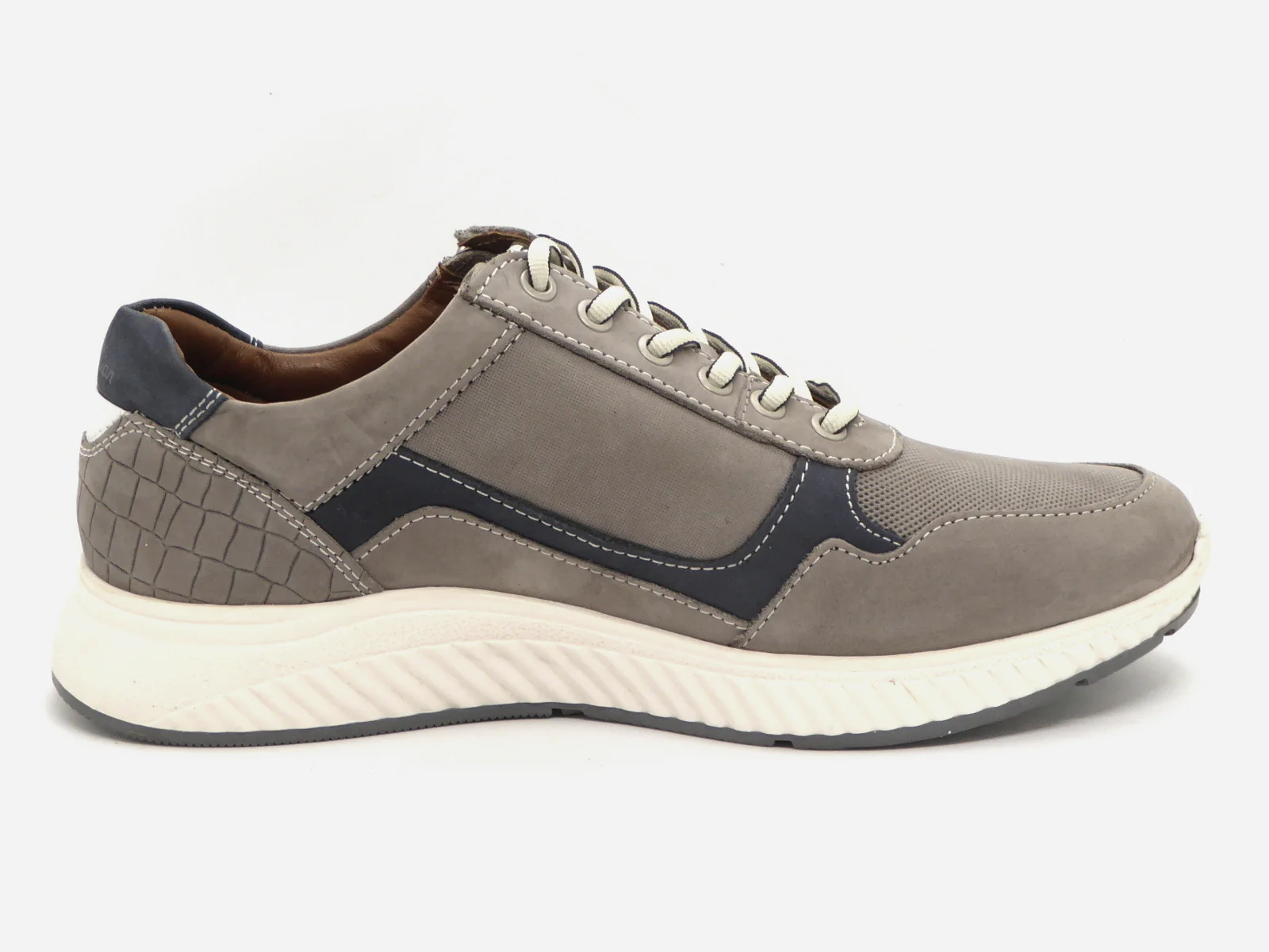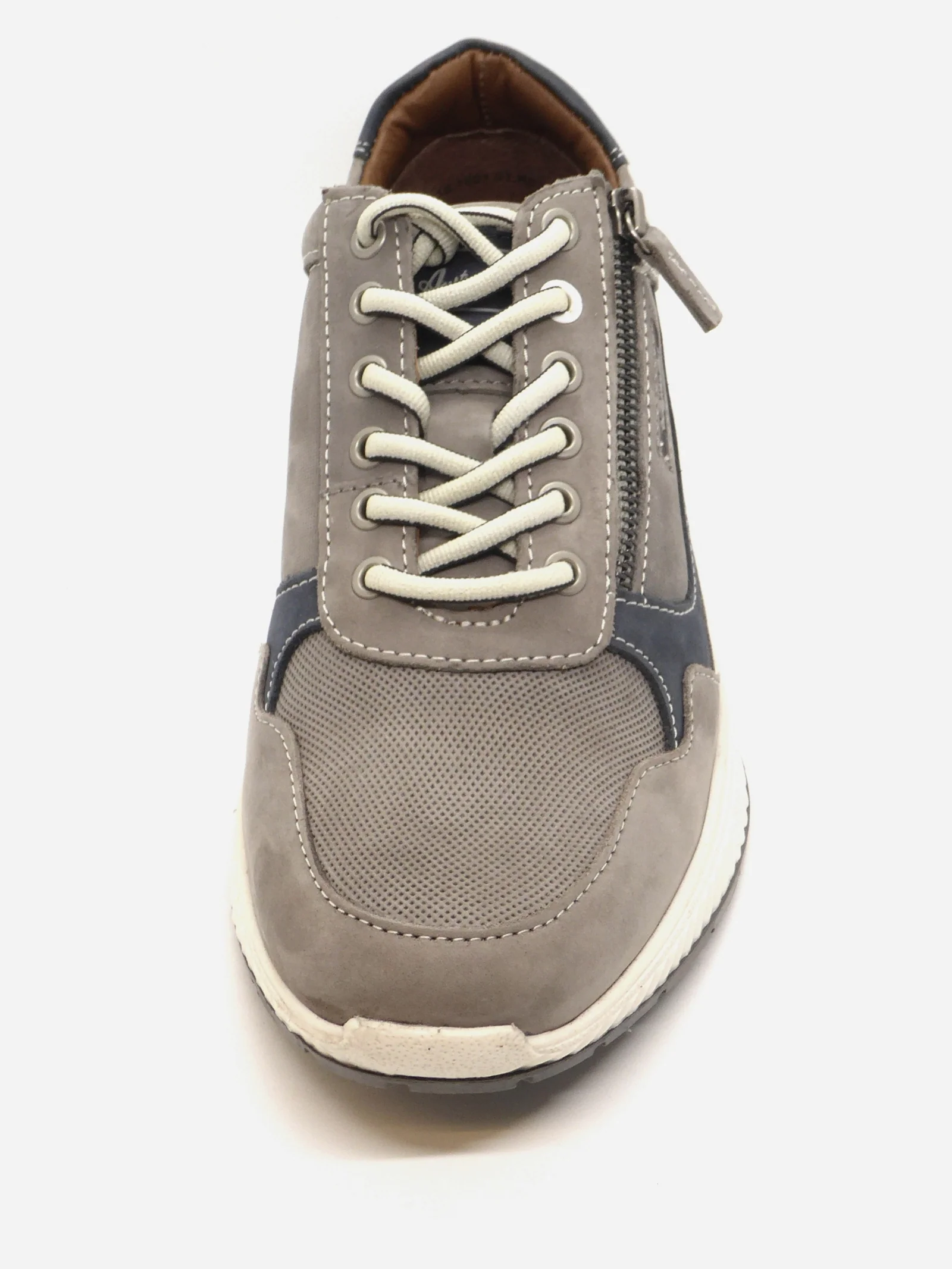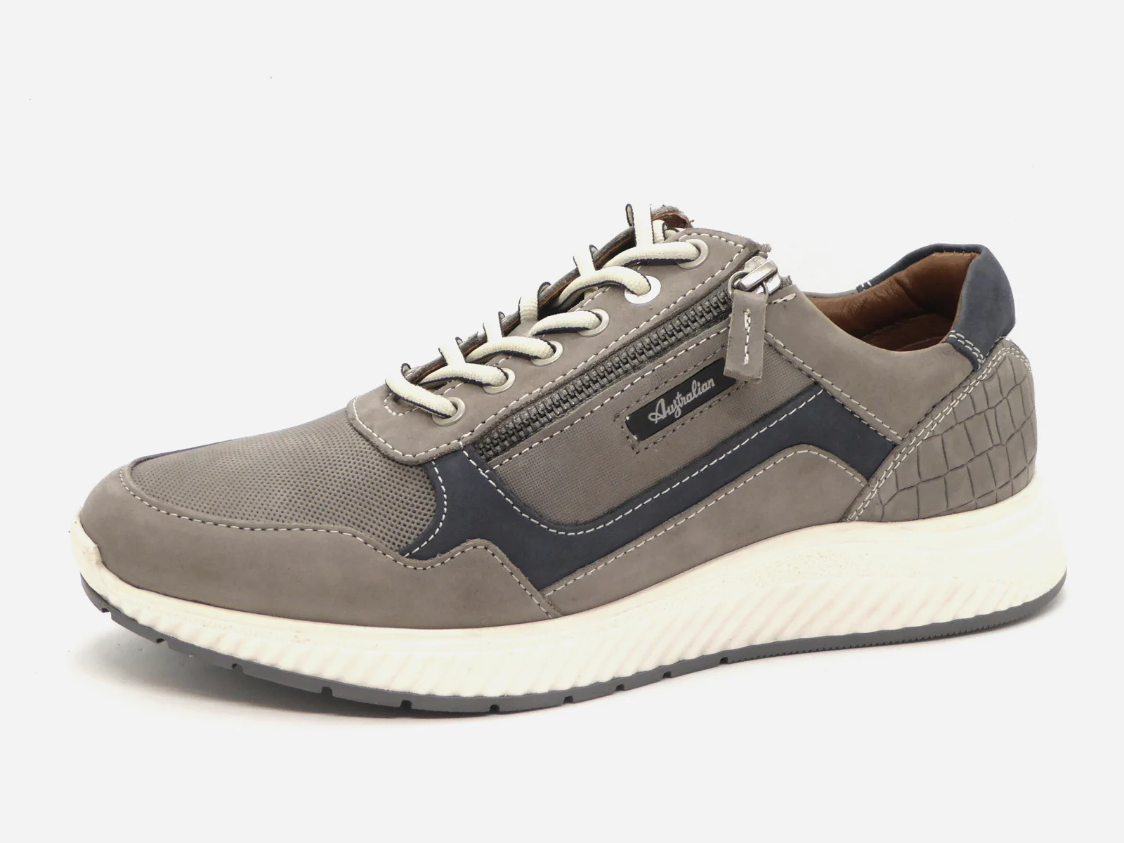 Sportieve sneaker van het merk Australian Footwear, model ‘Hatchback’ (15.1607.01-K07). De sneaker is uitgevoerd in grijs nubuckleer met blauwe details en verschillende structuren. Dankzij de vetersluiting en de rits trek je deze heren schoenen moeiteloos aan. De voering is van leer met een uitneembaar voetbed, dus ook geschikt voor eigen (steun)zolen. De sportieve contrasterende buitenzool is gemaakt van thermoplastisch rubber, wat gekenmerkt wordt als een stevige en flexibele materiaalsoort.