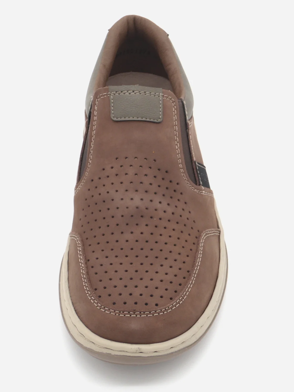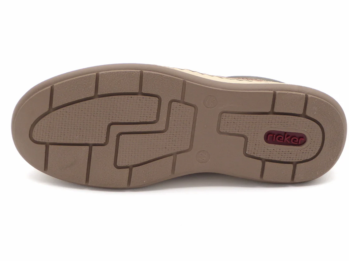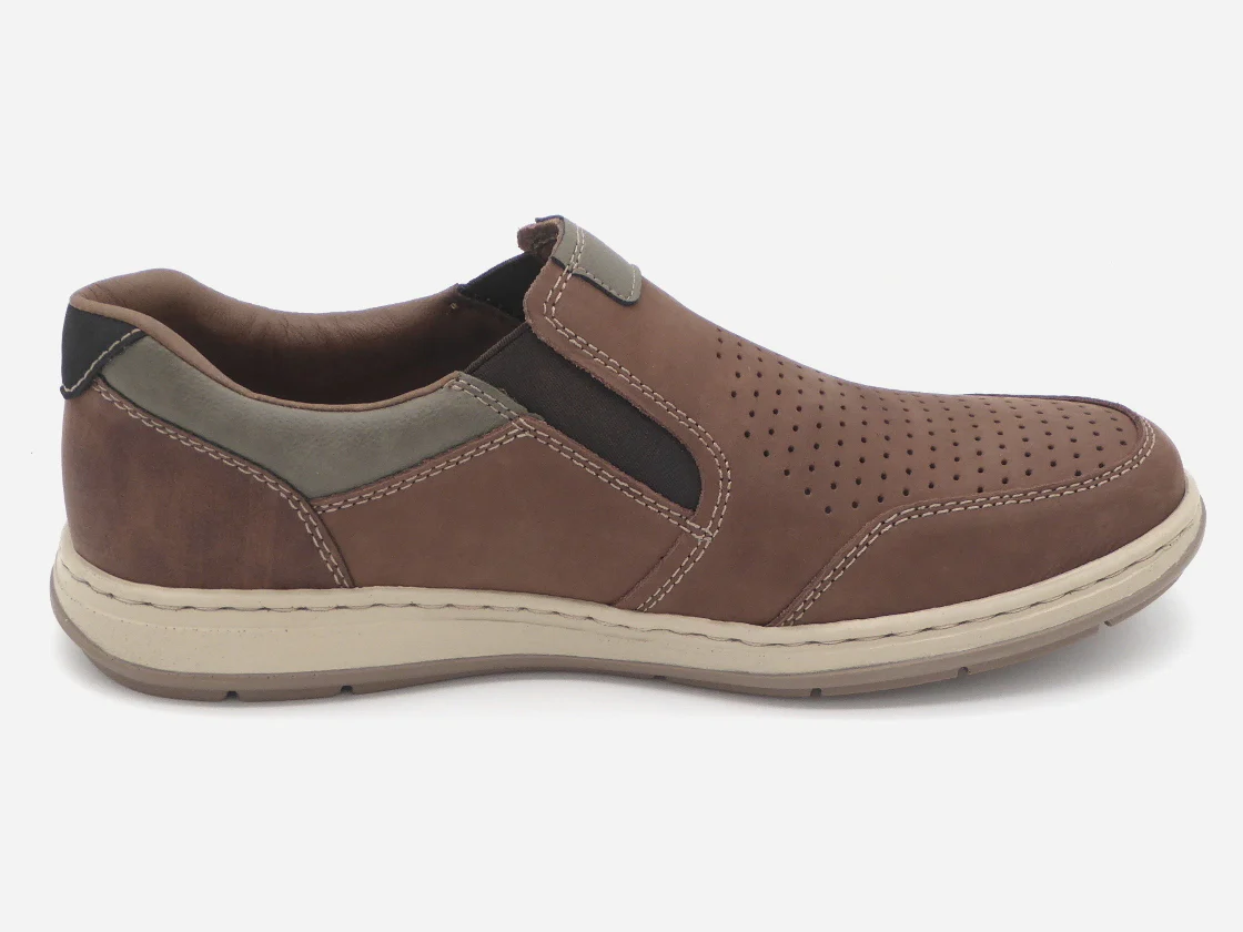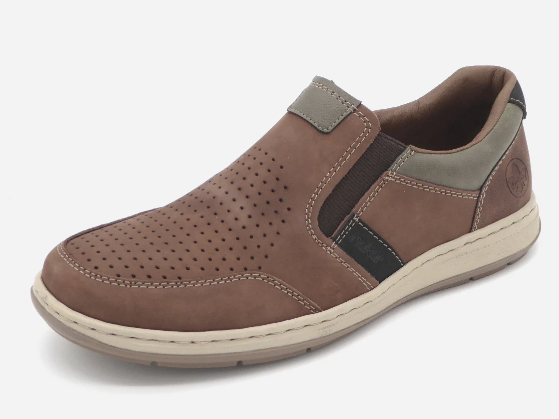 Rieker heren instapper uitgevoerd in bruin nubuckleer met blauw en groene accenten en een geperforeerd bovenwerk. Dit lichtgewicht model heeft elastieken op de wreef voor een makkelijke instap. Het voetbed is uitneembaar, dus ook geschikt voor losse inlegzolen. Door het ingebouwde anti-stress systeem heeft deze schoen een uitstekende comfort, flexibiliteit en schokdemping. Deze instapper is gemaakt in een brede leest wijdte H. De rubberen zool heeft een dikte van 2 centimeter.