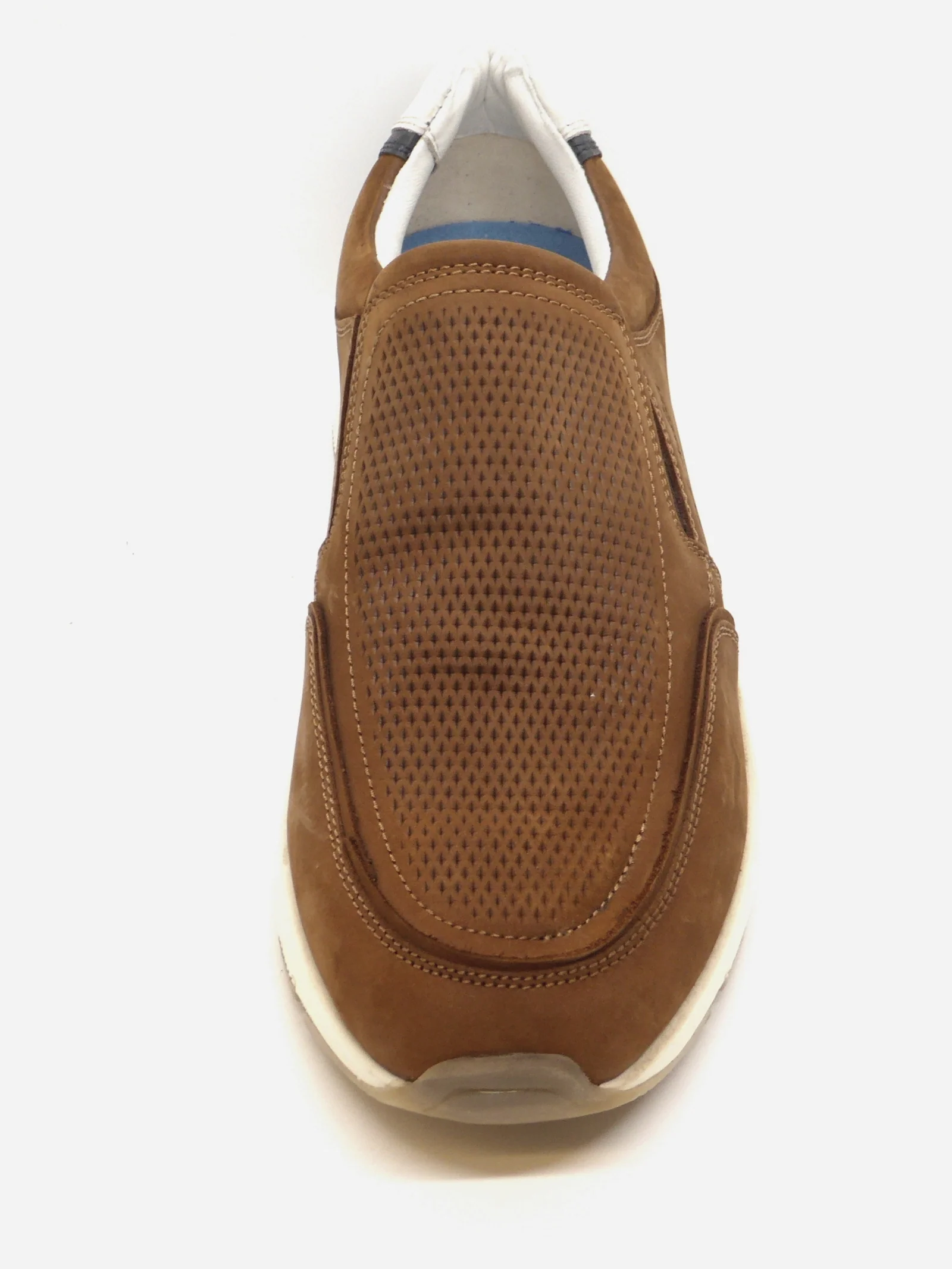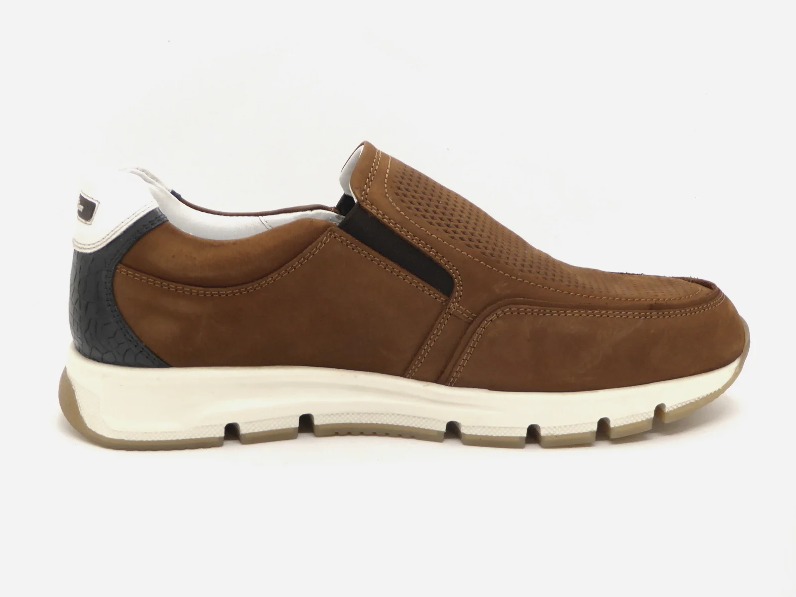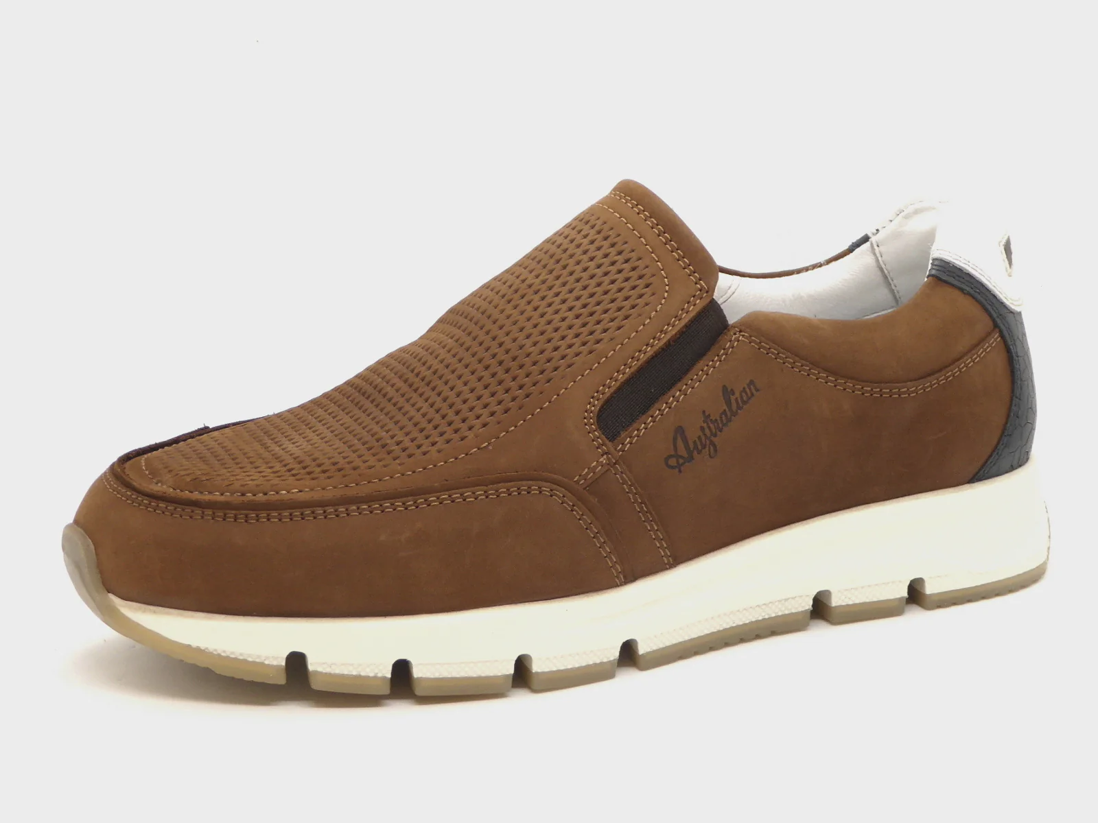 Sportieve instapper met elastieken inzet van van het merk Australian Footwear, model ´Eagle´ (15.1609.01-D21). De instapper is uitgevoerd in cognac nubuckleer met op de hiel donkerblauw croco en wit leer. De voering is van leer met een uitneembaar voetbed, dus ook geschikt voor eigen (steun)zolen. De schoen heeft een soepele off-white rubberzool met honingkleurig loopvlak.